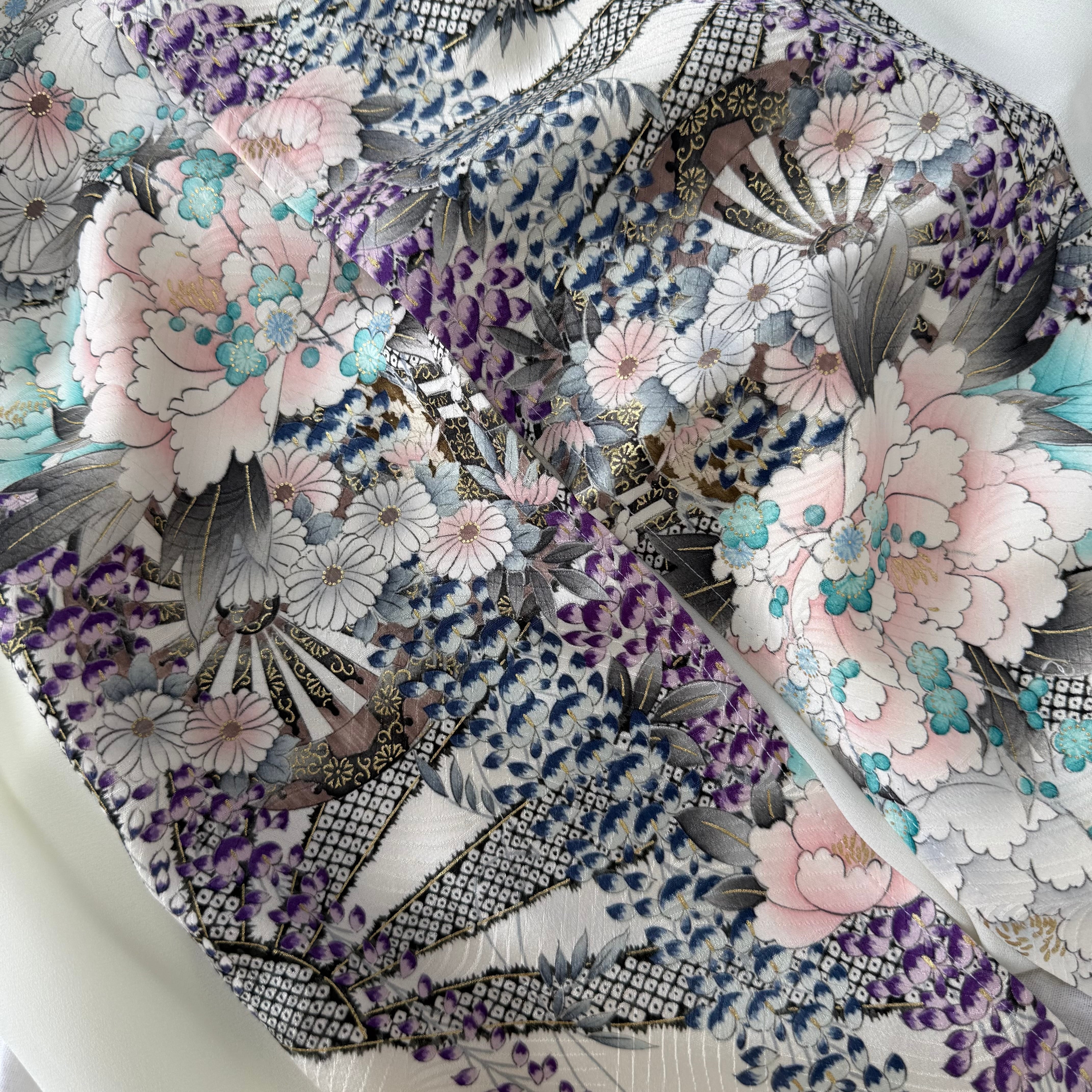 This hijab is made from a *furisode* kimono adorned with large wisteria, peony, and flower cart motifs, beautifully accented with gold leaf.