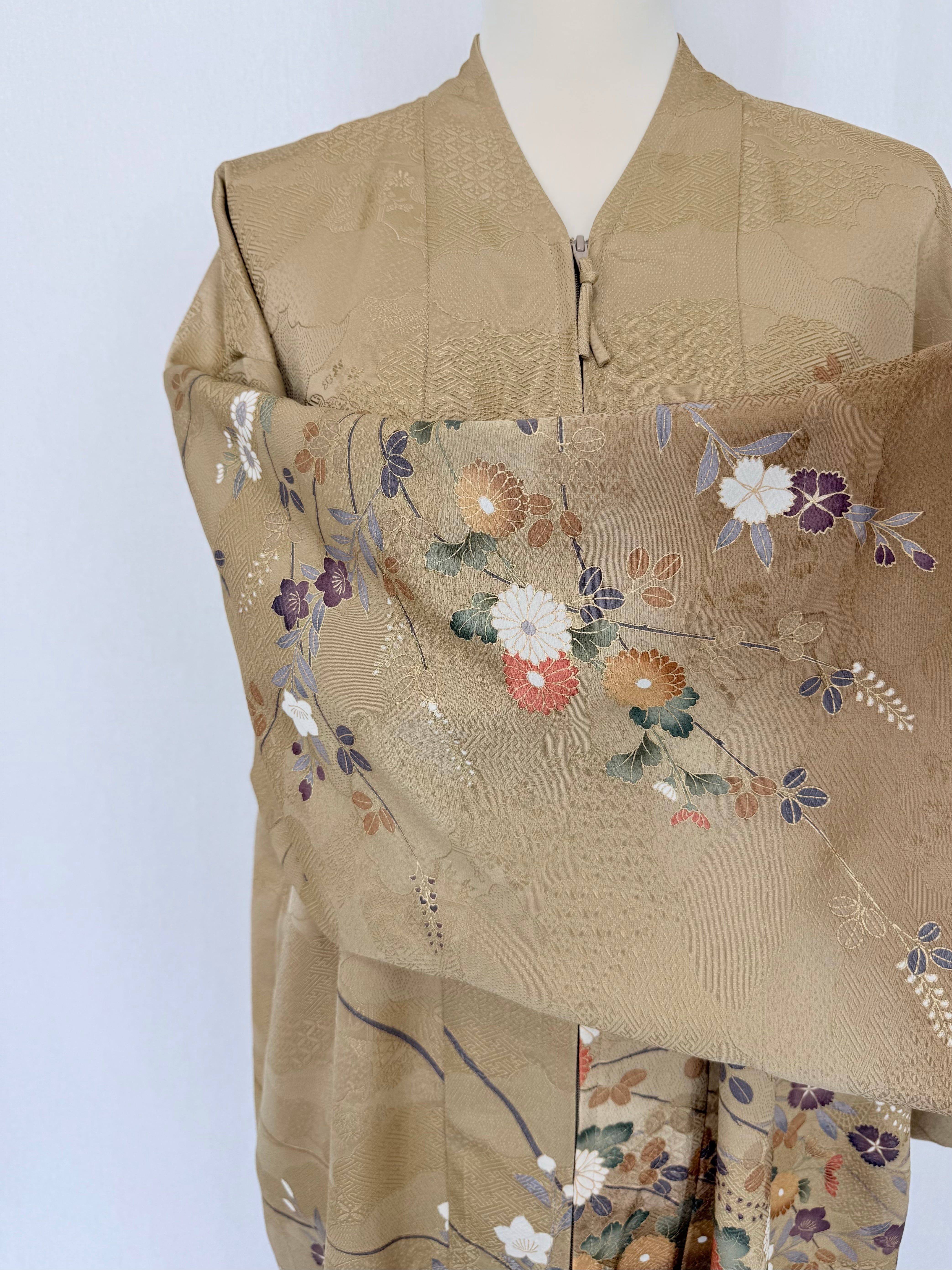 It is made from a kimono hand-painted with cascading chrysanthemums and other flowers, creating a graceful flow throughout the garment. Every part of the kimono fabric is adorned with intricate patterns, adding to its elegance.