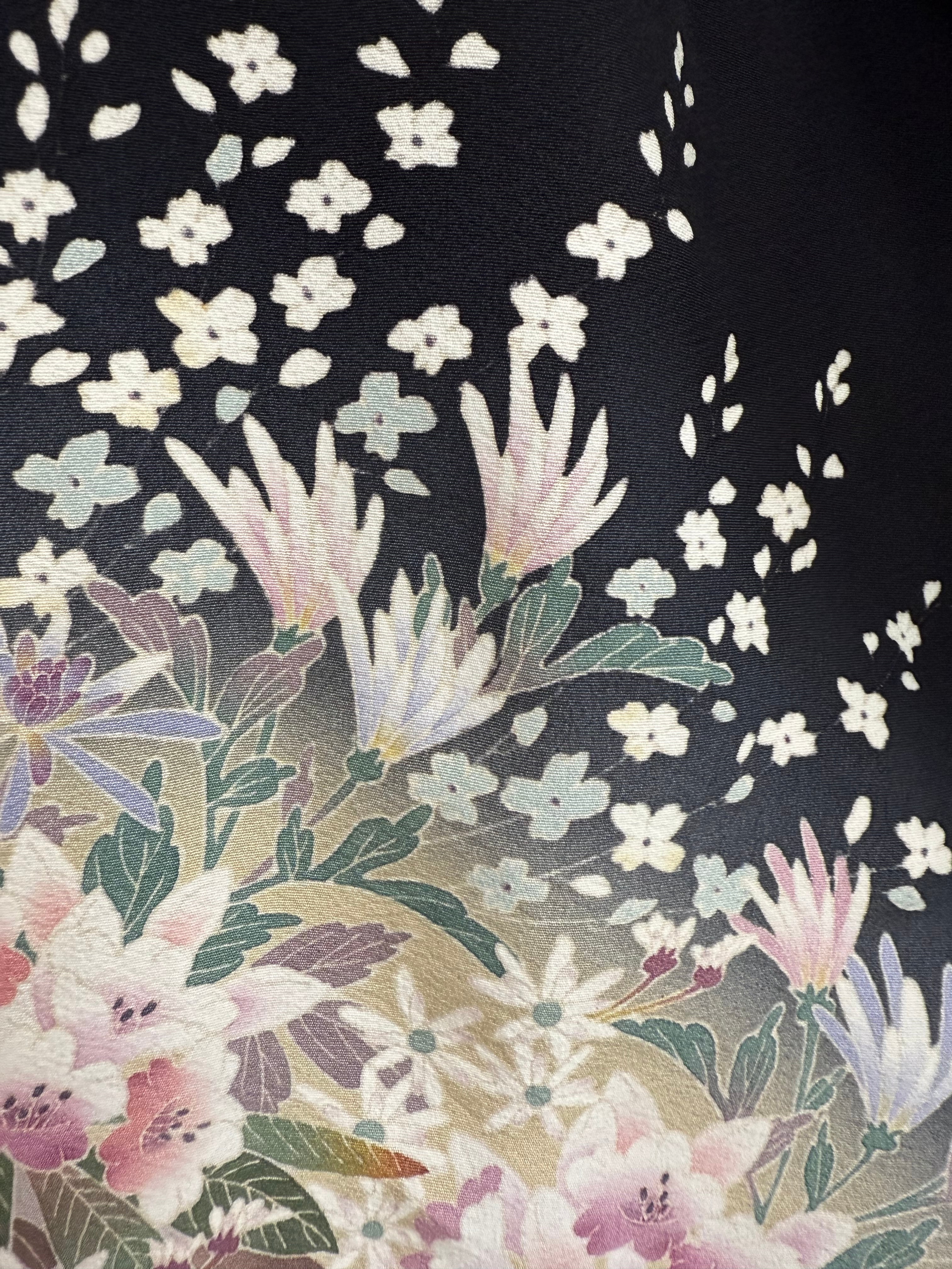This kimono is a tomesode, which is considered the most formal type of kimono worn by married women, typically for occasions such as weddings and other formal events. (However, in the case of remade items like this abaya, there are no restrictions on when or where it can be worn.)
