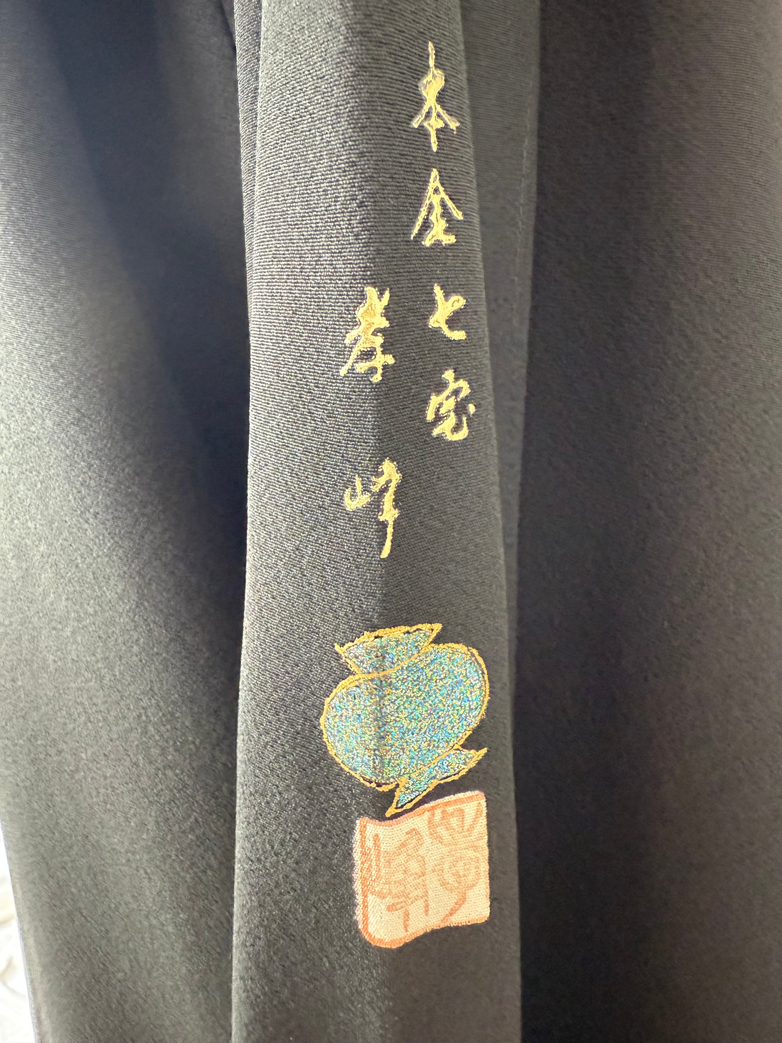 This abaya is crafted from a formal black tomesode kimono featuring a family crest, created by the renowned artisan "孝峰Kōhō" using the luxurious 本金七宝Honkin Shippo (gold leaf and enamel) technique.This kimono bears the signature mark of孝峰 Kōhō, the renowned artist behind the 本金七宝Honkin Shippo technique.