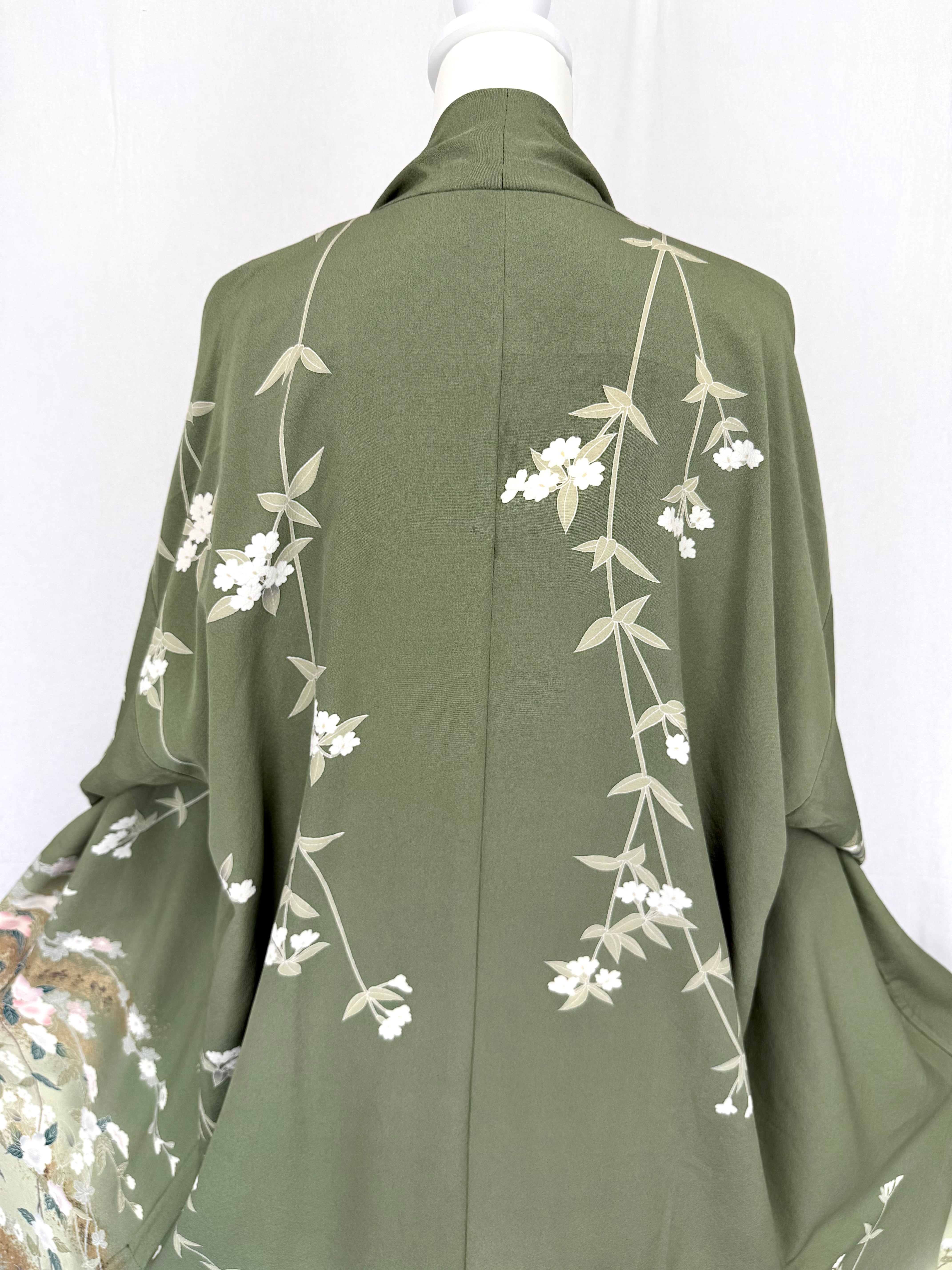 This abaya is made from a luxurious kimono adorned with cascading cherry blossoms, flowers, and gold leaf flowing from the back and neckline down to the hem. A gradation of matcha green shades beautifully enhances the hem and sleeves.
