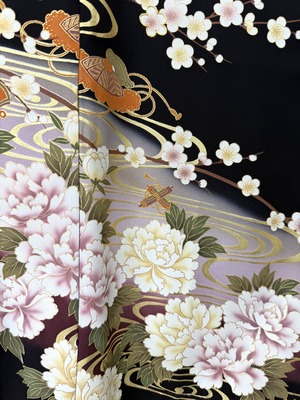 This kimono is luxuriously adorned with hand-painted motifs of peonies, plum blossoms, and wave patterns, accented with gold leaf. The wave motif is an auspicious design symbolizing everlasting prosperity and tranquility. Scattered depictions of treasures further convey wishes for eternal happiness.