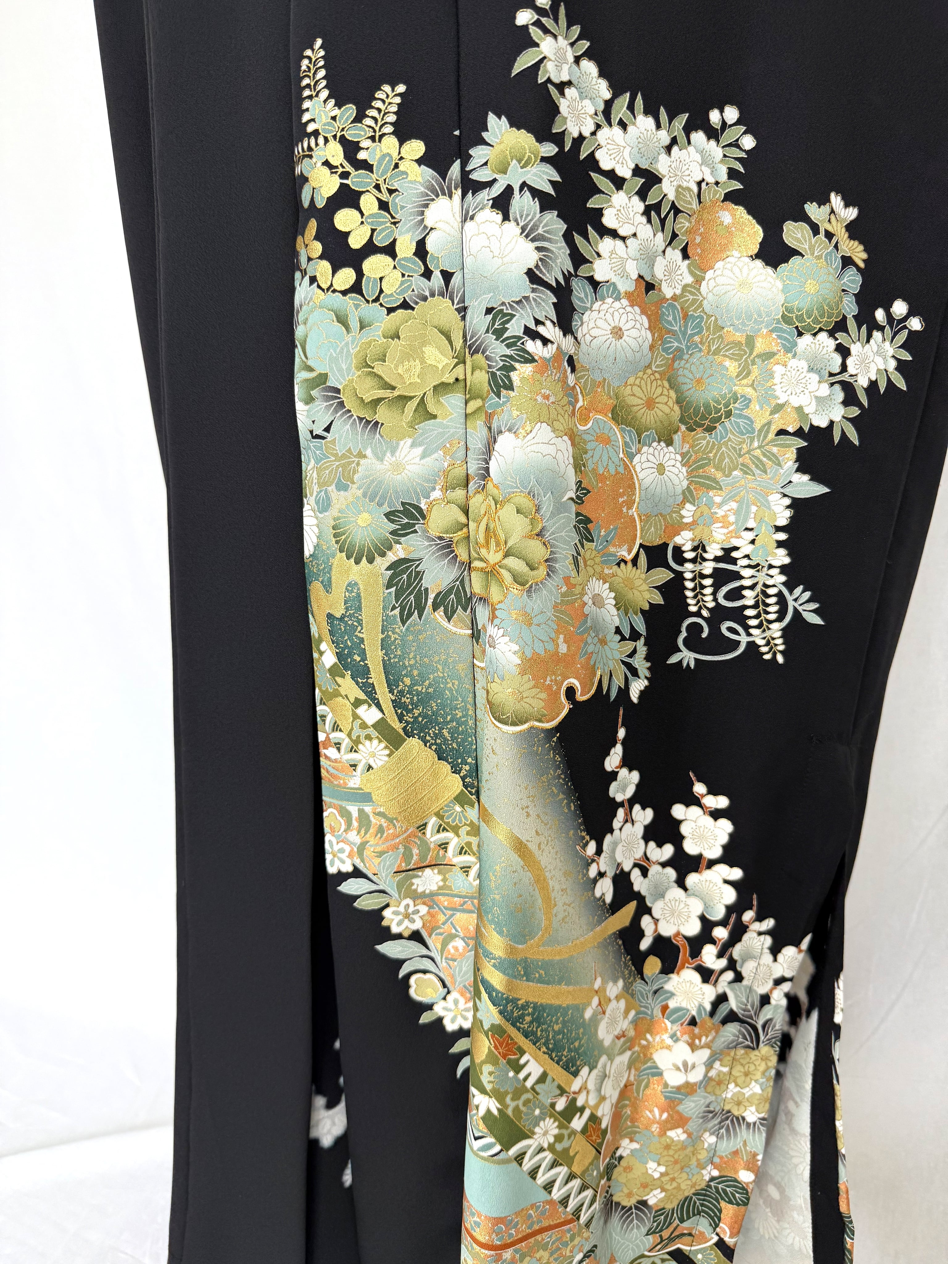 This abaya is crafted from a fully hand-painted kimono lavishly adorned with gold leaf, featuring auspicious motifs such as cherry blossoms, wisteria, peonies, plum blossoms, and *noshi* patterns—traditional Japanese ribbon-like designs symbolizing longevity and happiness.