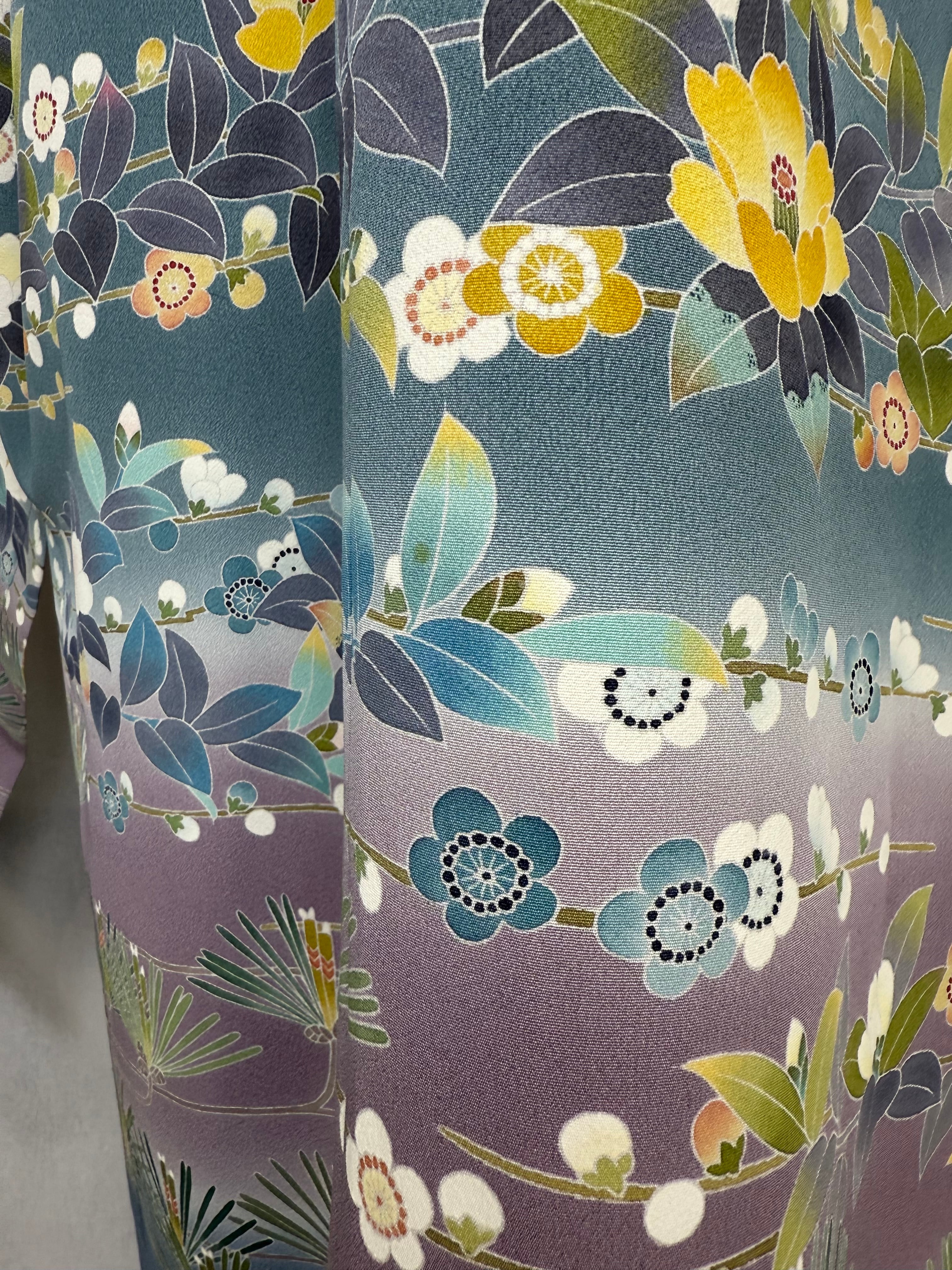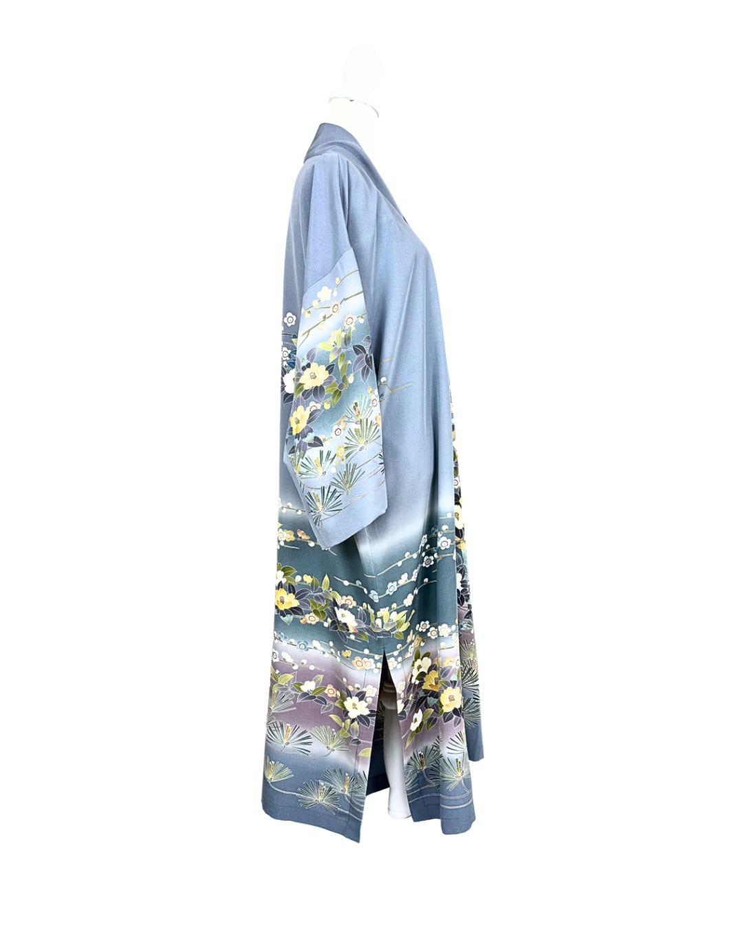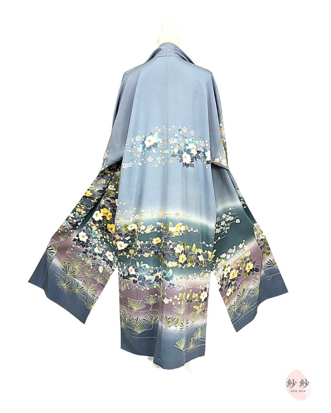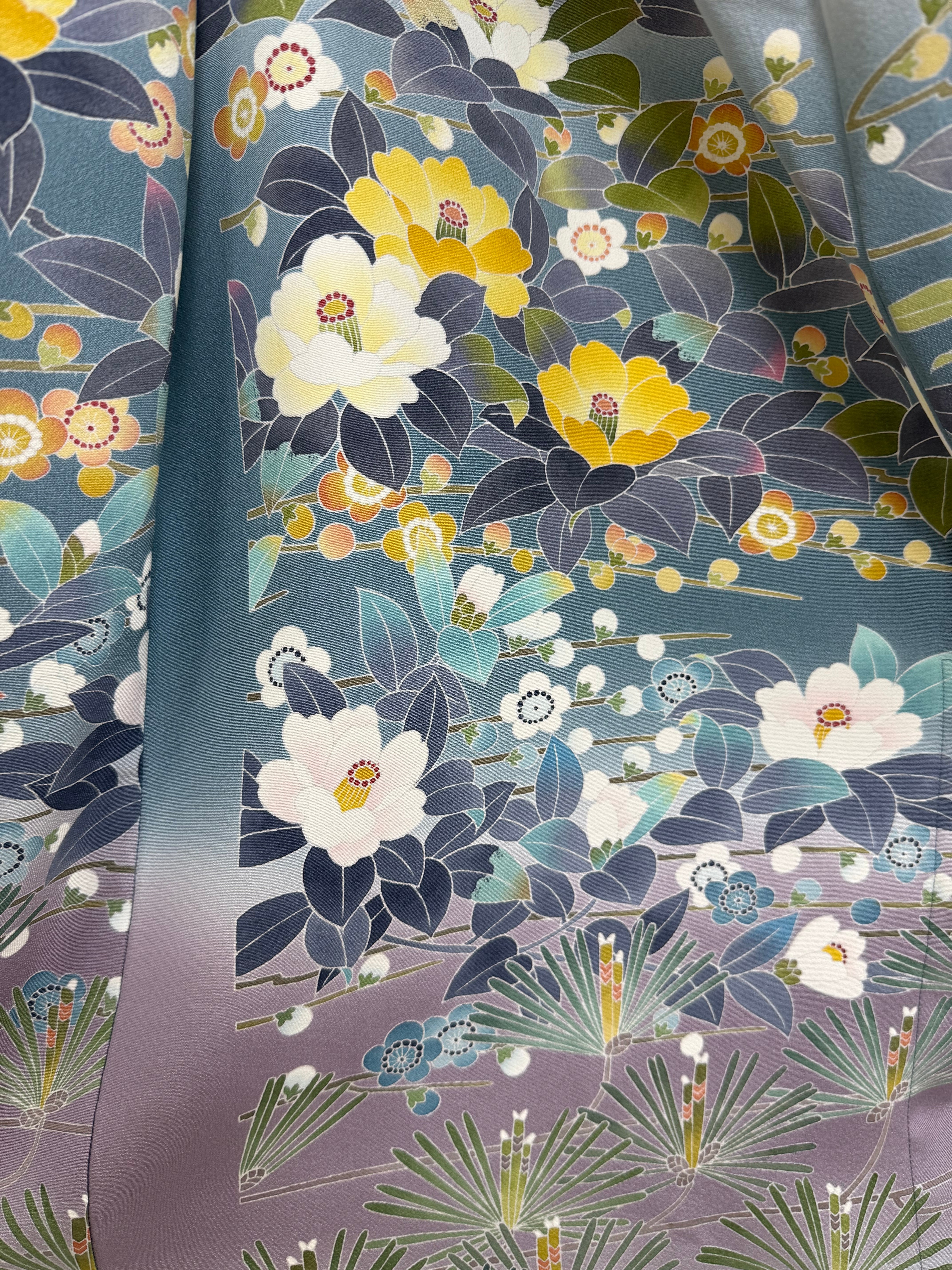 このアバヤは松や椿、梅などの花々が友禅染の手法で手描きで描かれた着物から作られています。見事な染めの技術、色合いの変化も楽しめる着物アバヤです