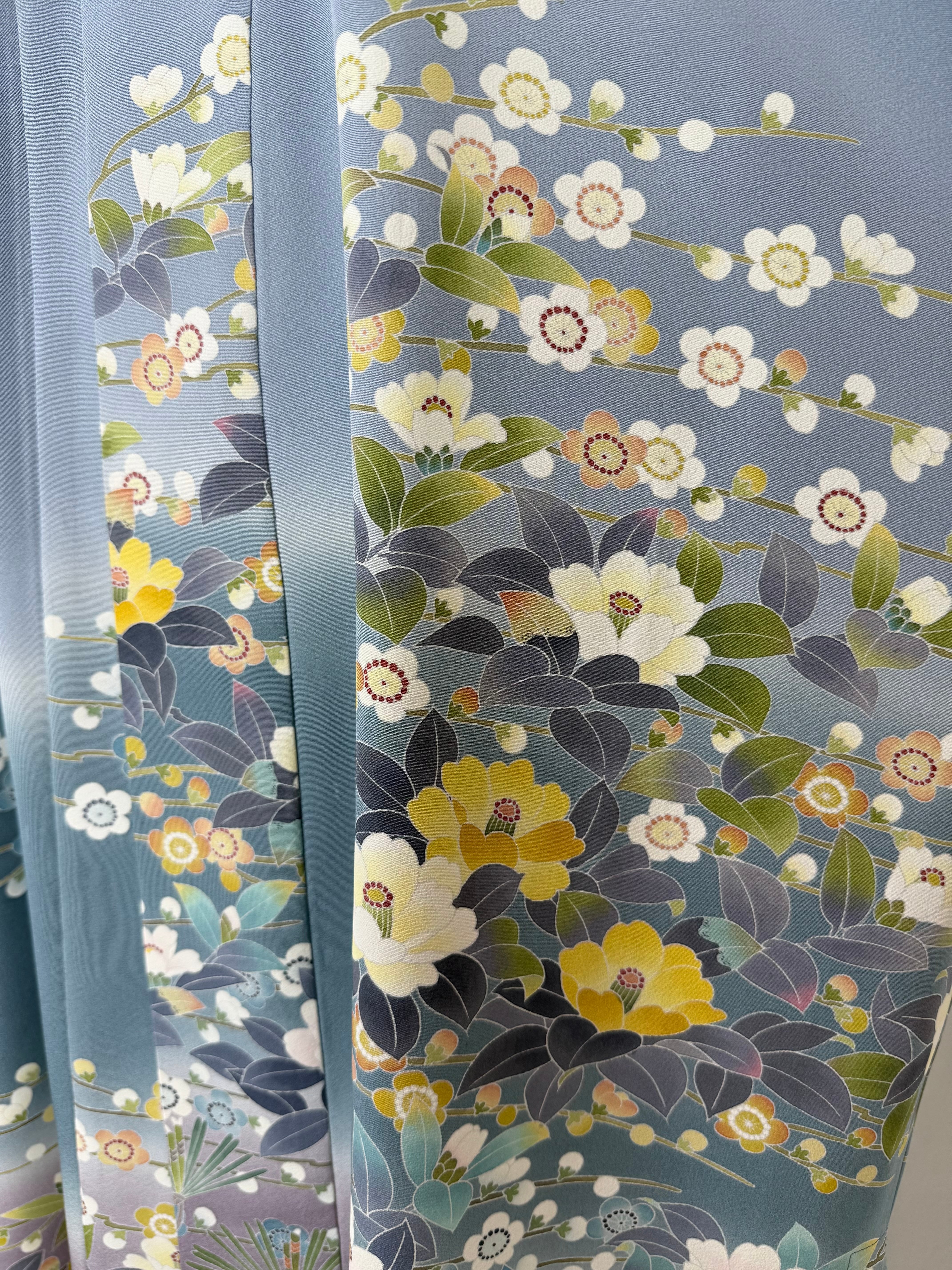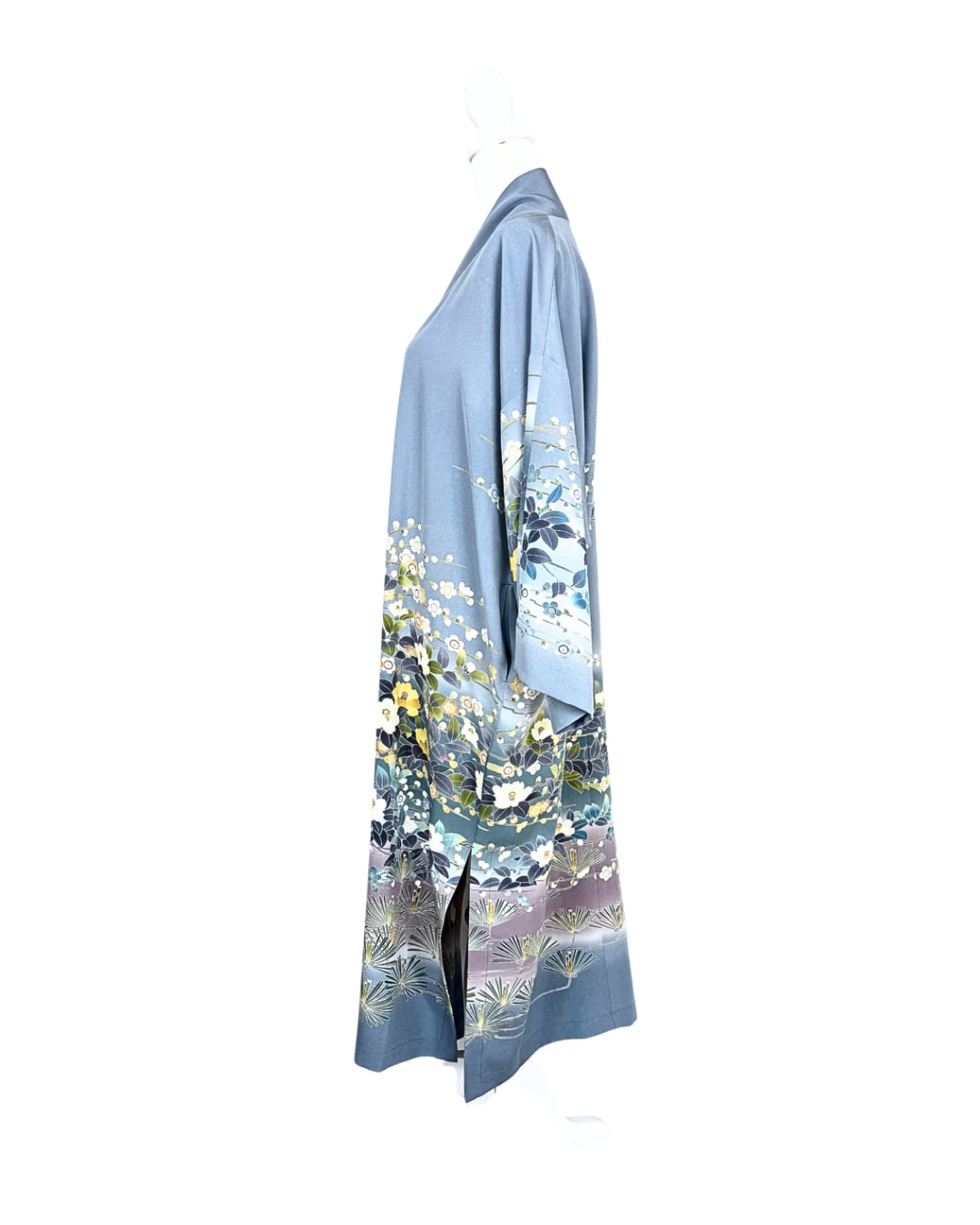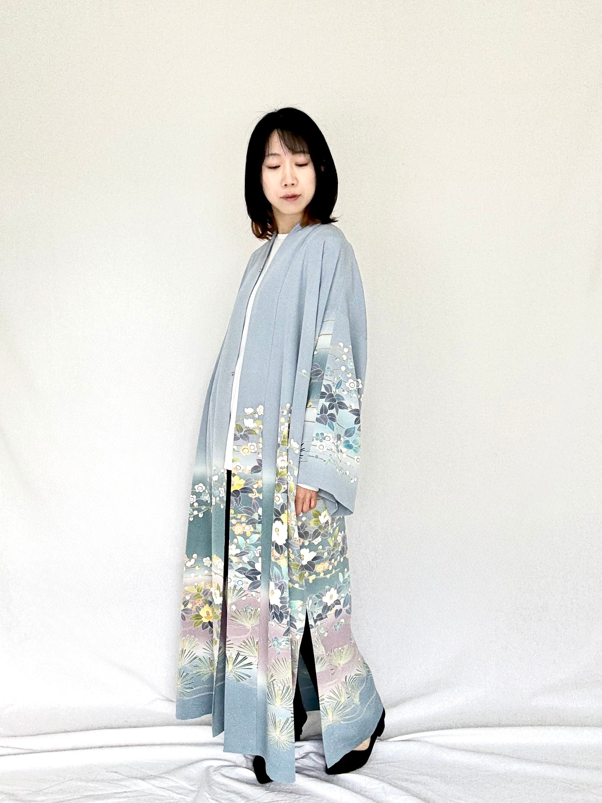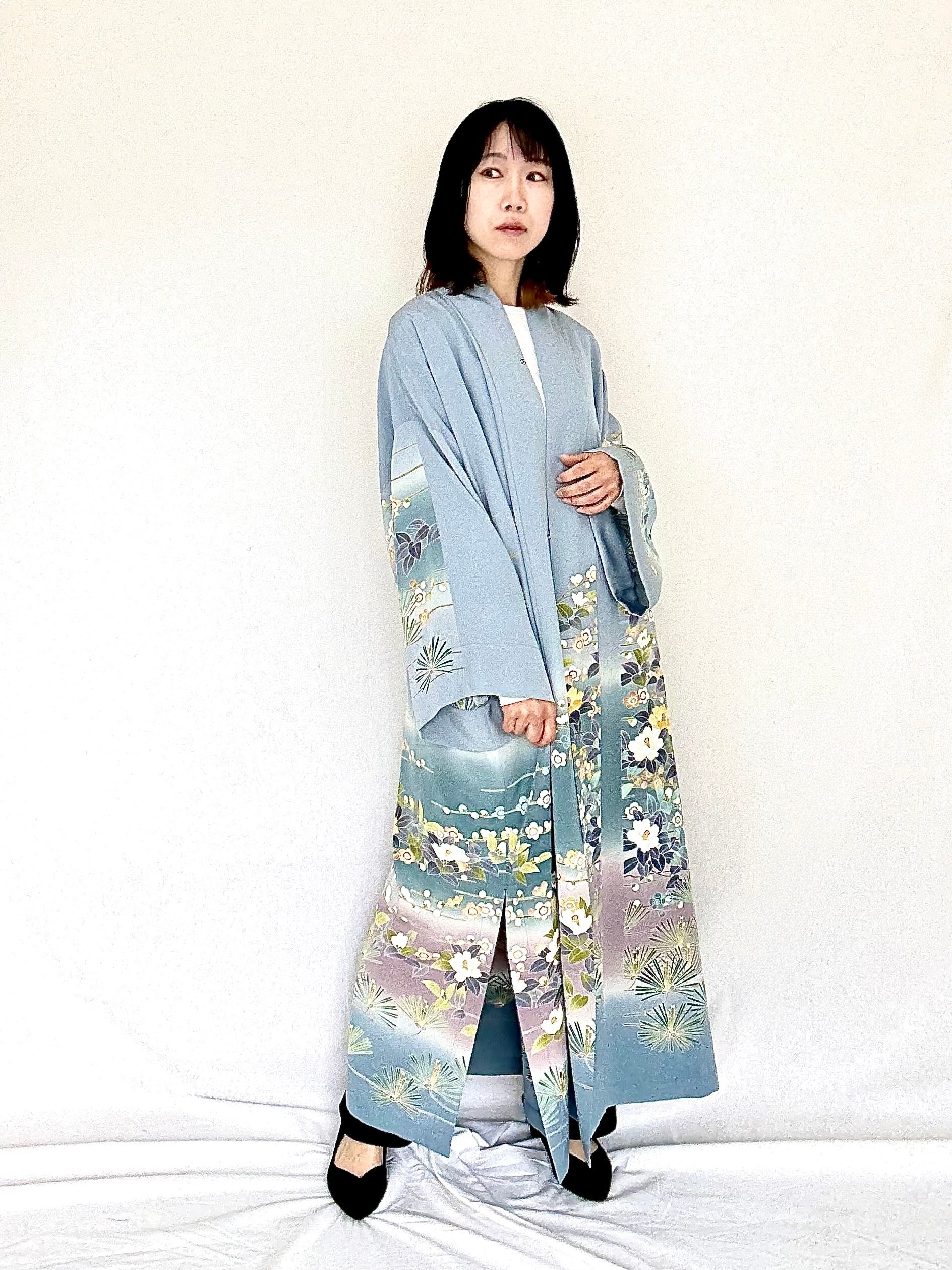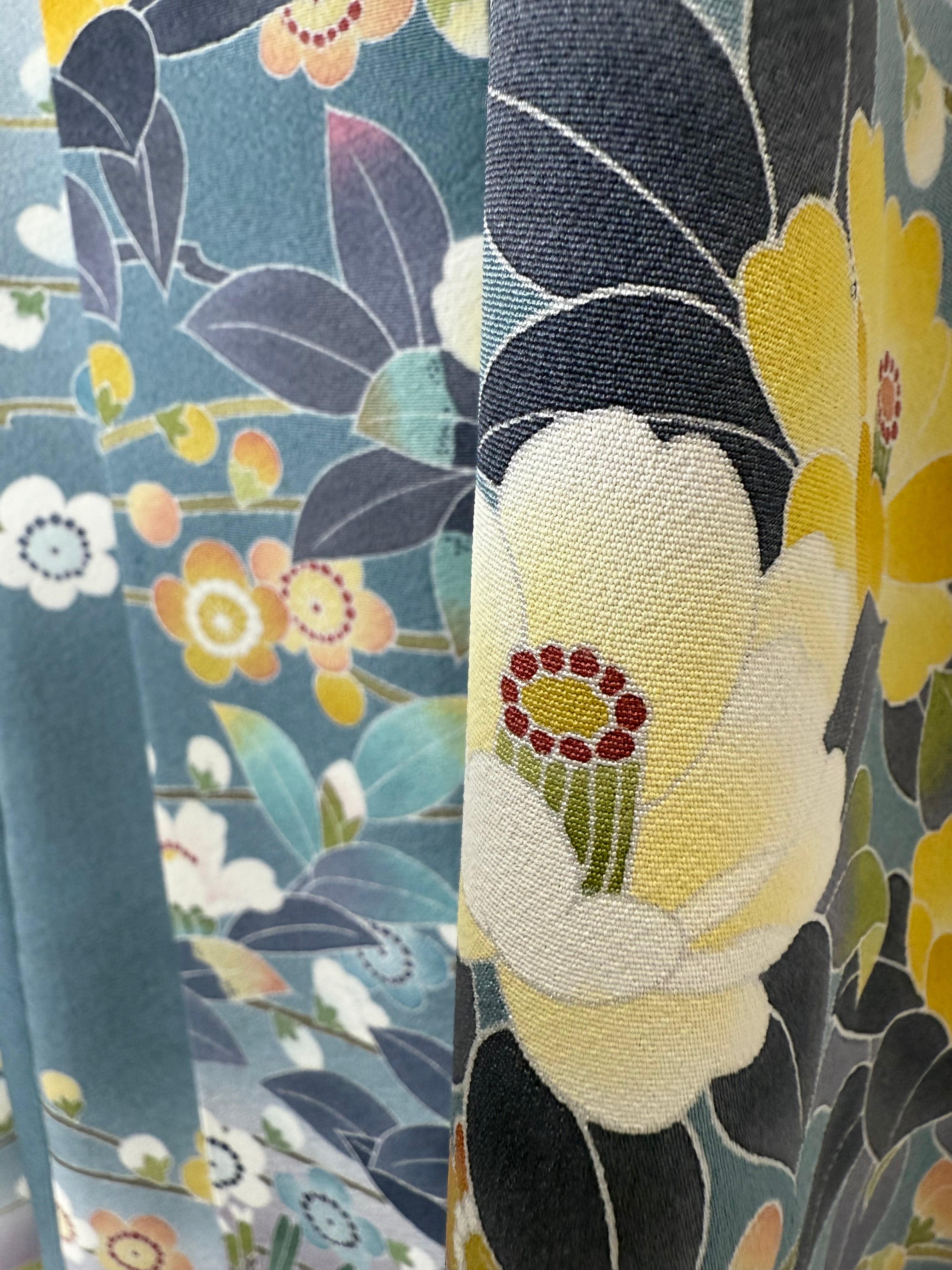 このアバヤは松や椿、梅などの花々が友禅染の手法で手描きで描かれた着物から作られています。見事な染めの技術、色合いの変化も楽しめる着物アバヤです