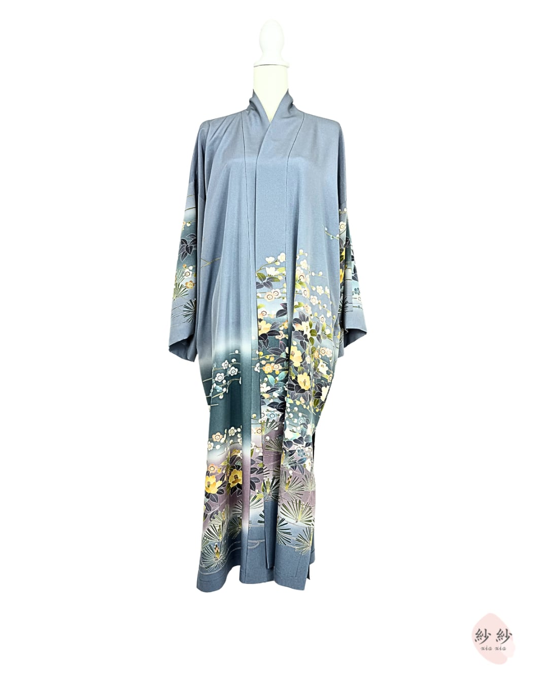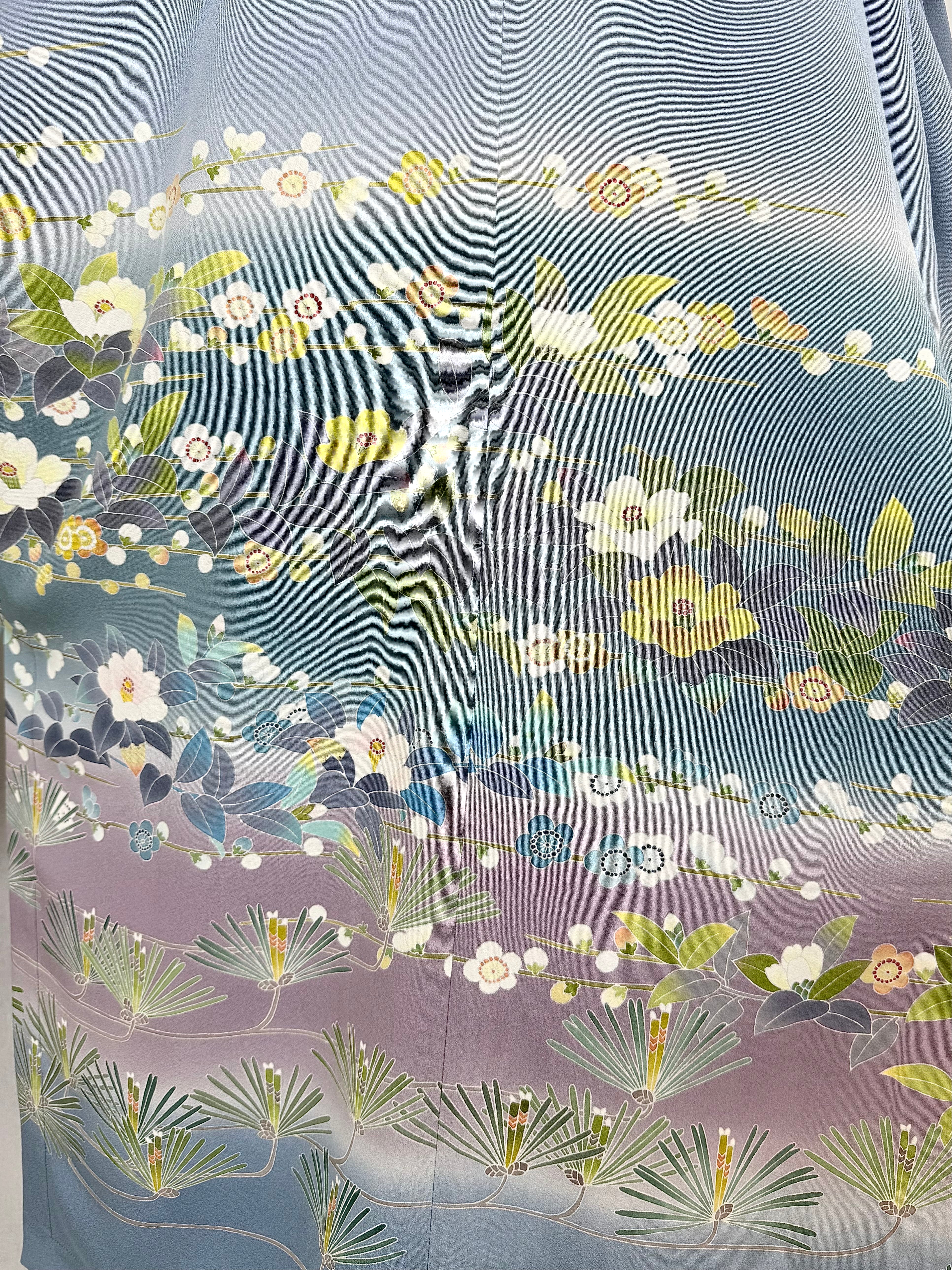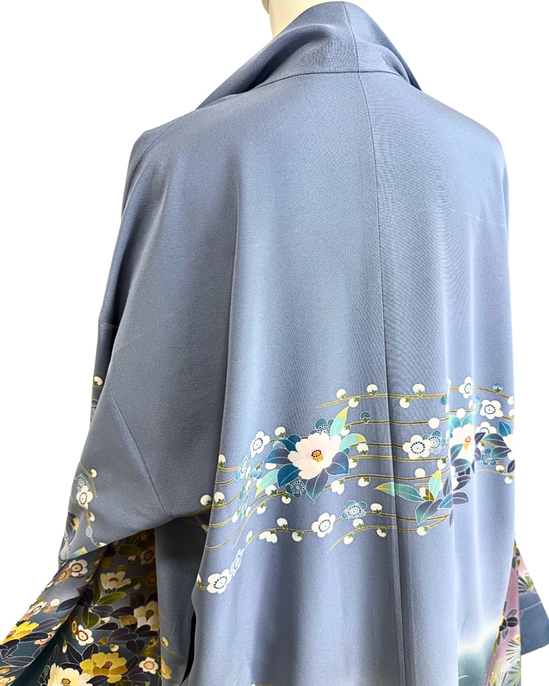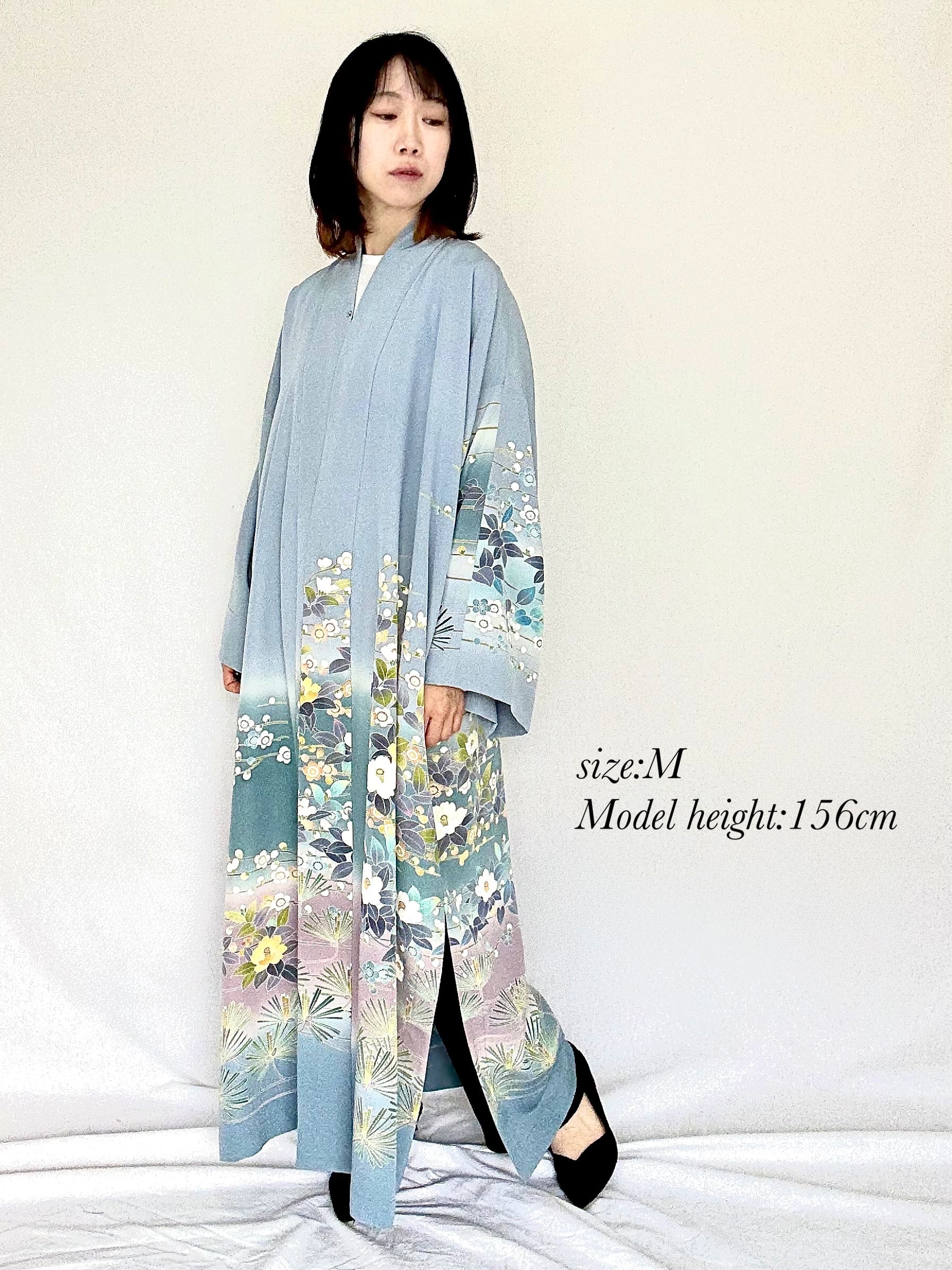 このアバヤは松や椿、梅などの花々が友禅染の手法で手描きで描かれた着物から作られています。見事な染めの技術、色合いの変化も楽しめる着物アバヤです