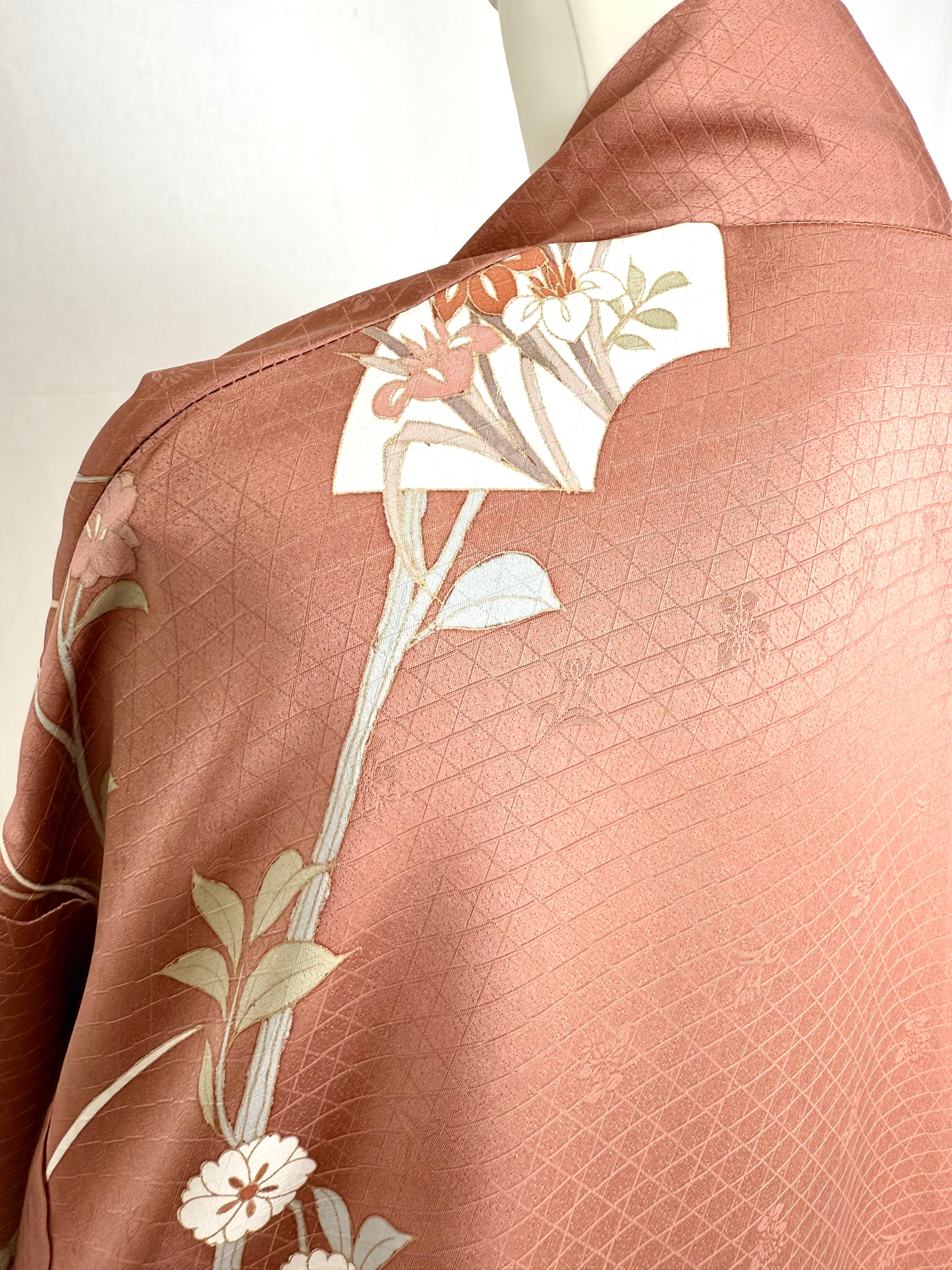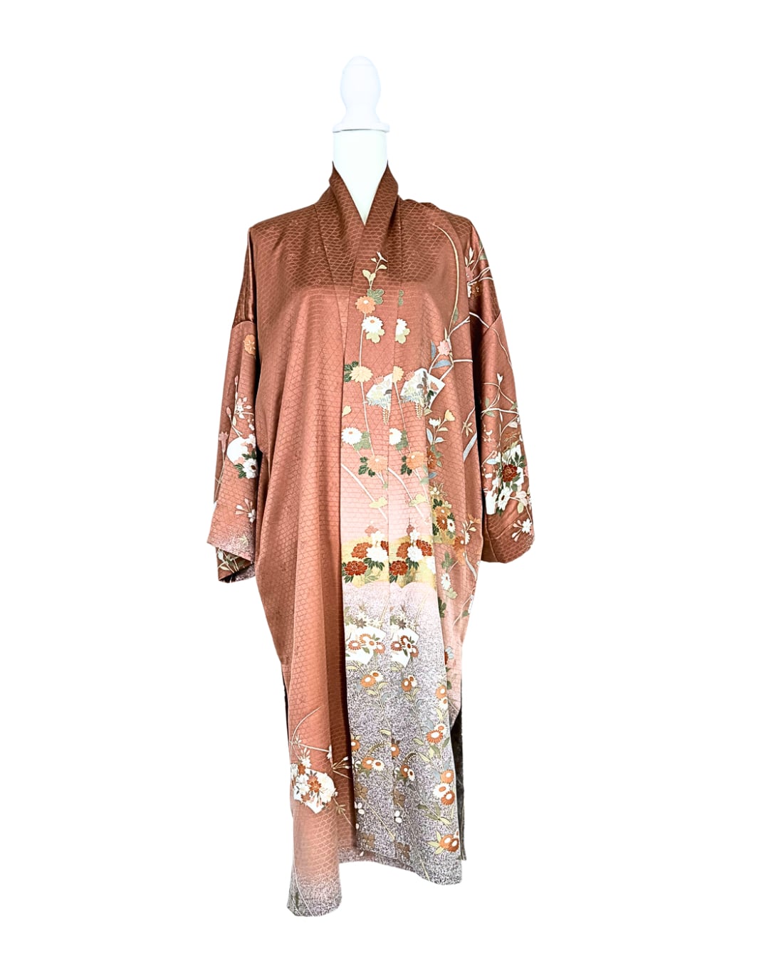 This abaya is made from a lustrous silk kimono in a warm, copper-toned rose hue.