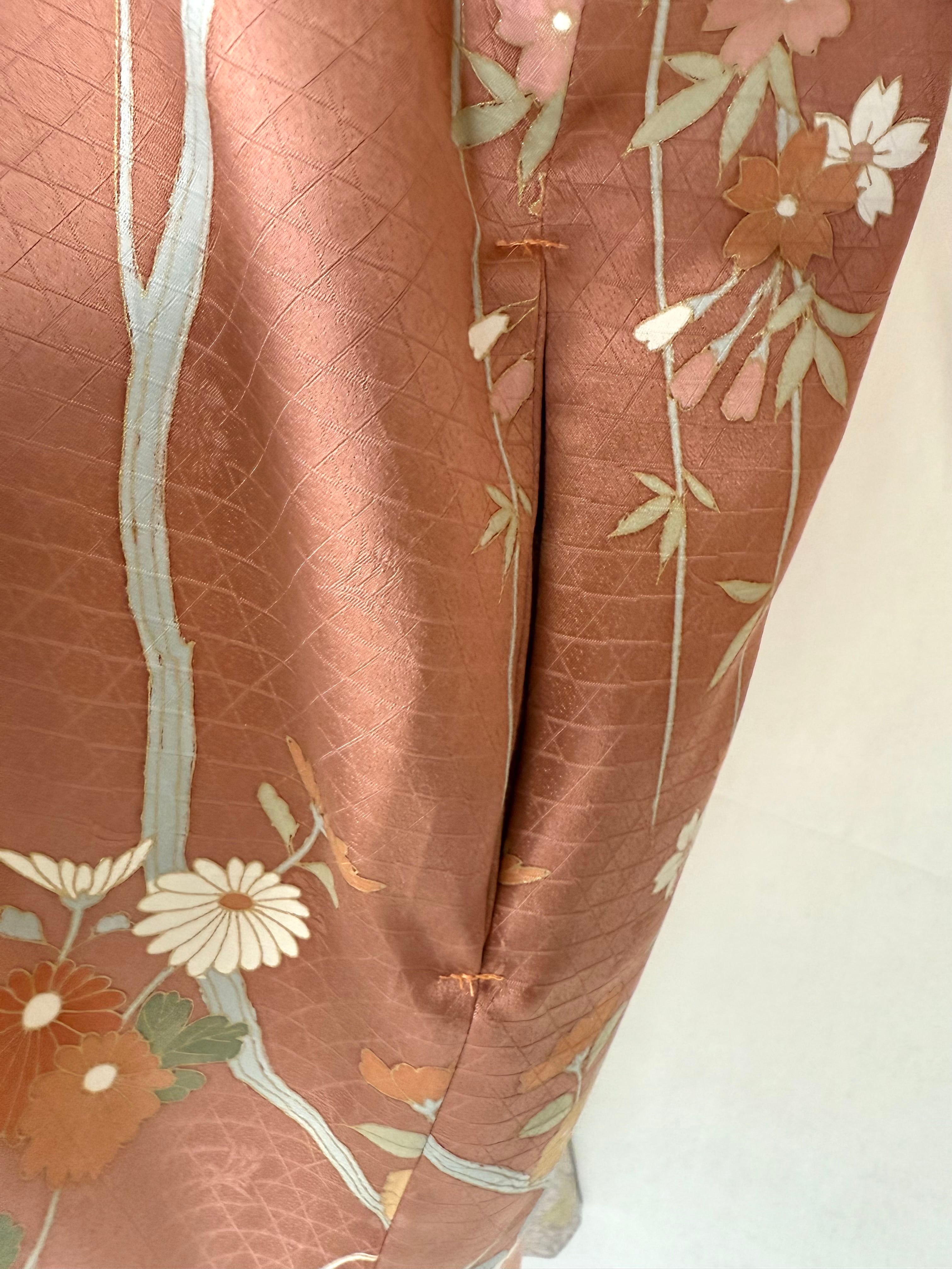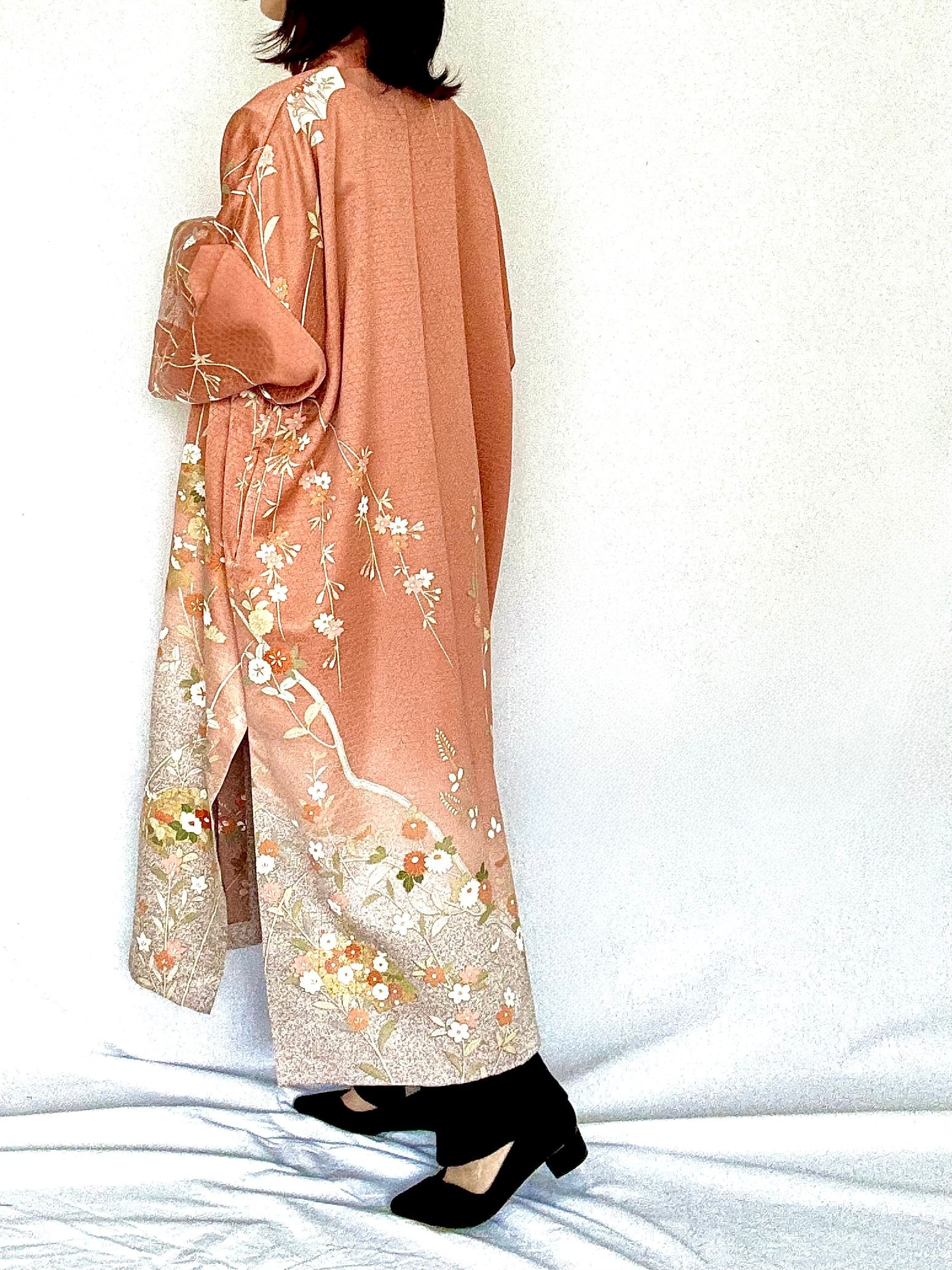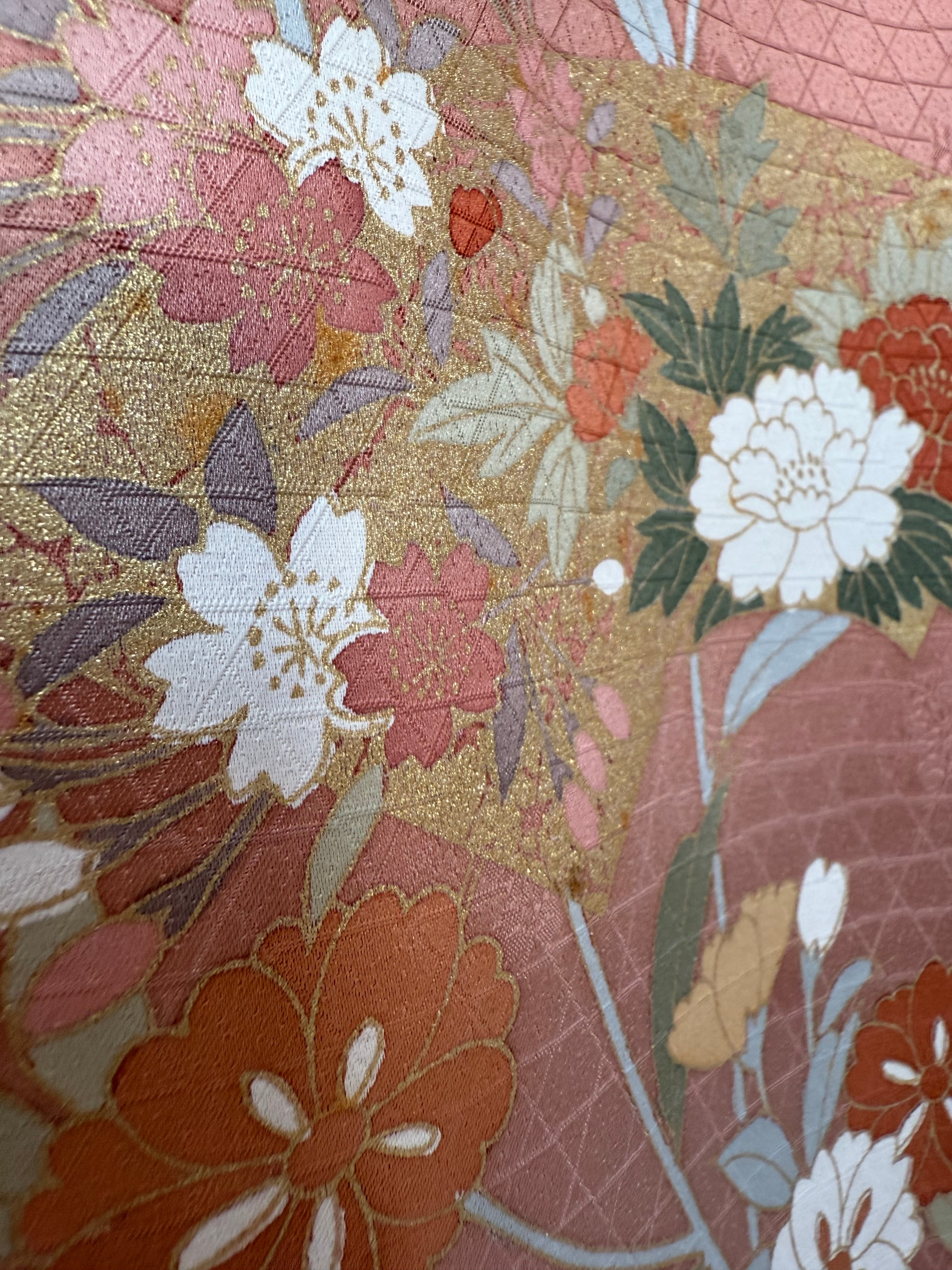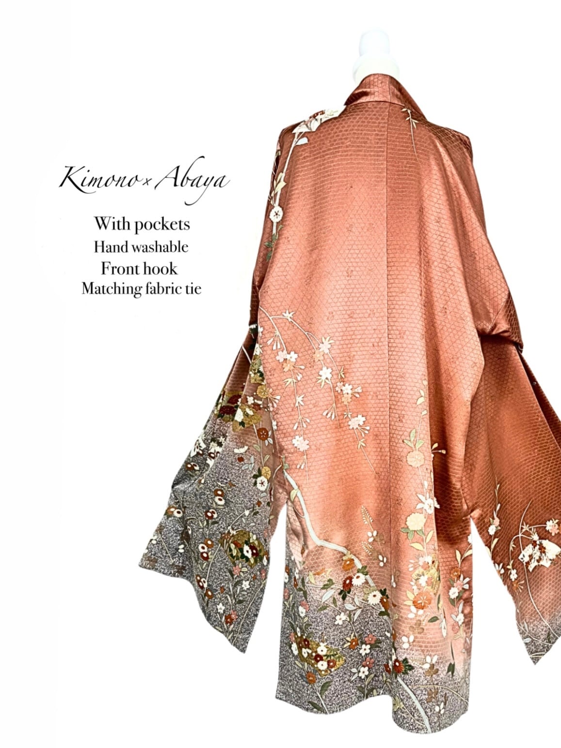 このアバヤは温かみのあるローズ色の、光沢のある絹生地の着物から作られています。桜や八重桜などの花々が肩から垂れ下がり、金箔がほどこされ、両袖にもたくさんの文様がある豪華な着物アバヤです。