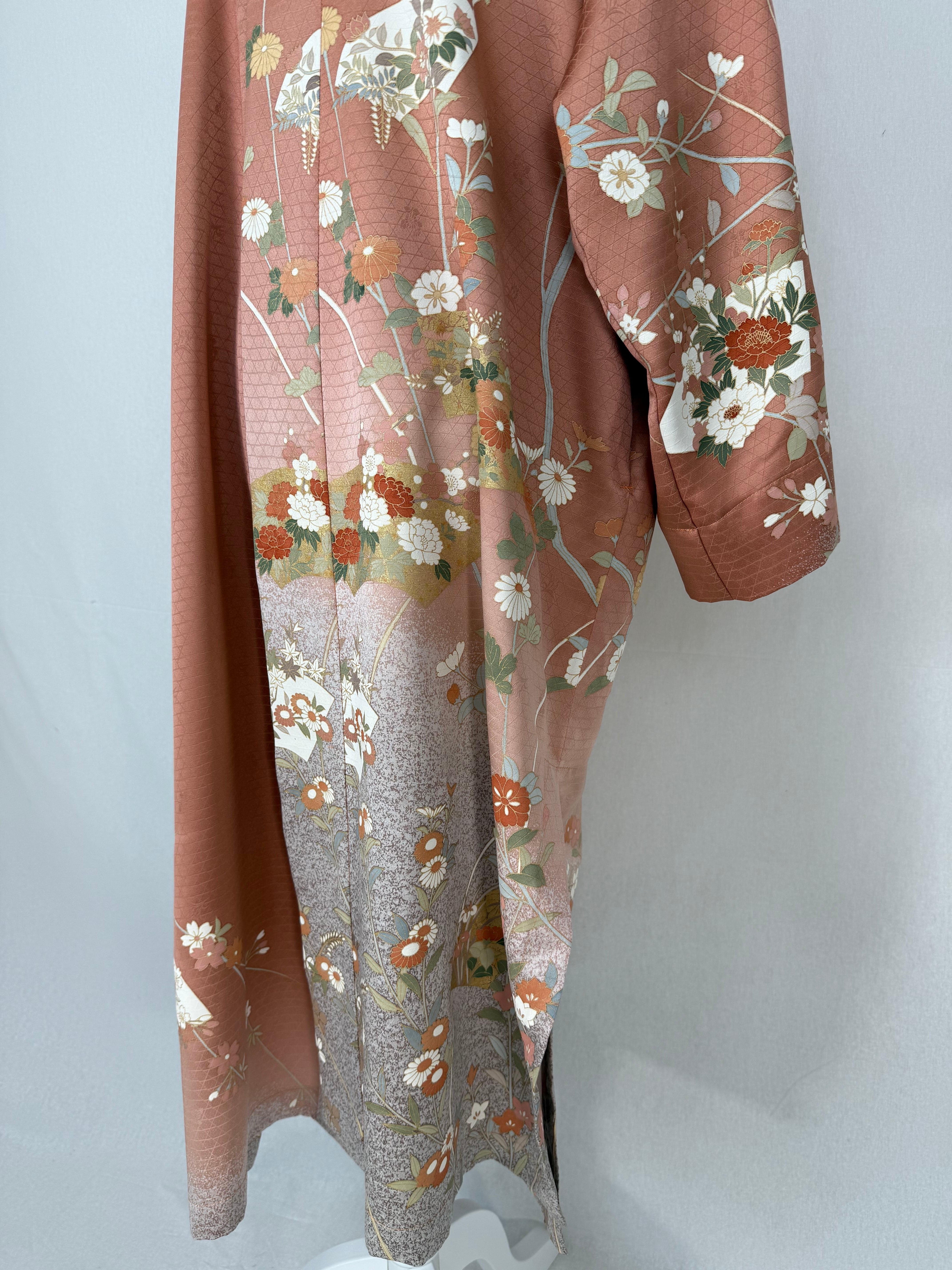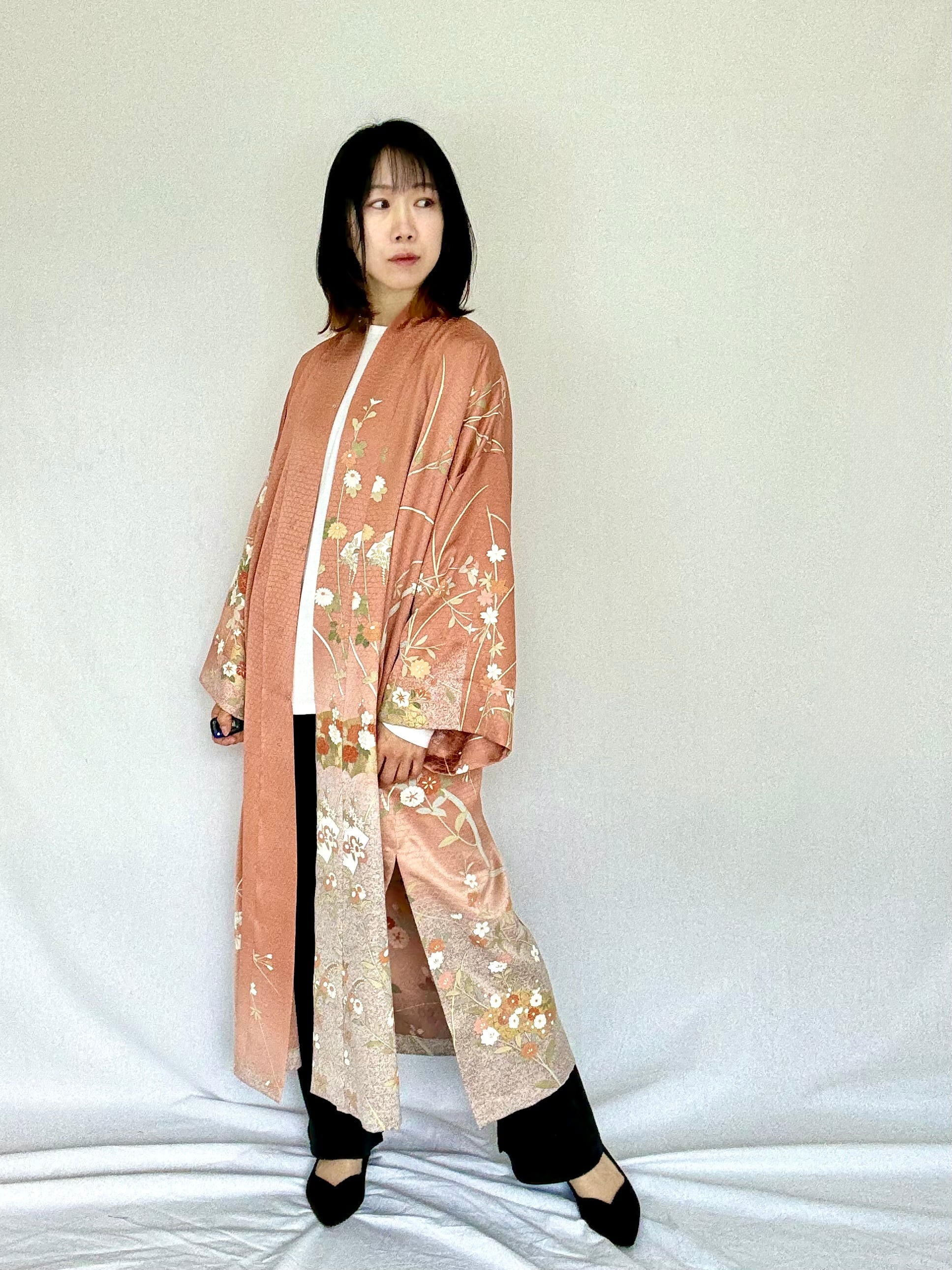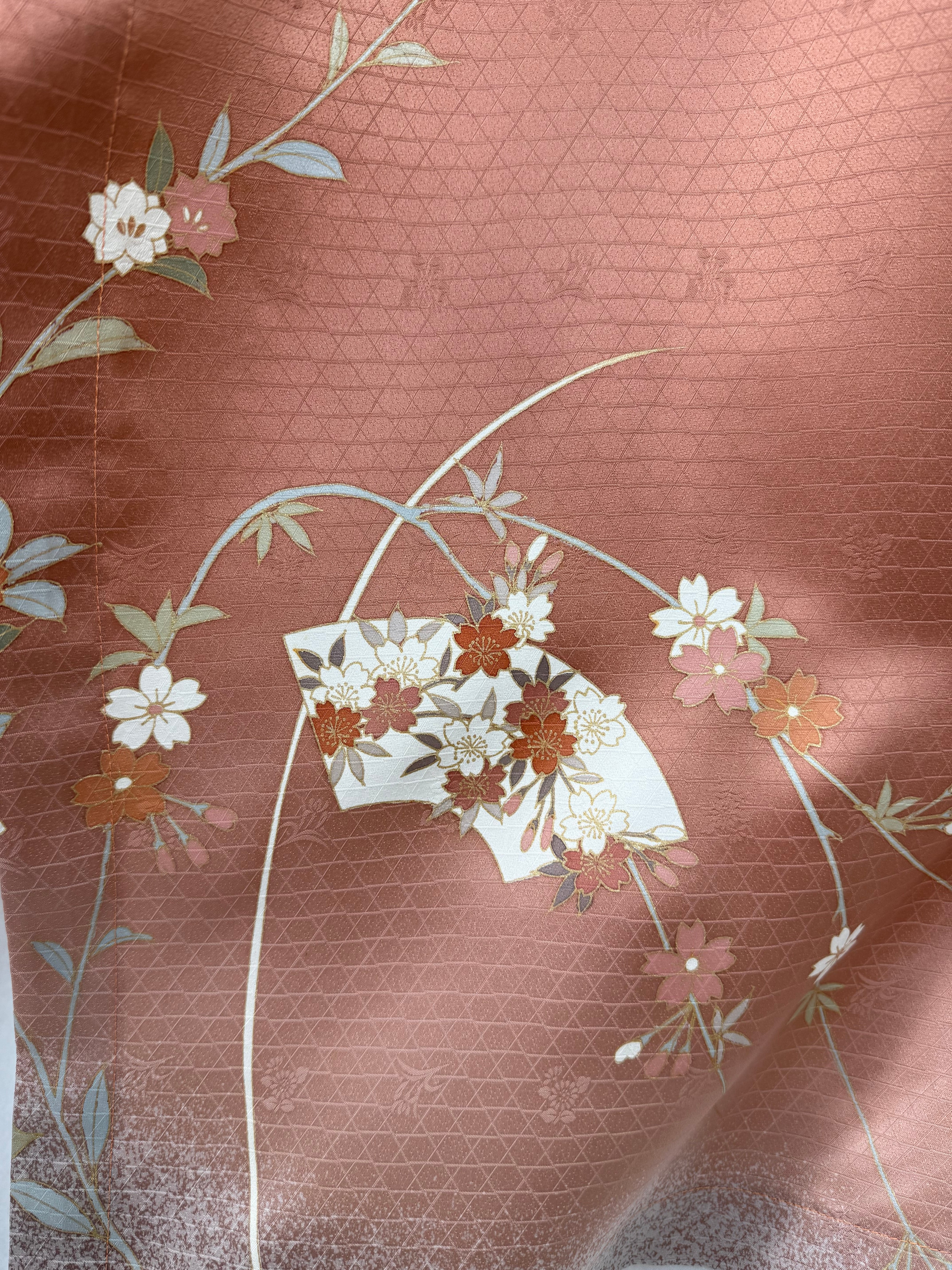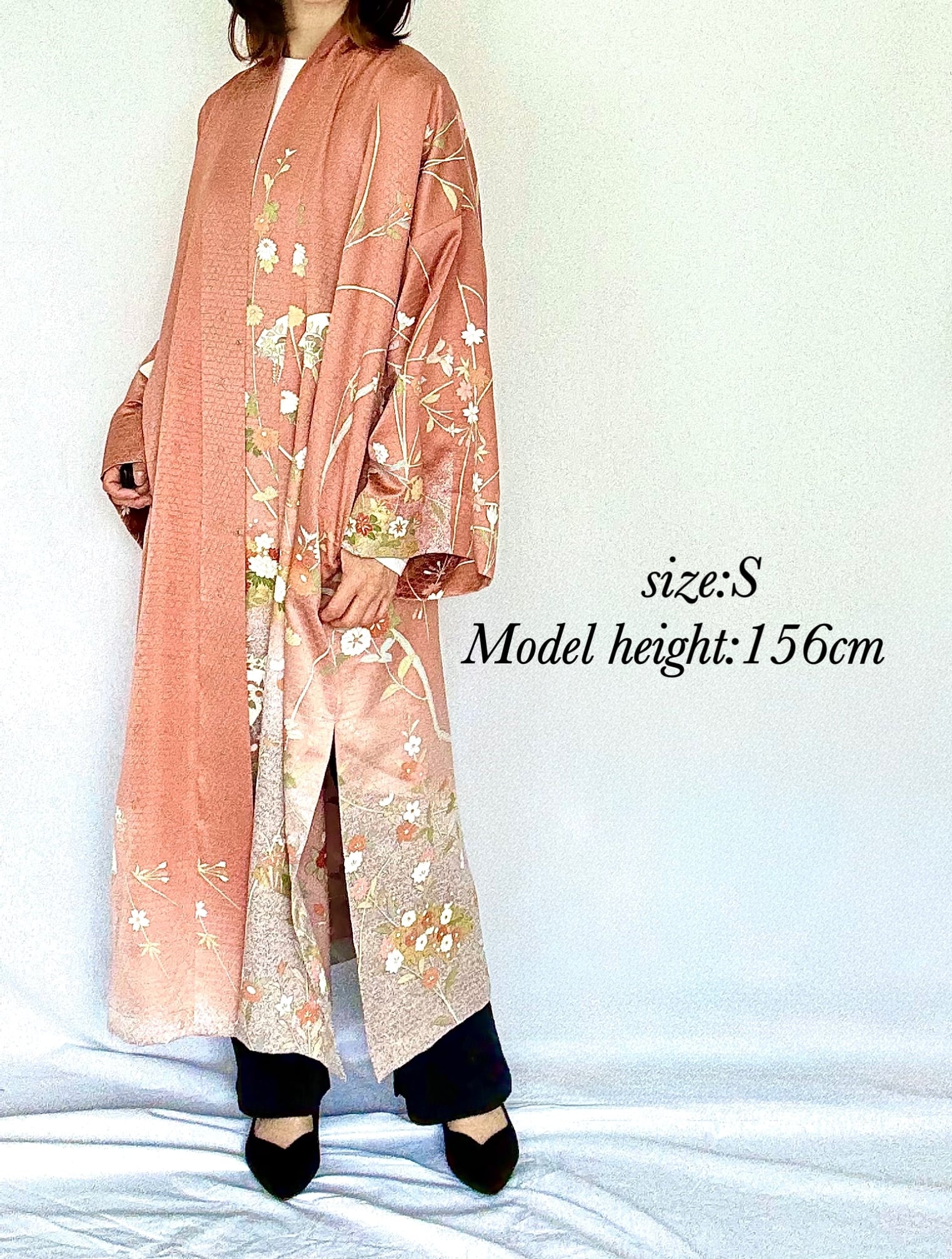 このアバヤは温かみのあるローズ色の、光沢のある絹生地の着物から作られています。桜や八重桜などの花々が肩から垂れ下がり、金箔がほどこされ、両袖にもたくさんの文様がある豪華な着物アバヤです。
