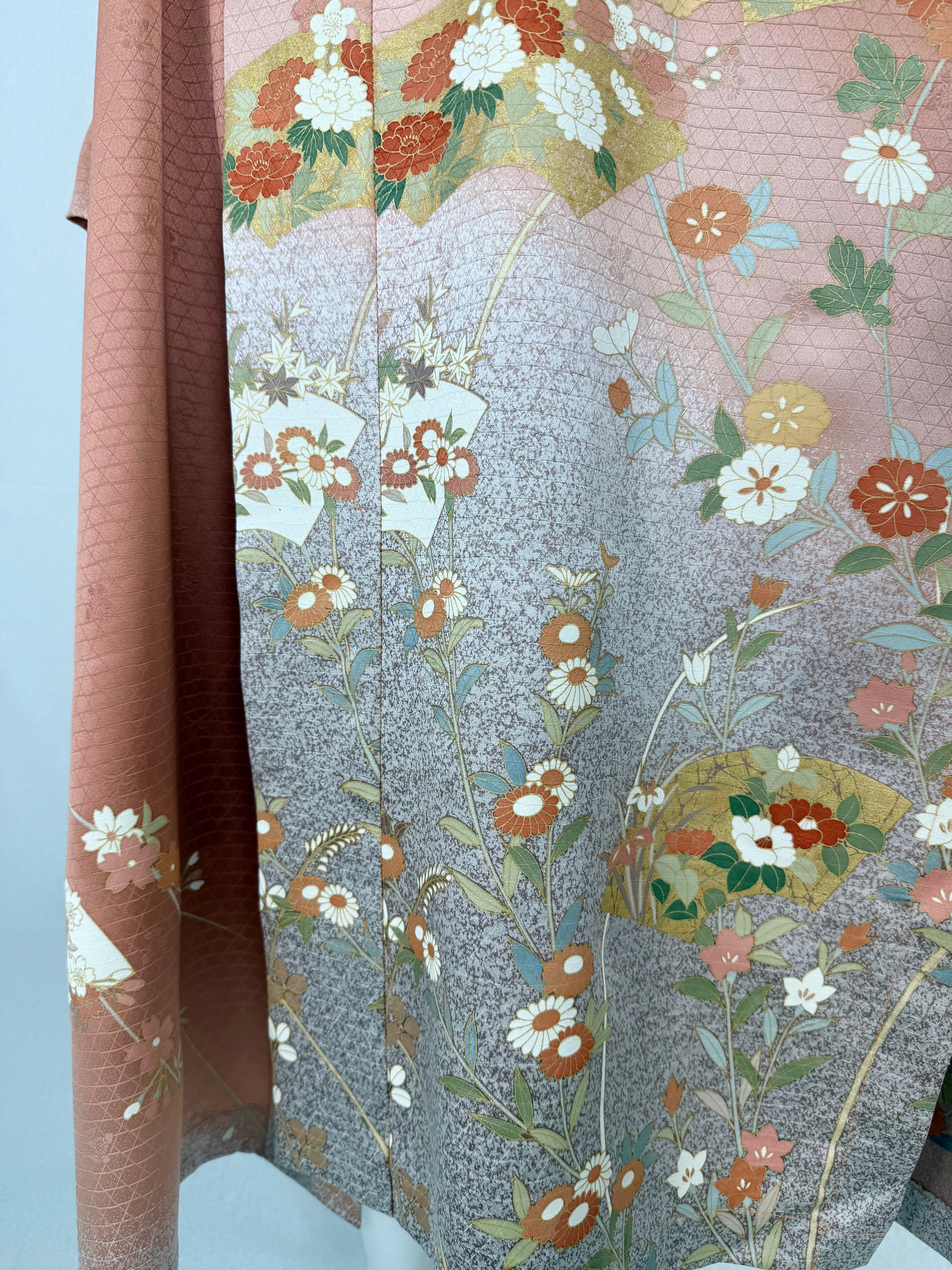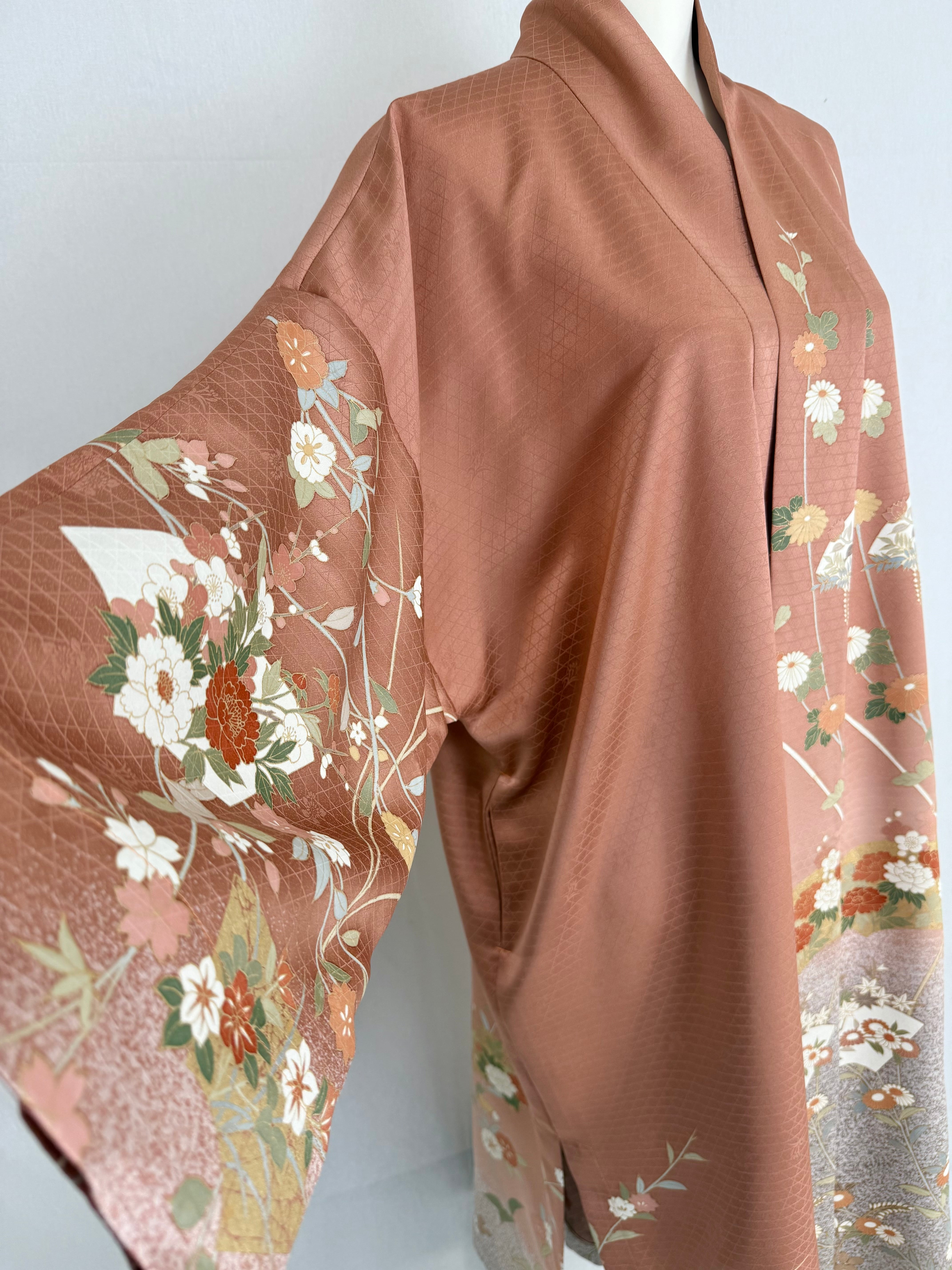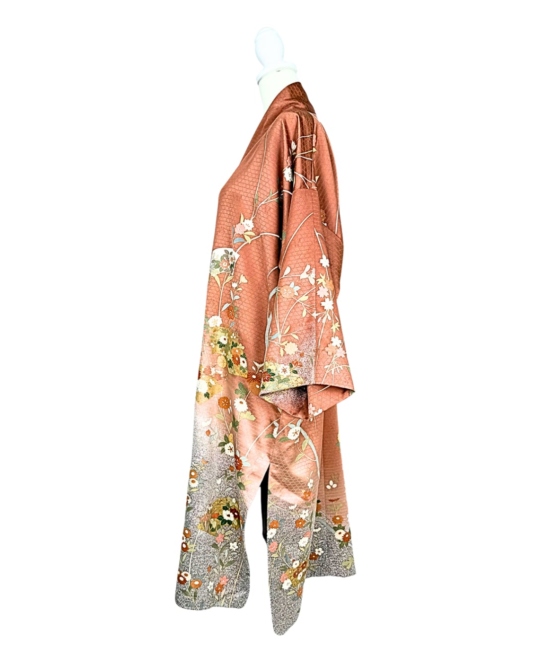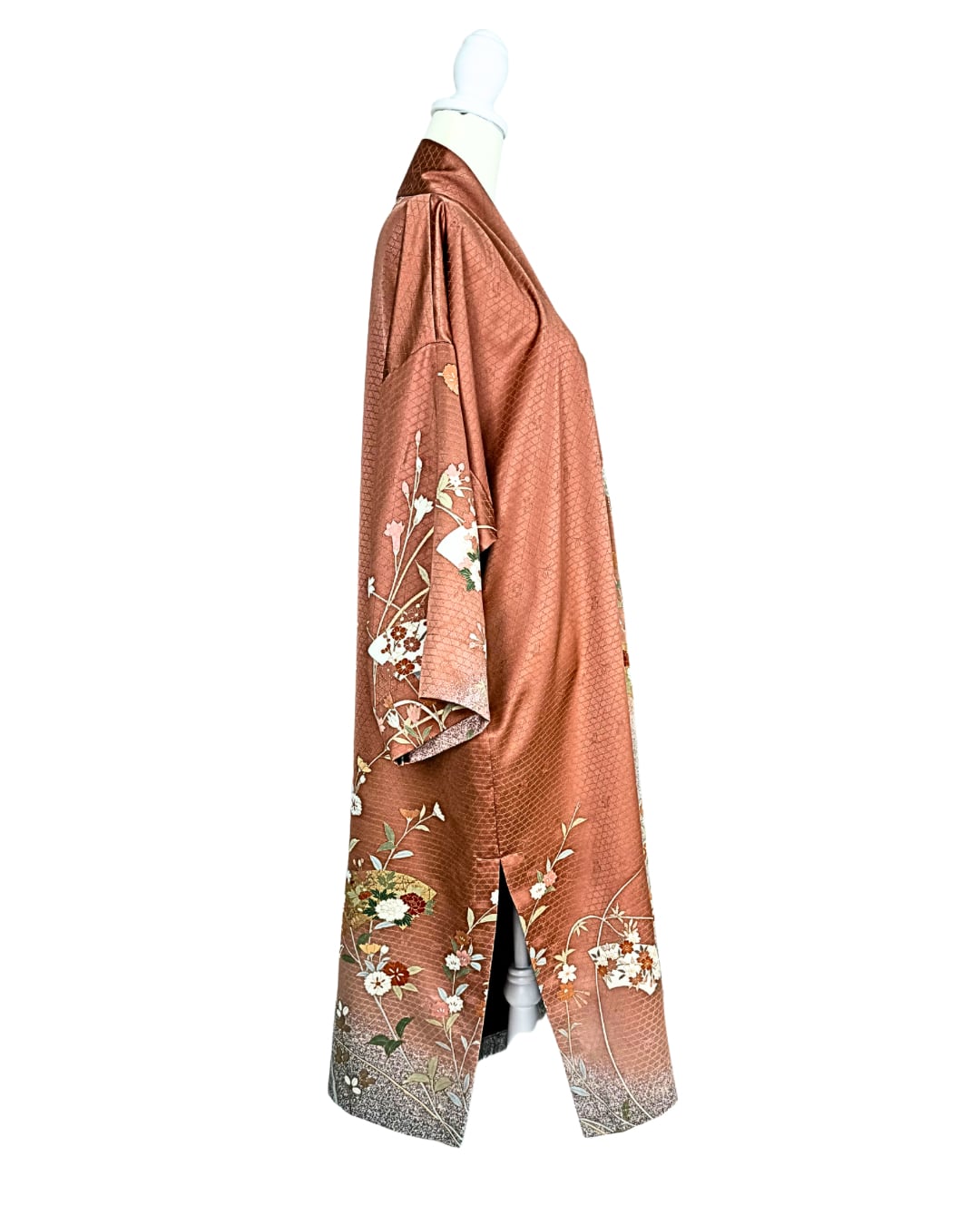 このアバヤは温かみのあるローズ色の、光沢のある絹生地の着物から作られています。桜や八重桜などの花々が肩から垂れ下がり、金箔がほどこされ、両袖にもたくさんの文様がある豪華な着物アバヤです。