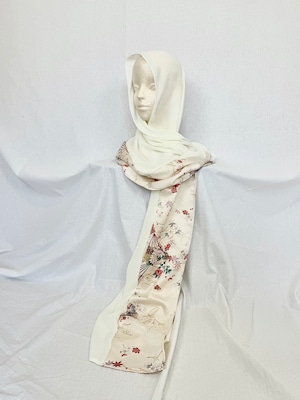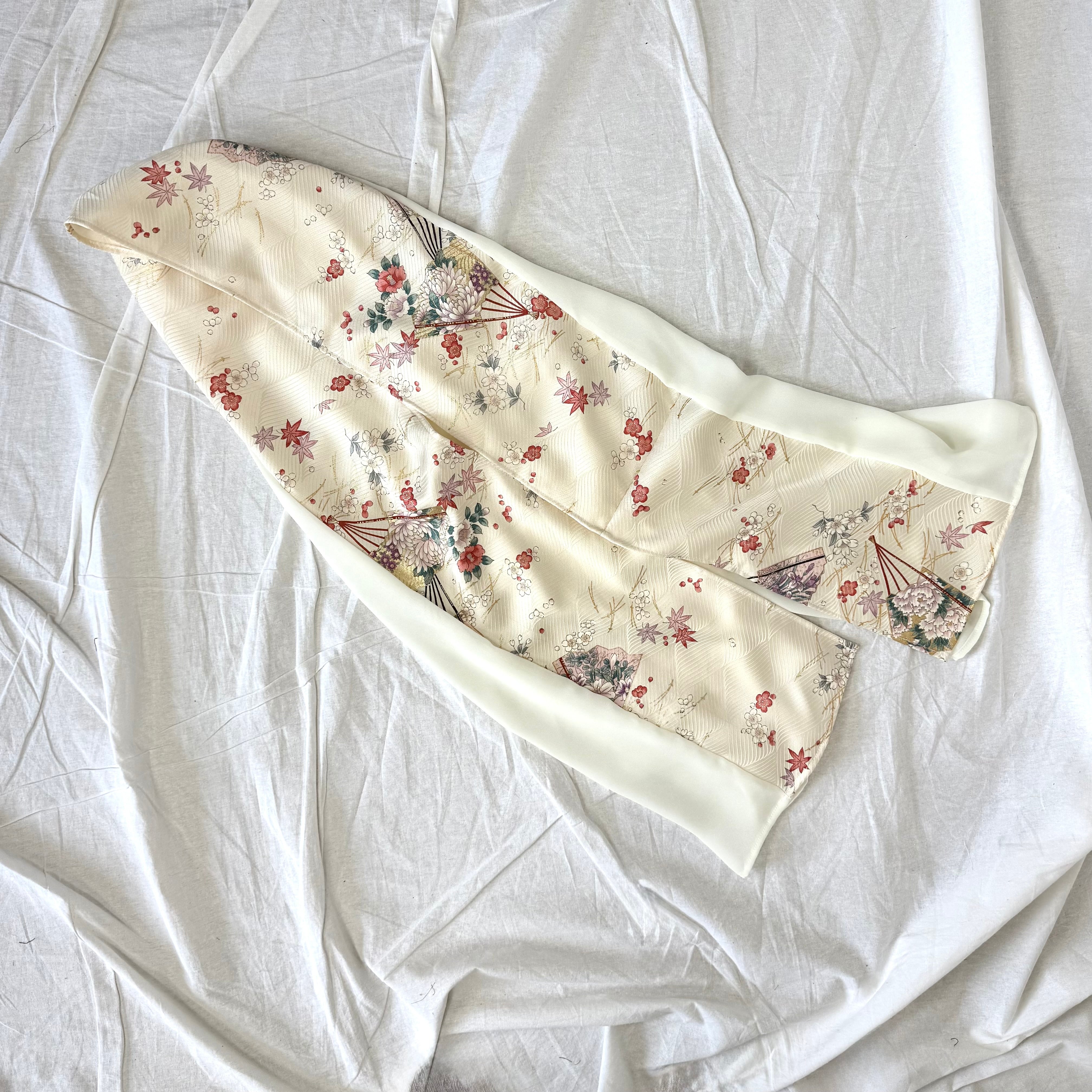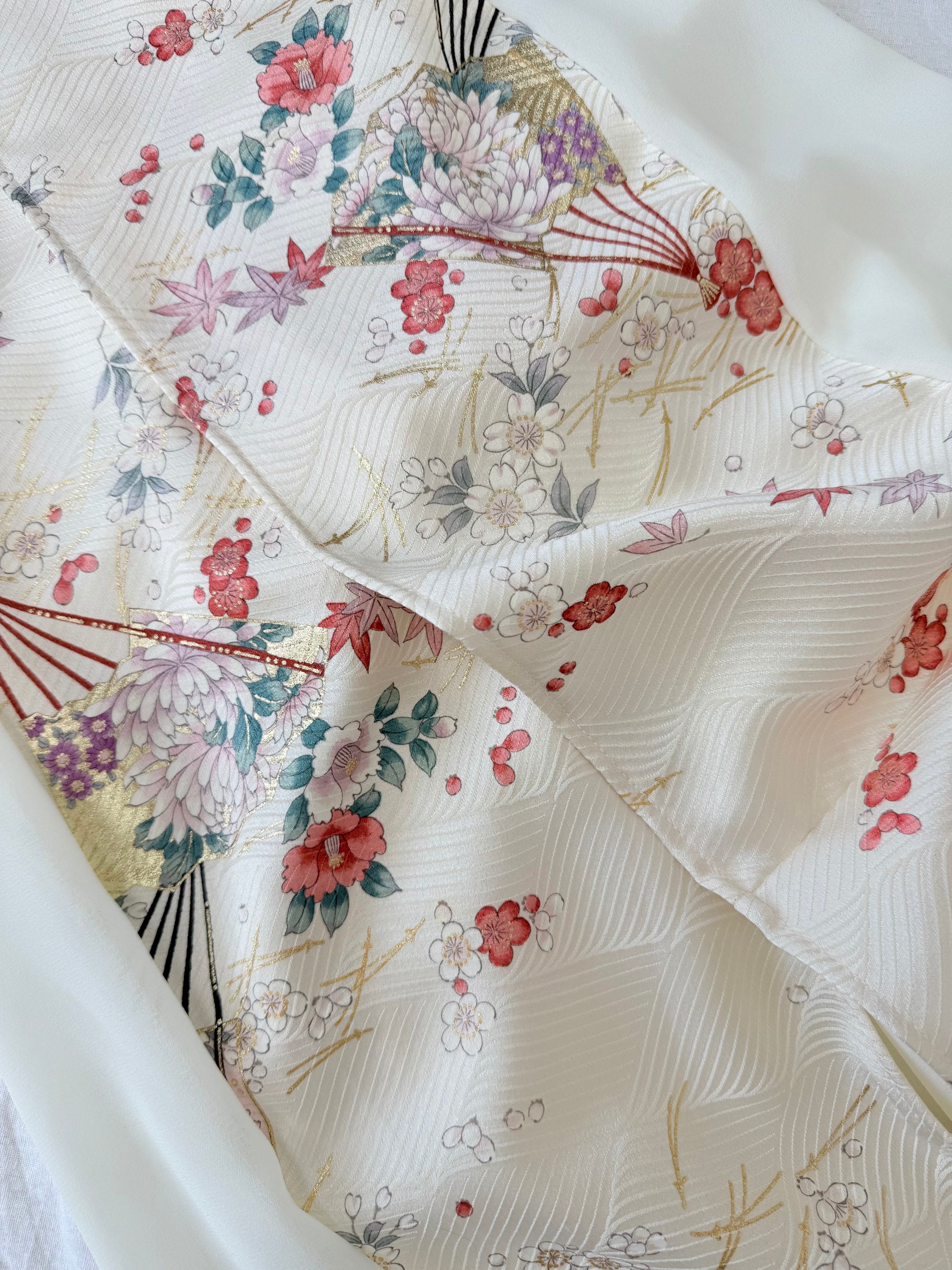 This hijab is made from a kimono hand-painted with cherry blossoms and traditional fan motifs, accented with gold leaf.