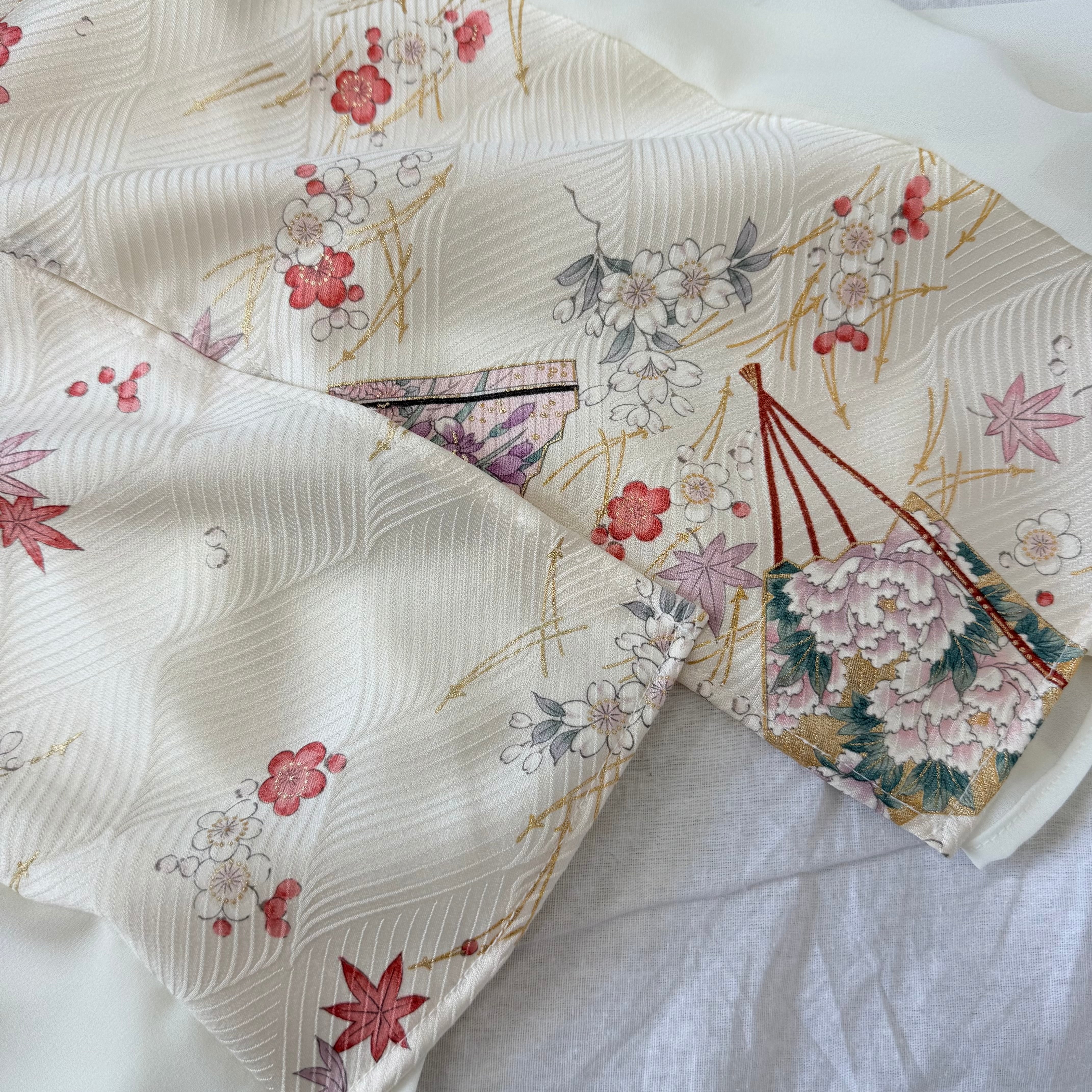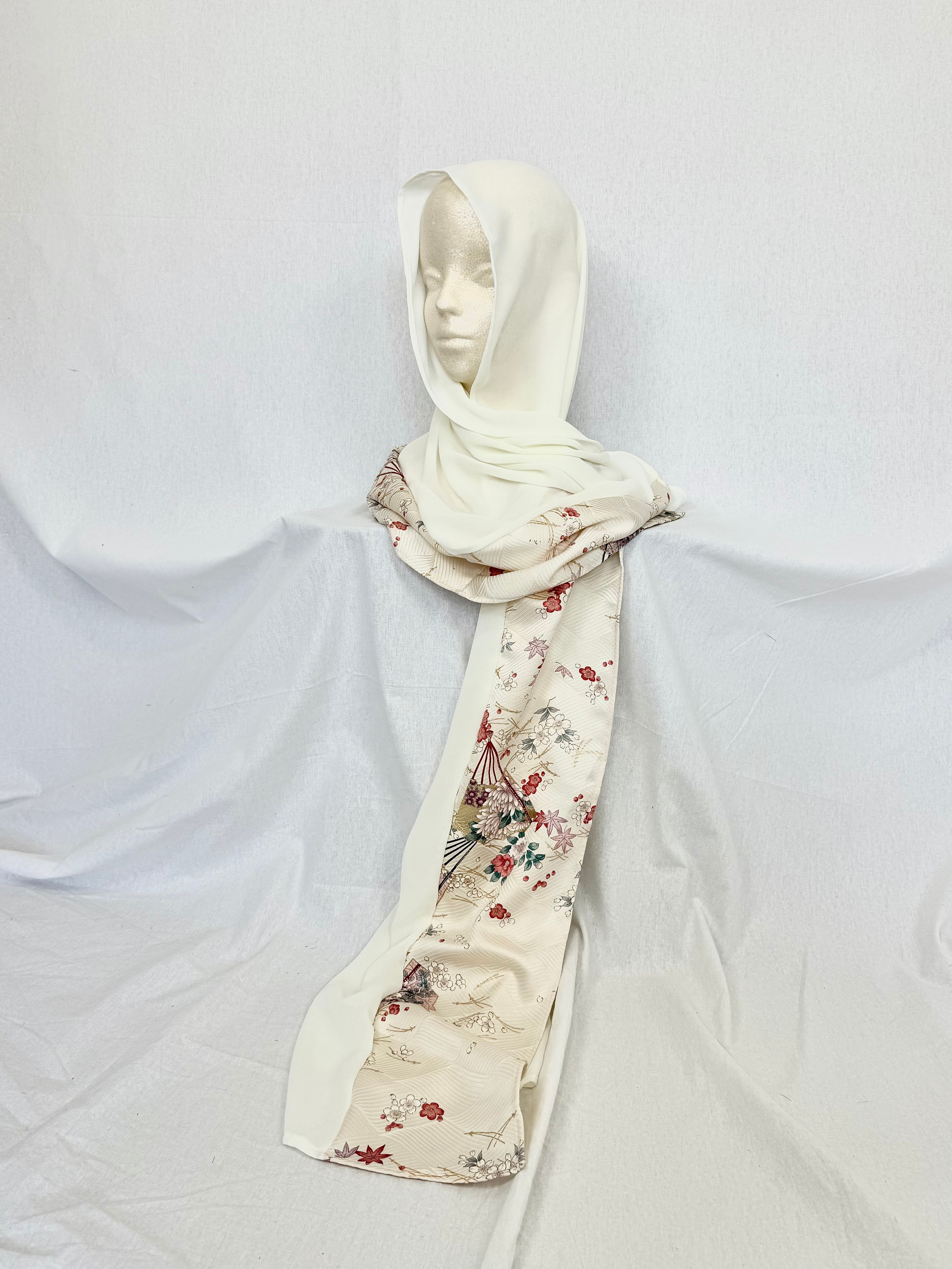 このヒジャーブは桜と扇子文様が金箔と共に手描きで描かれた着物から作られています。