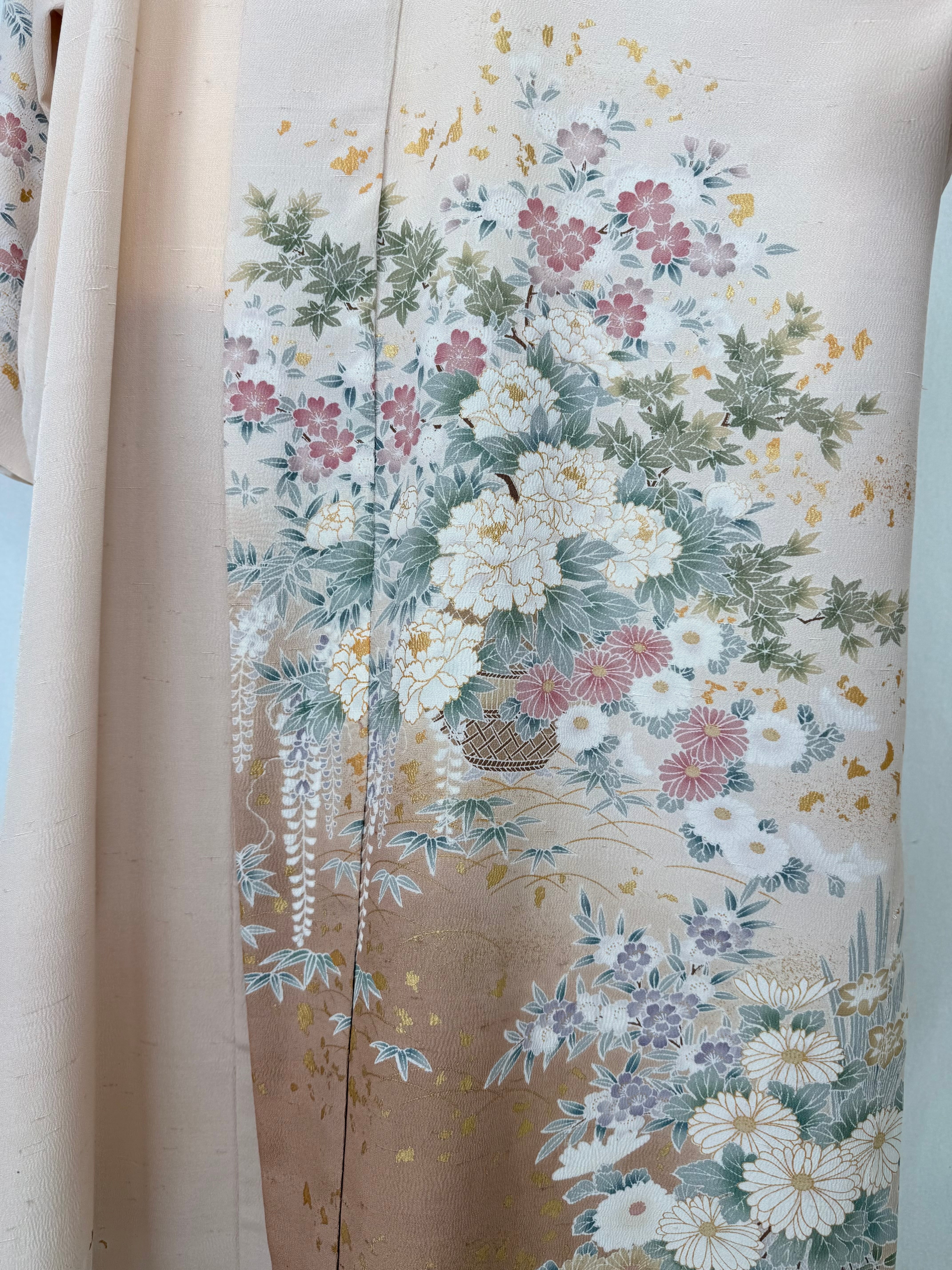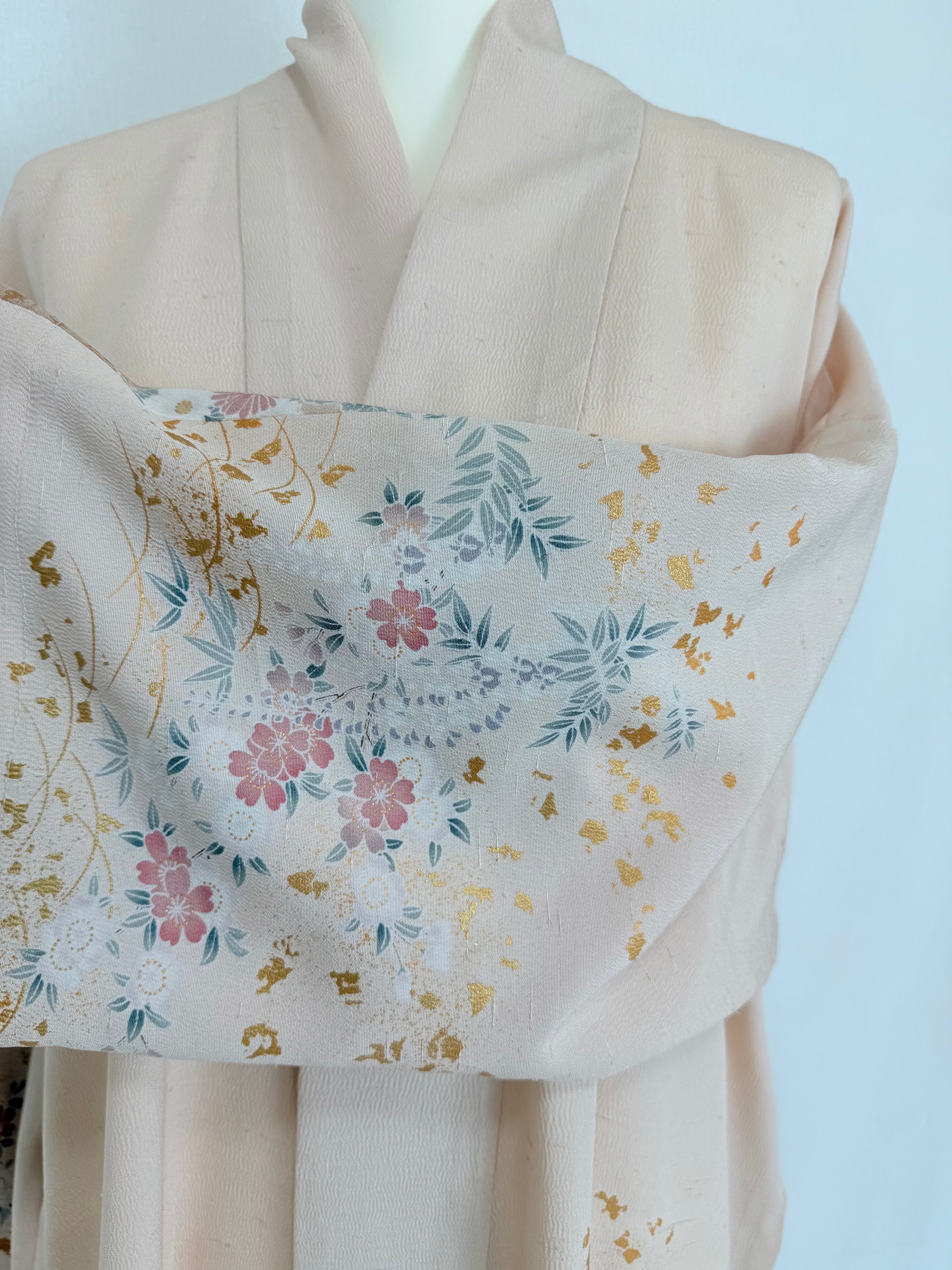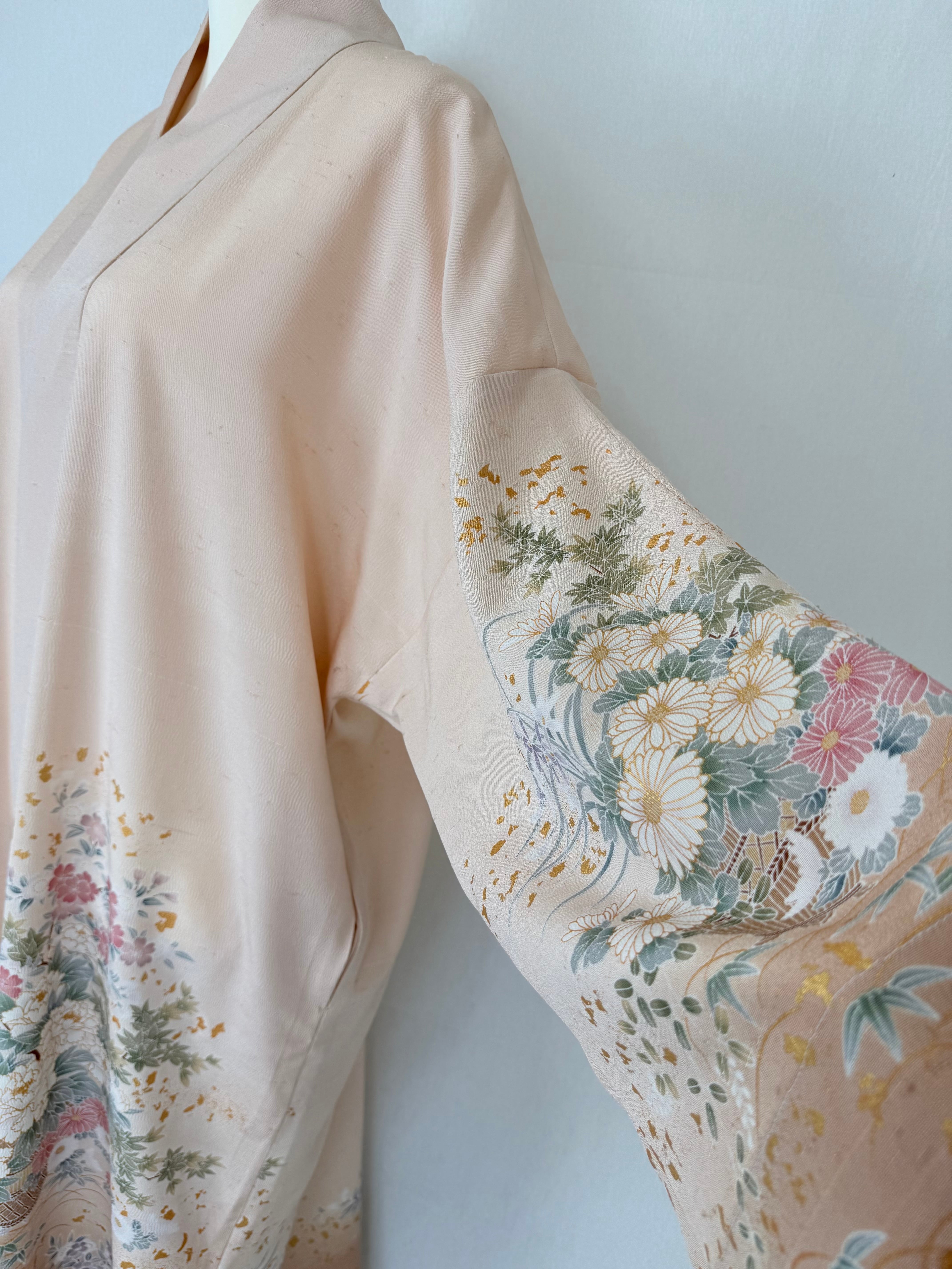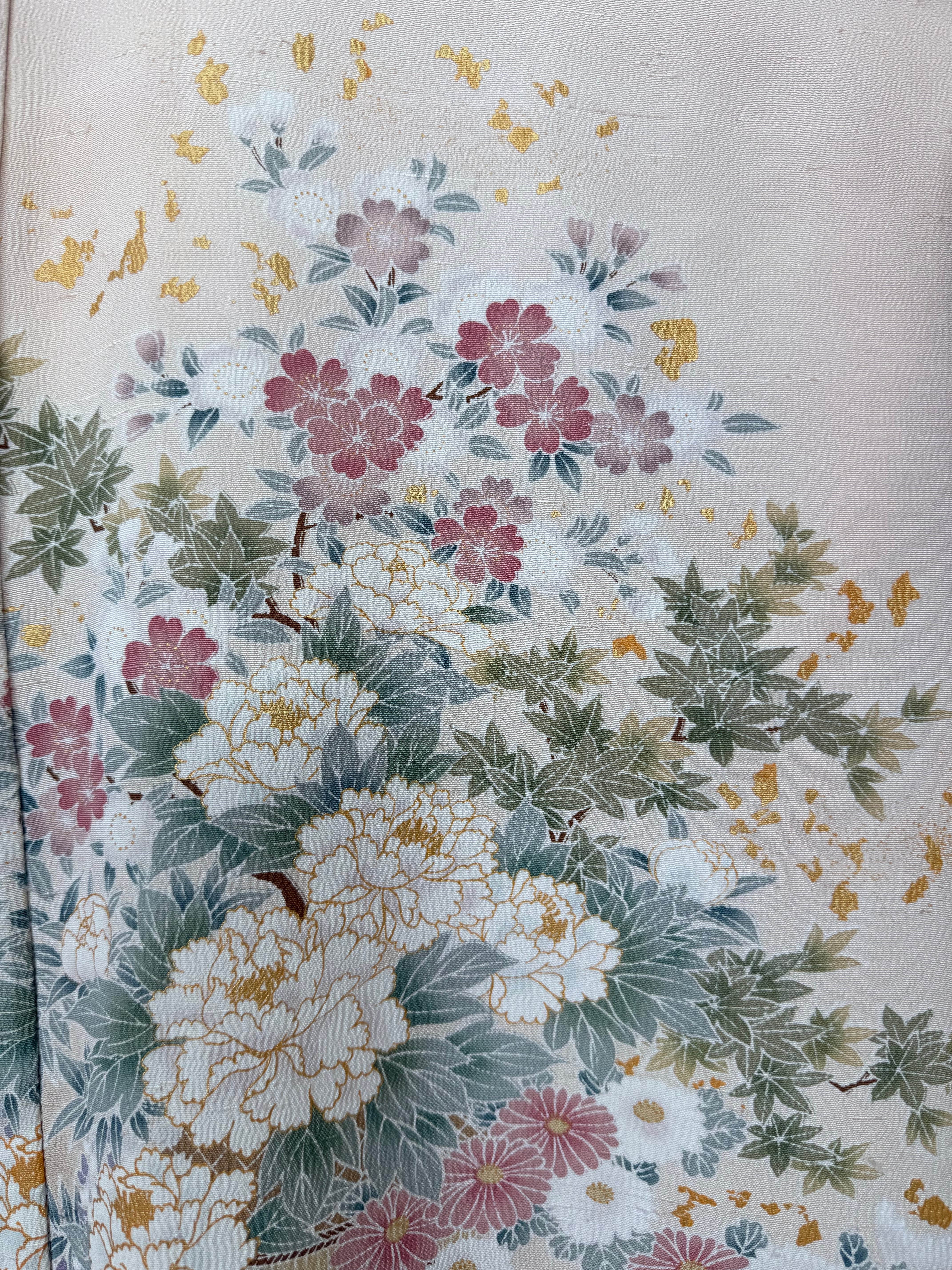 This abaya is made from a kimono featuring a beautiful design of cherry blossoms and peonies, adorned with gold leaf.