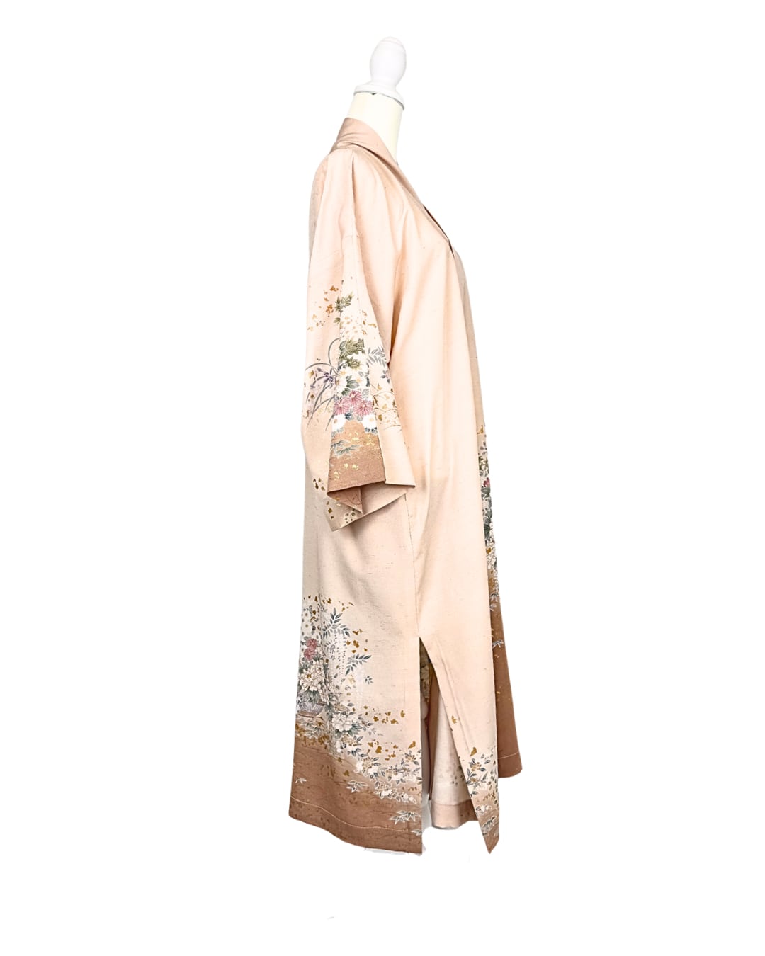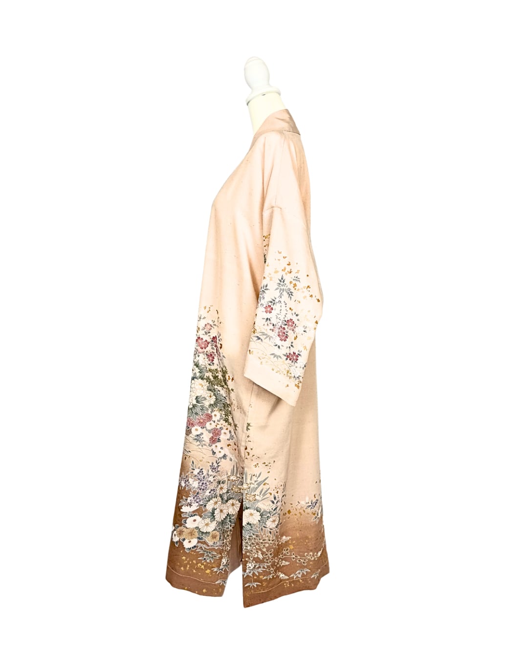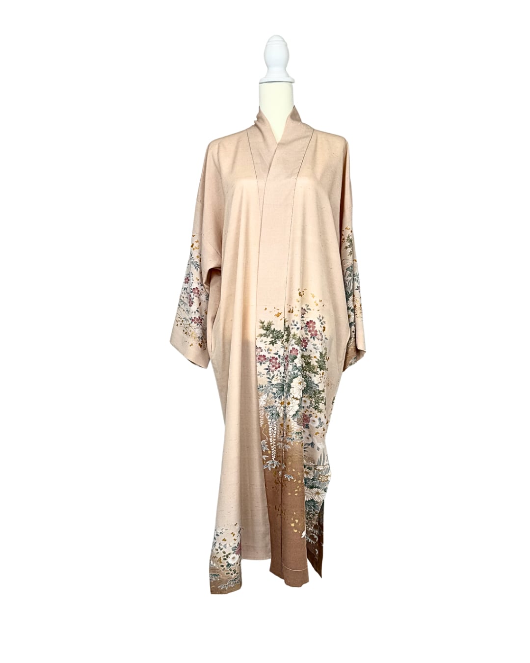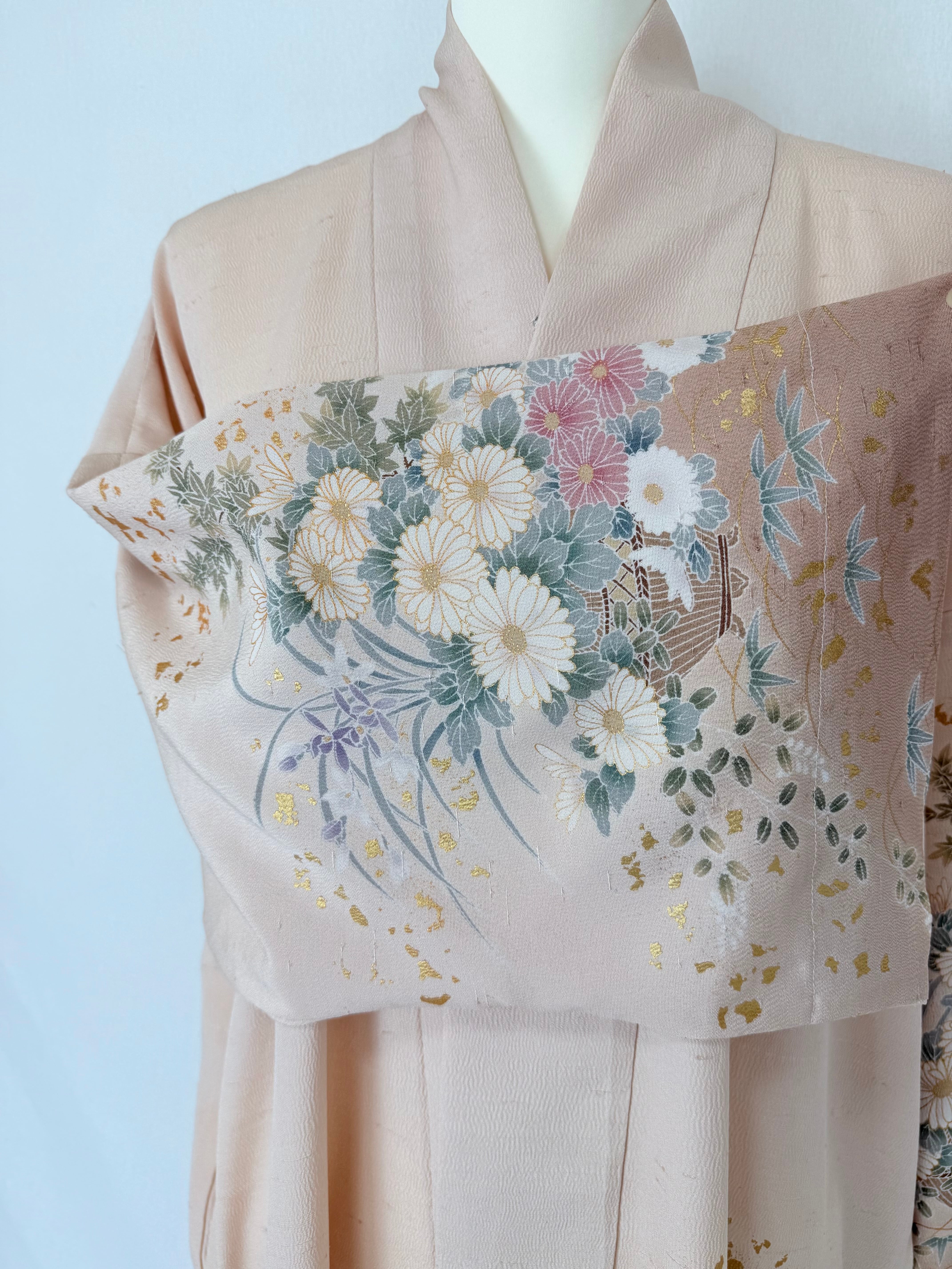 This abaya is made from a kimono featuring a beautiful design of cherry blossoms and peonies, adorned with gold leaf.