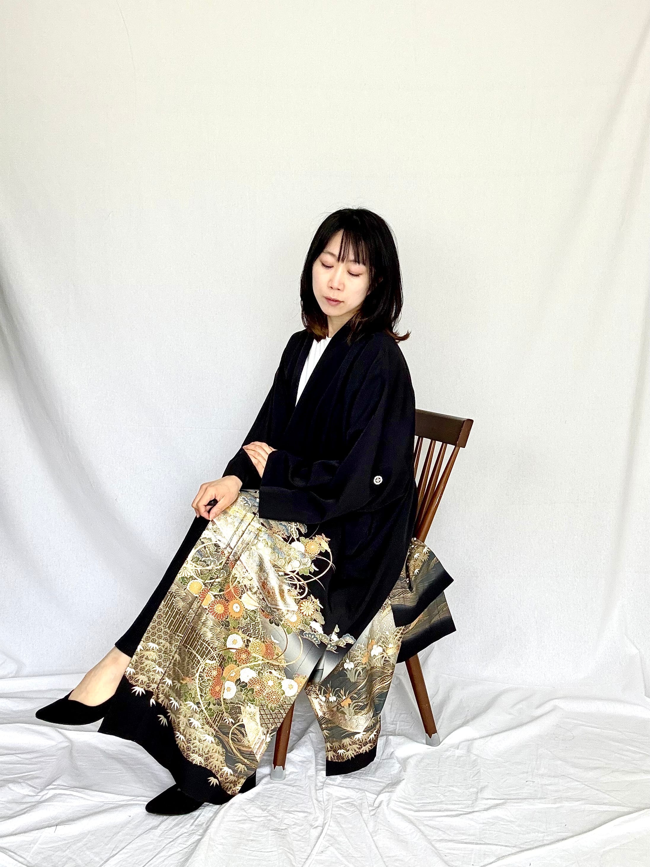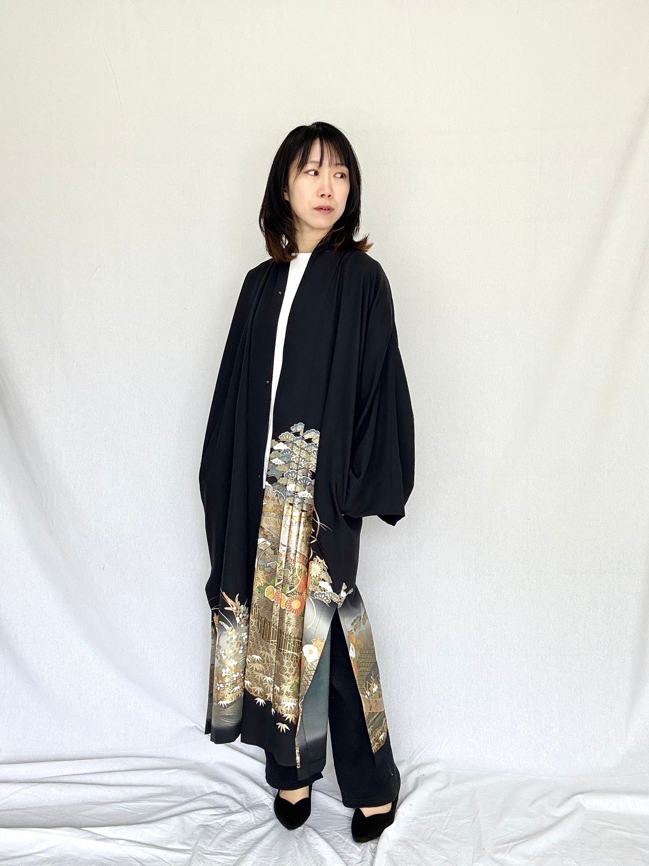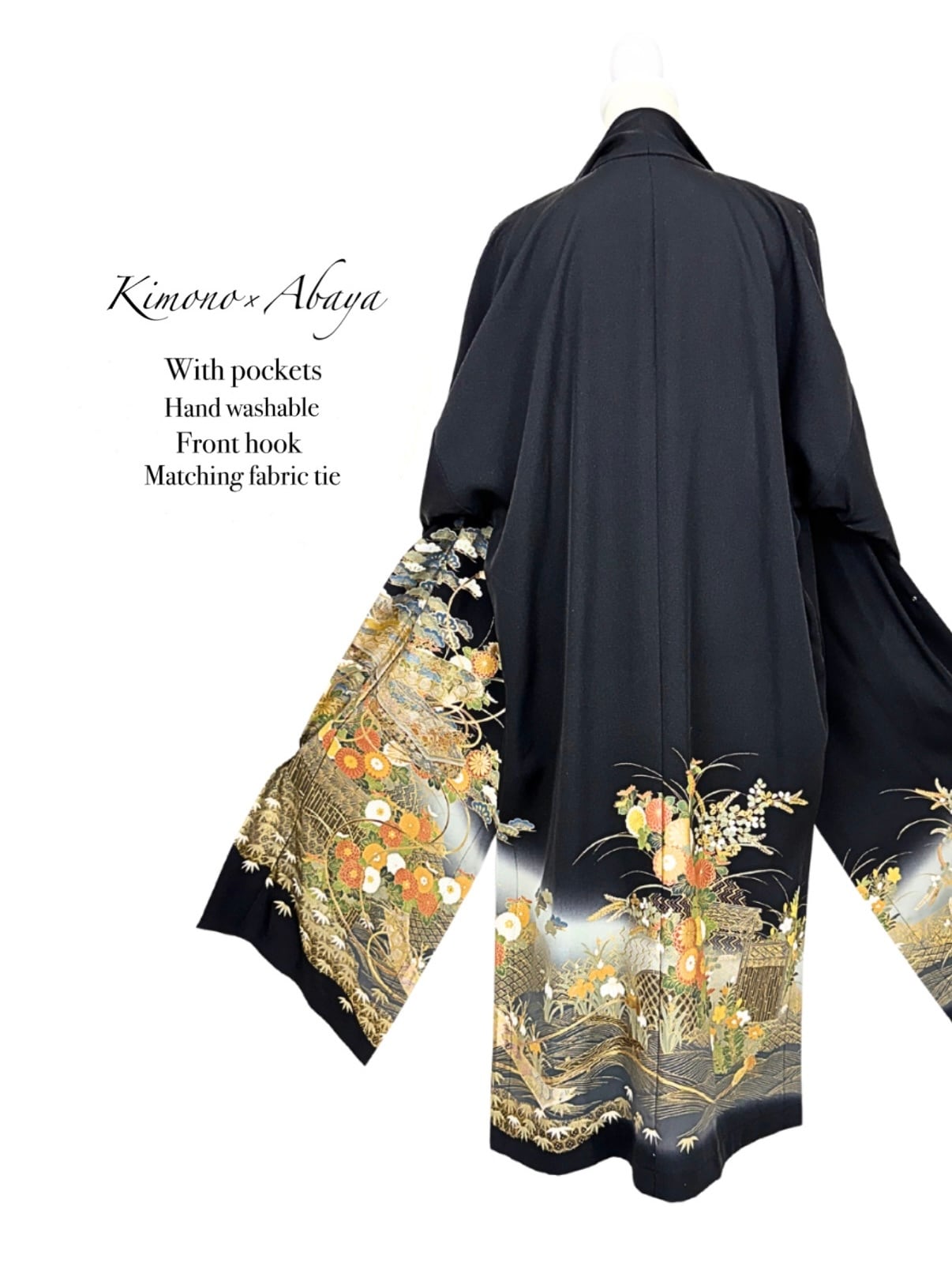 This abaya is crafted from a black kurotomesode kimono adorned with luxurious gold-leaf floral designs.