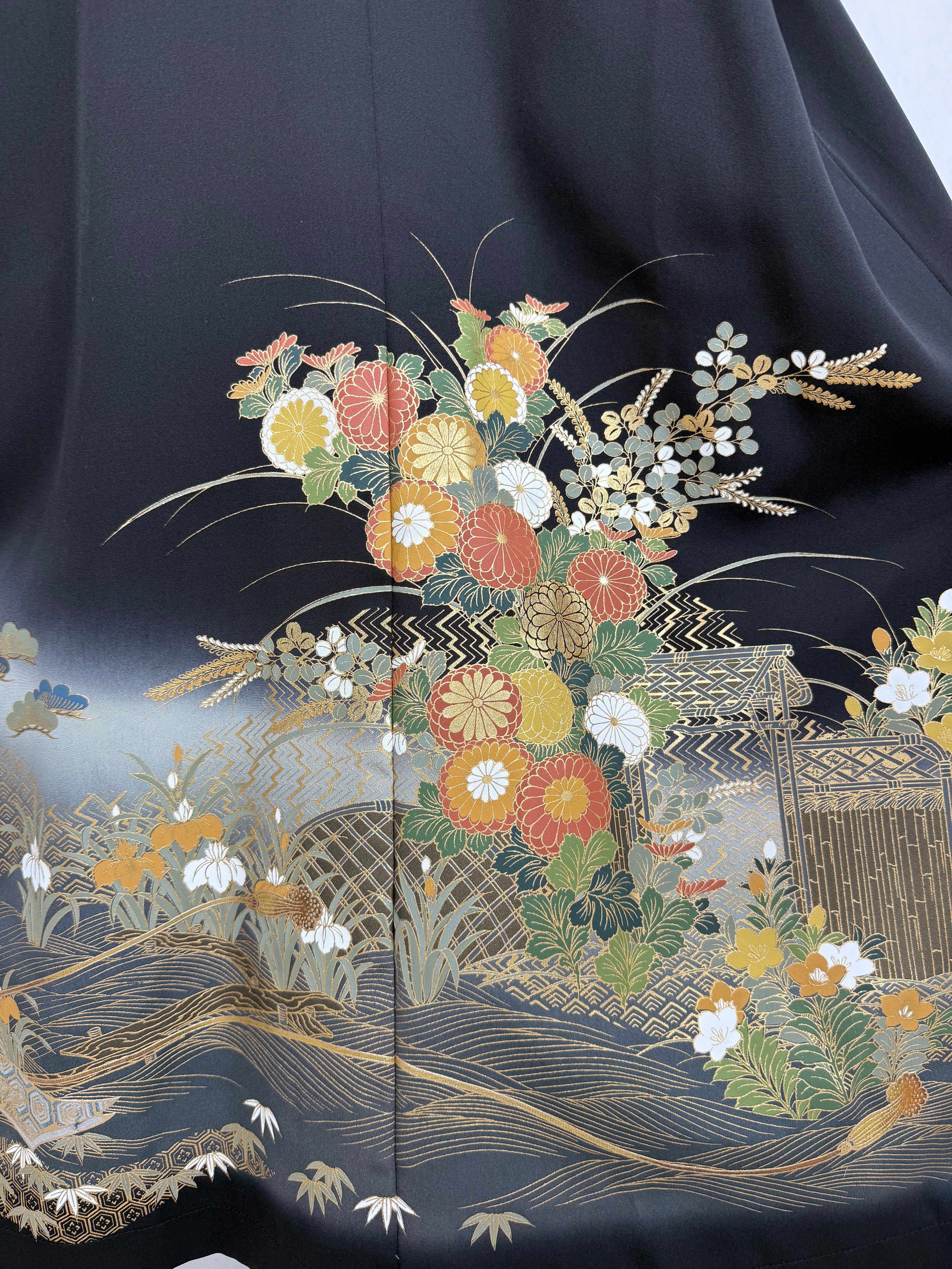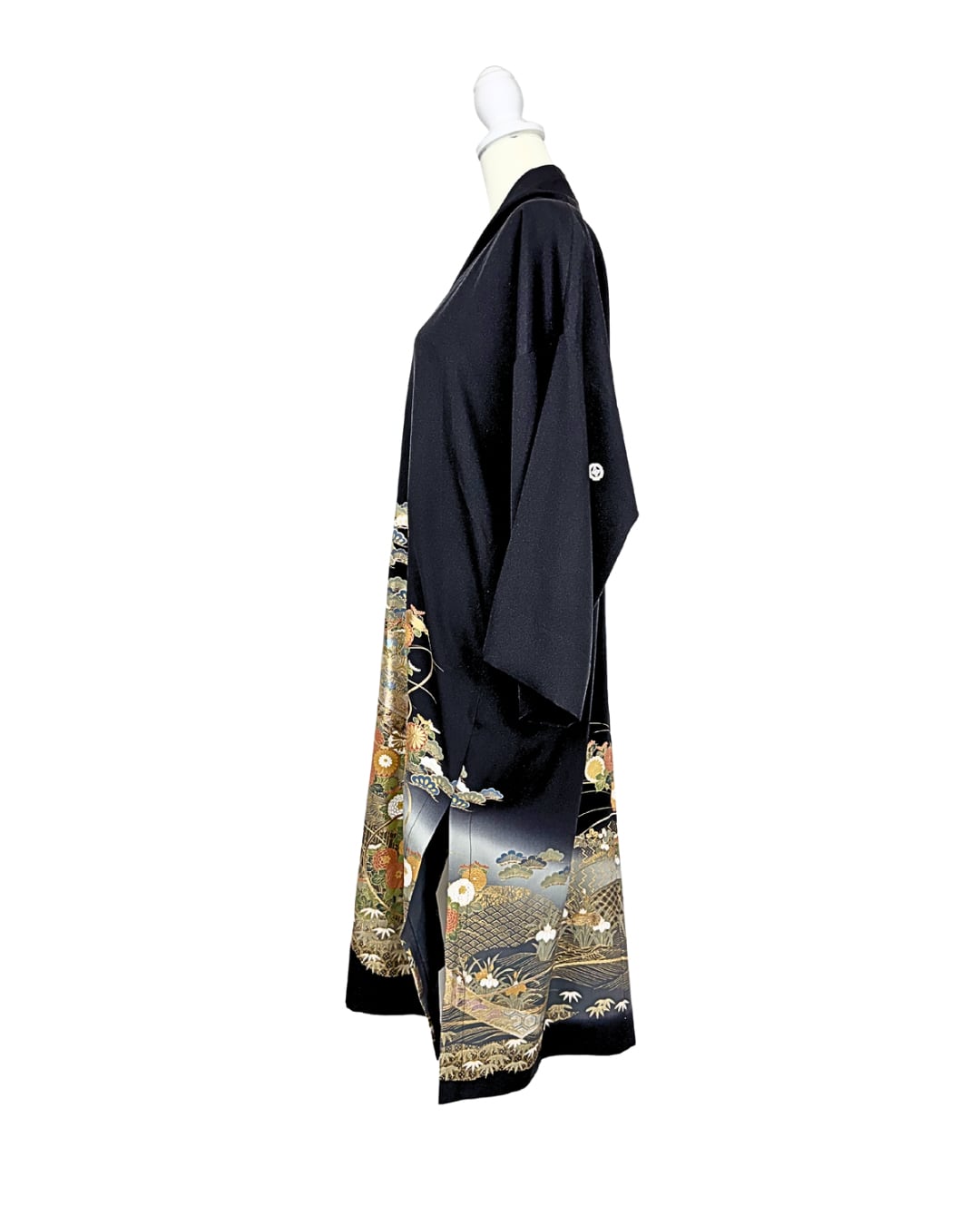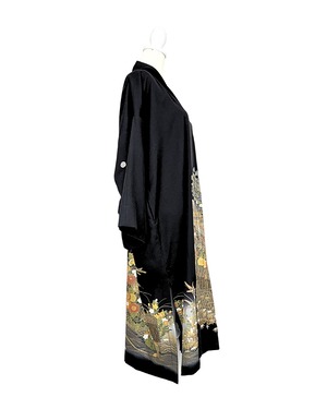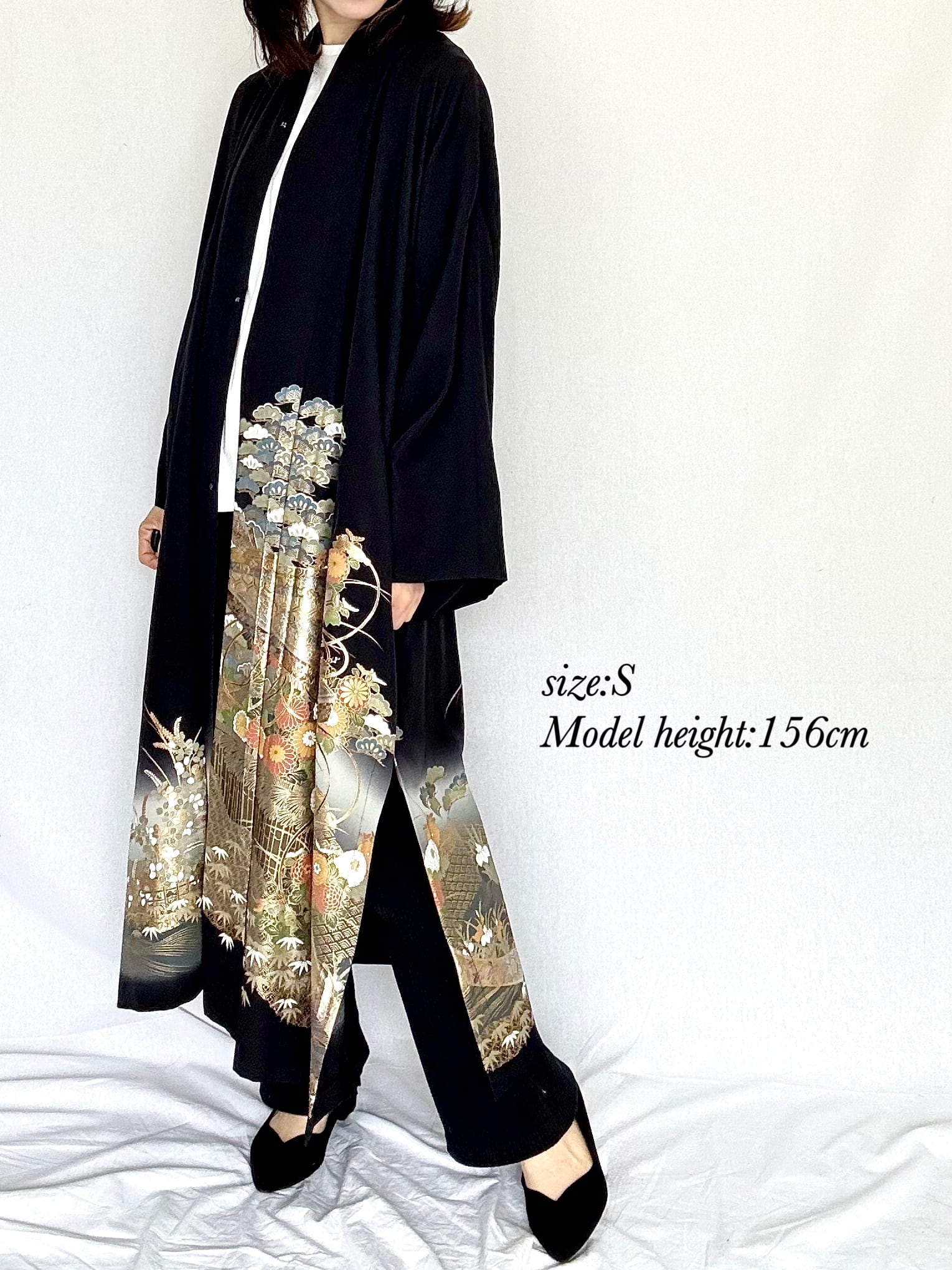 This abaya is crafted from a black kurotomesode kimono adorned with luxurious gold-leaf floral designs.
