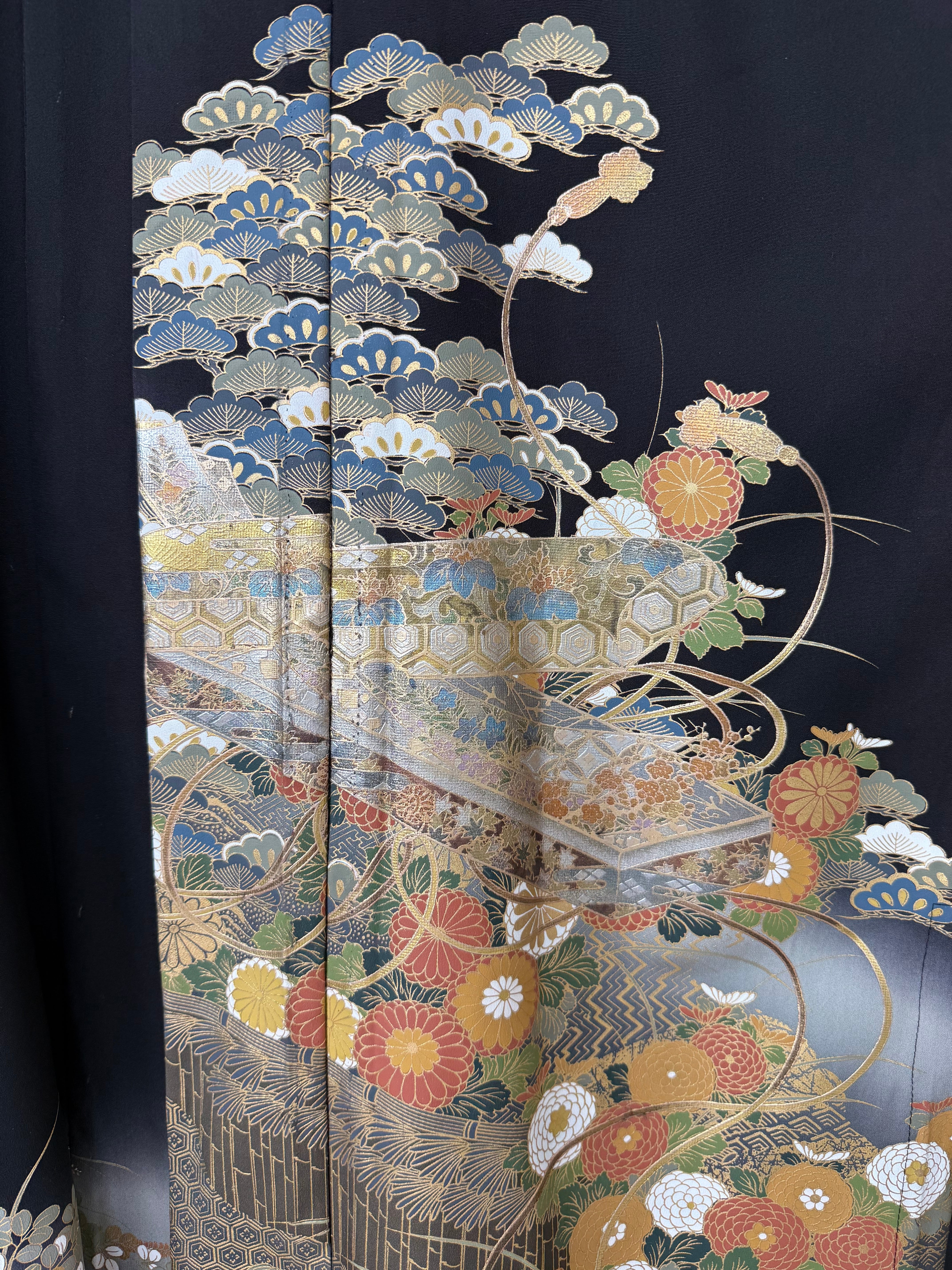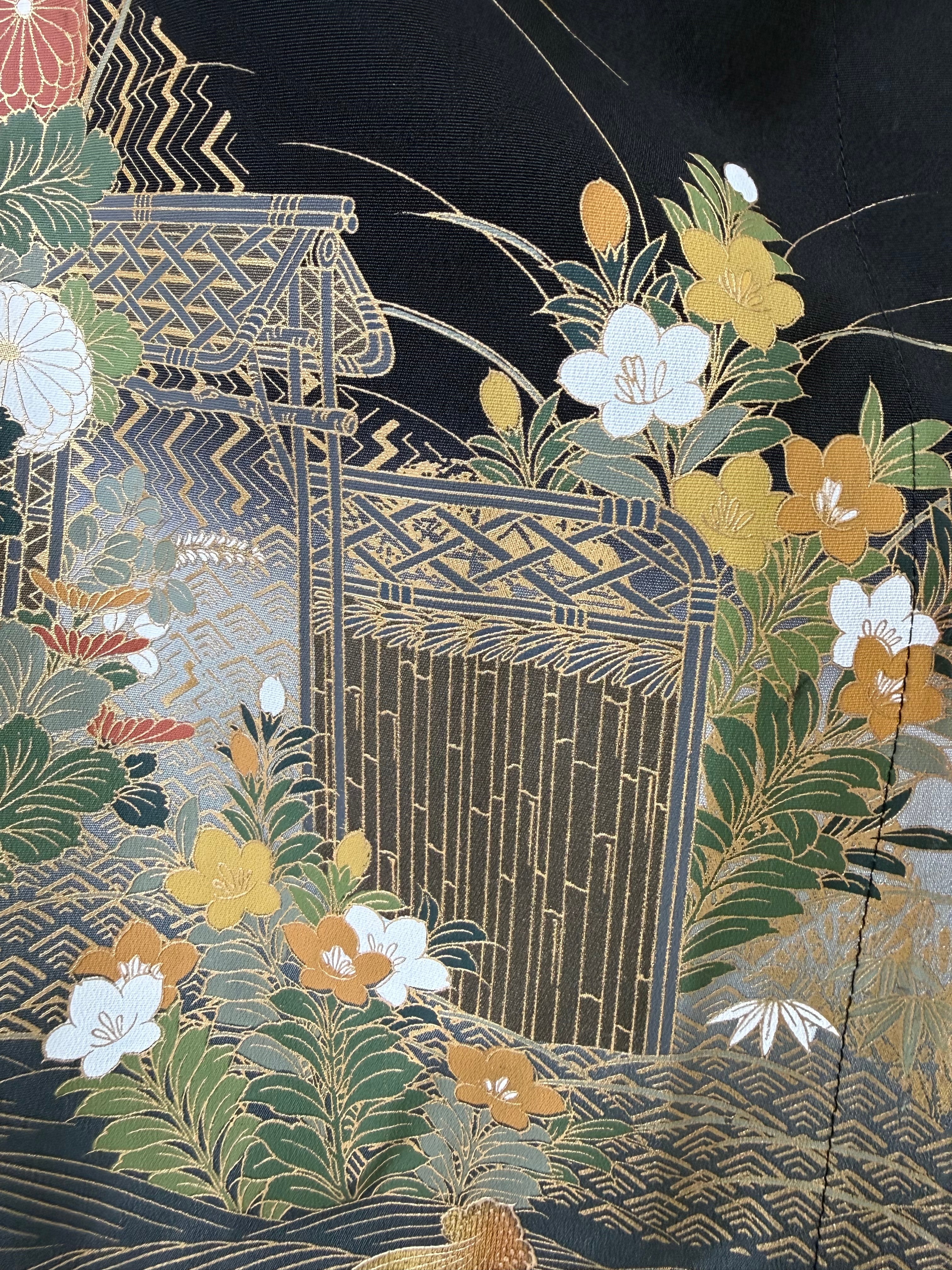 このアバヤは豪華な金箔で花々などが描かれた黒留袖着物から作られました。