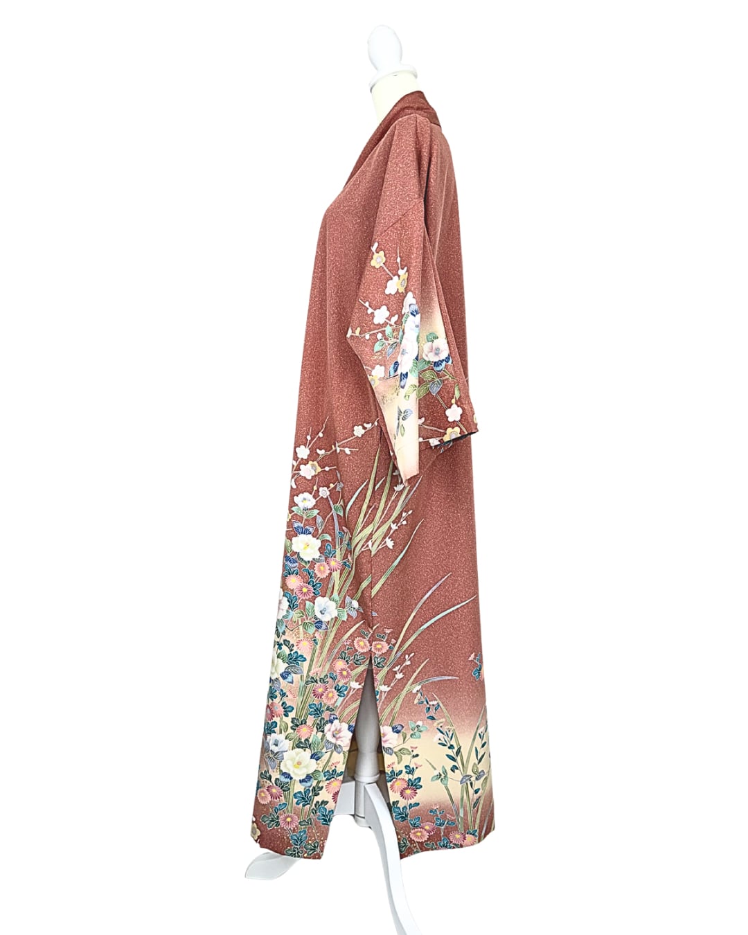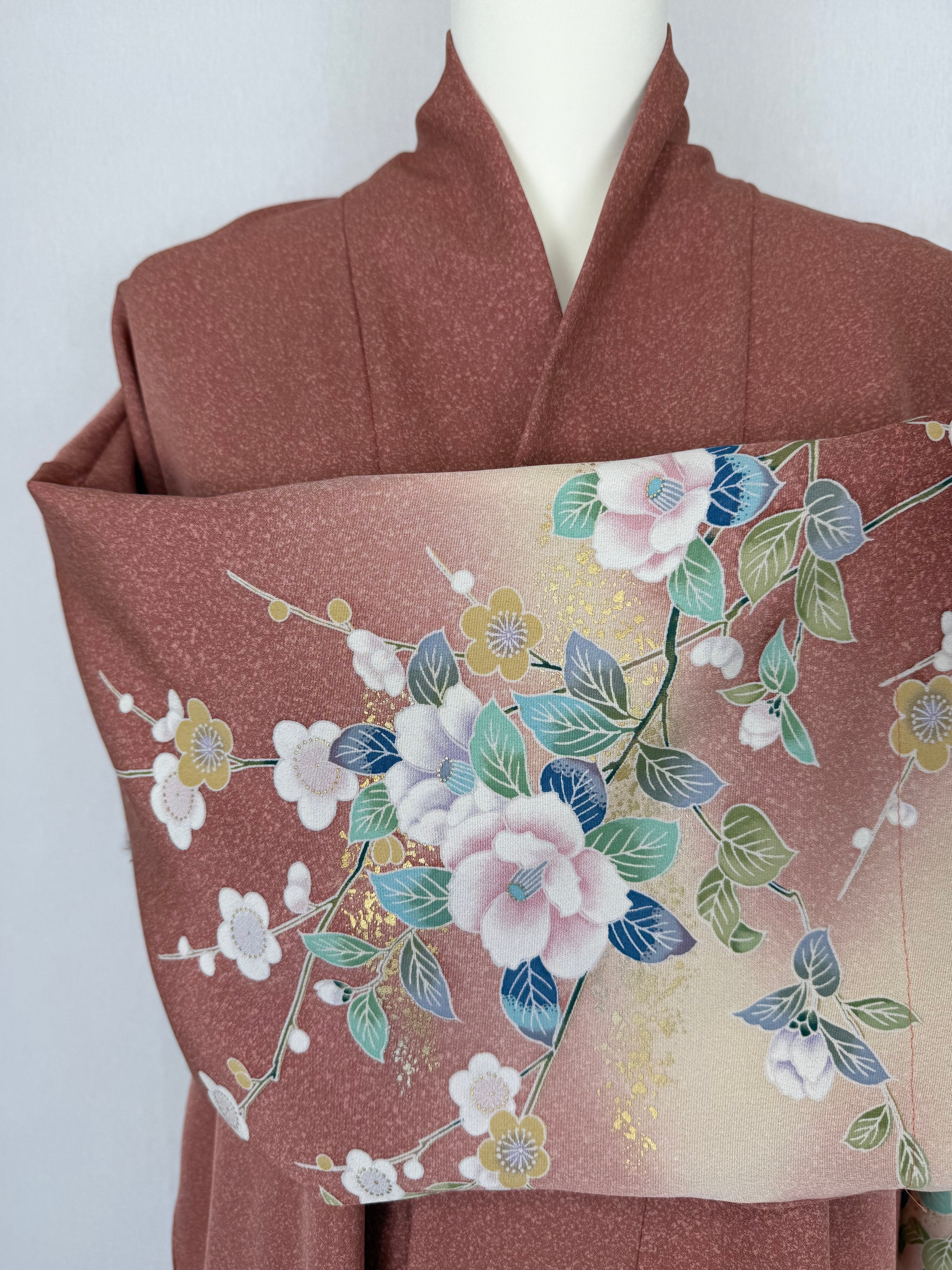 This abaya is made from a kimono hand-painted using the Yuzen dyeing technique, featuring flowers such as peonies, camellias, and plum blossoms.