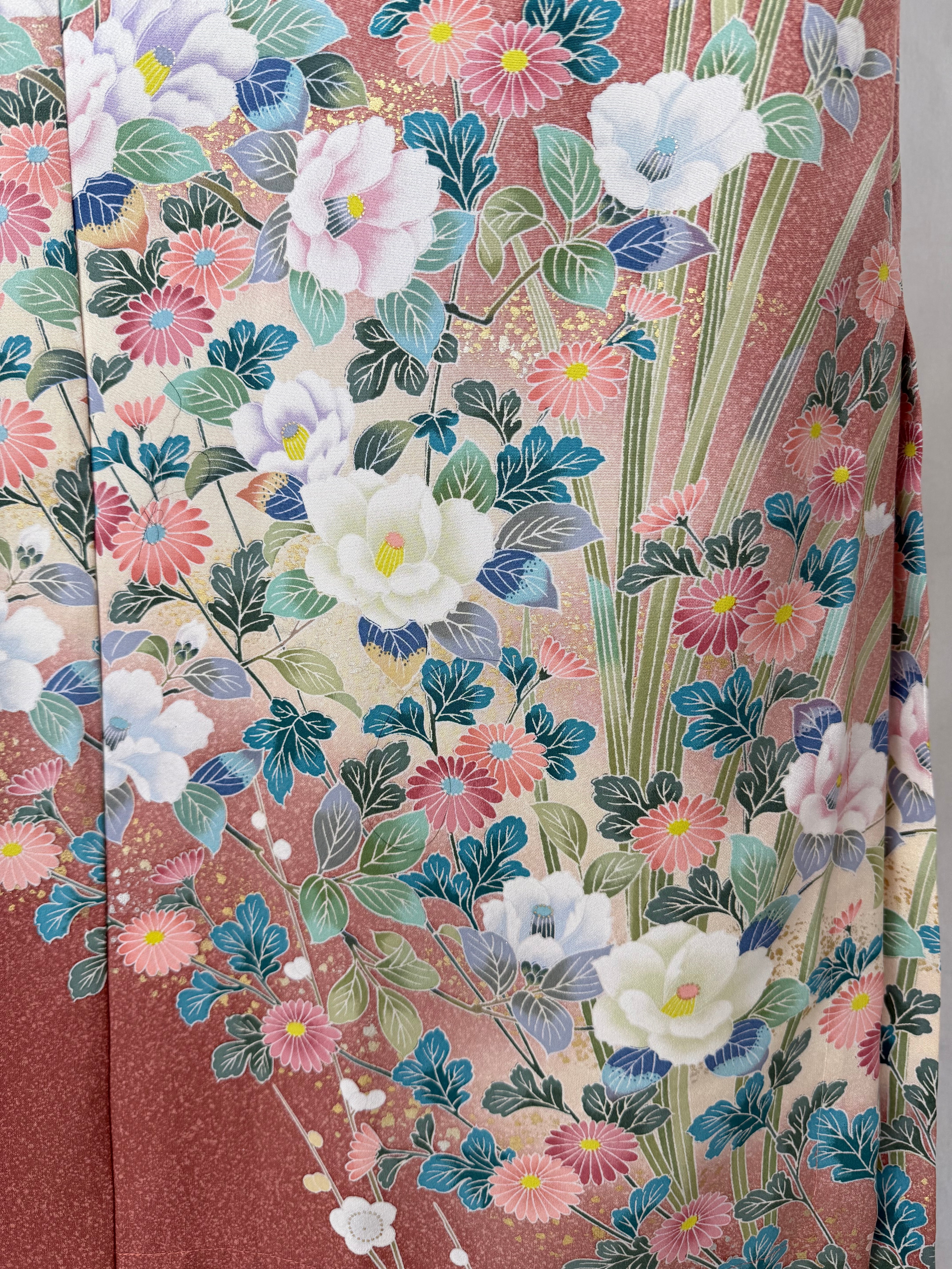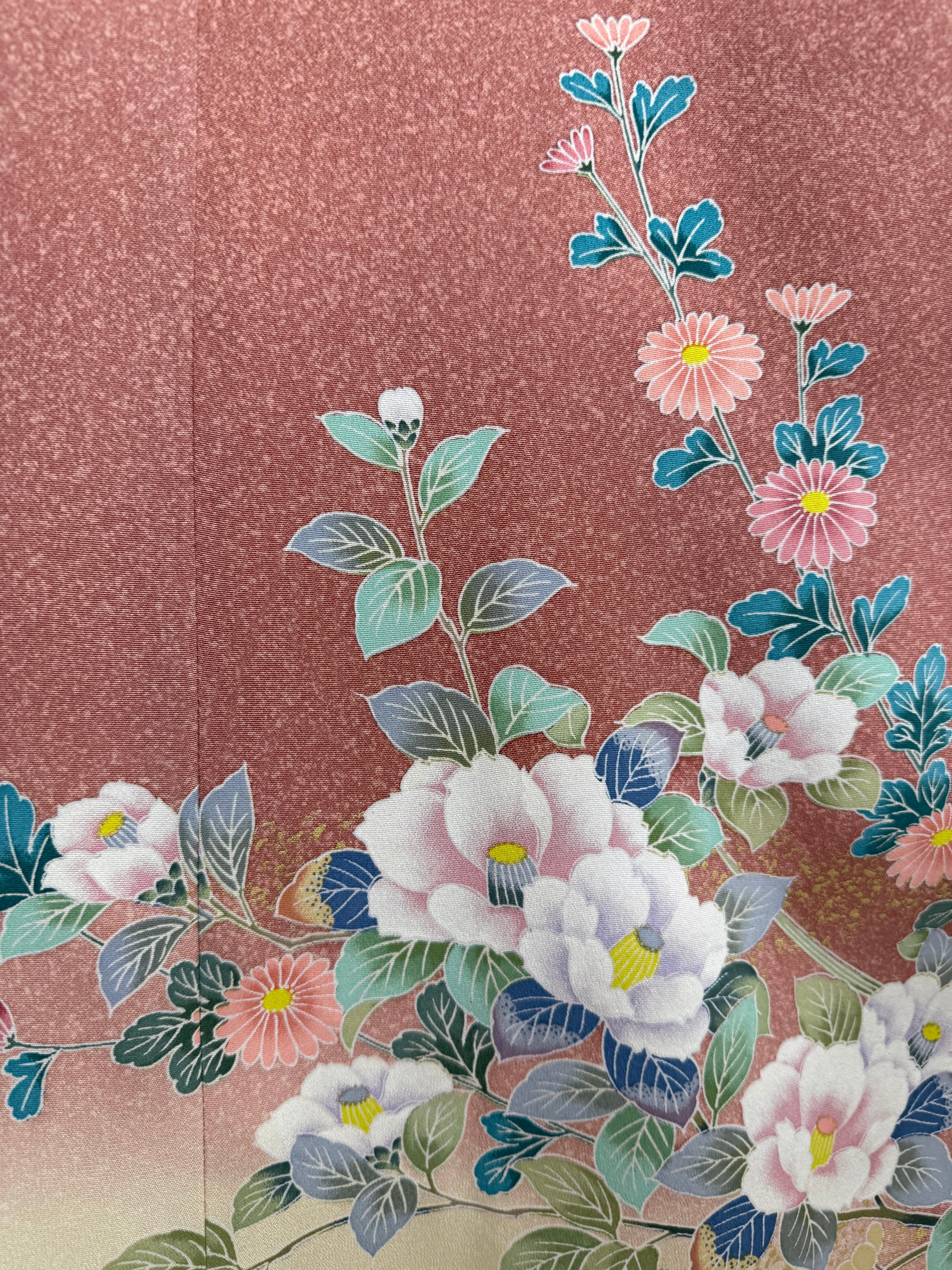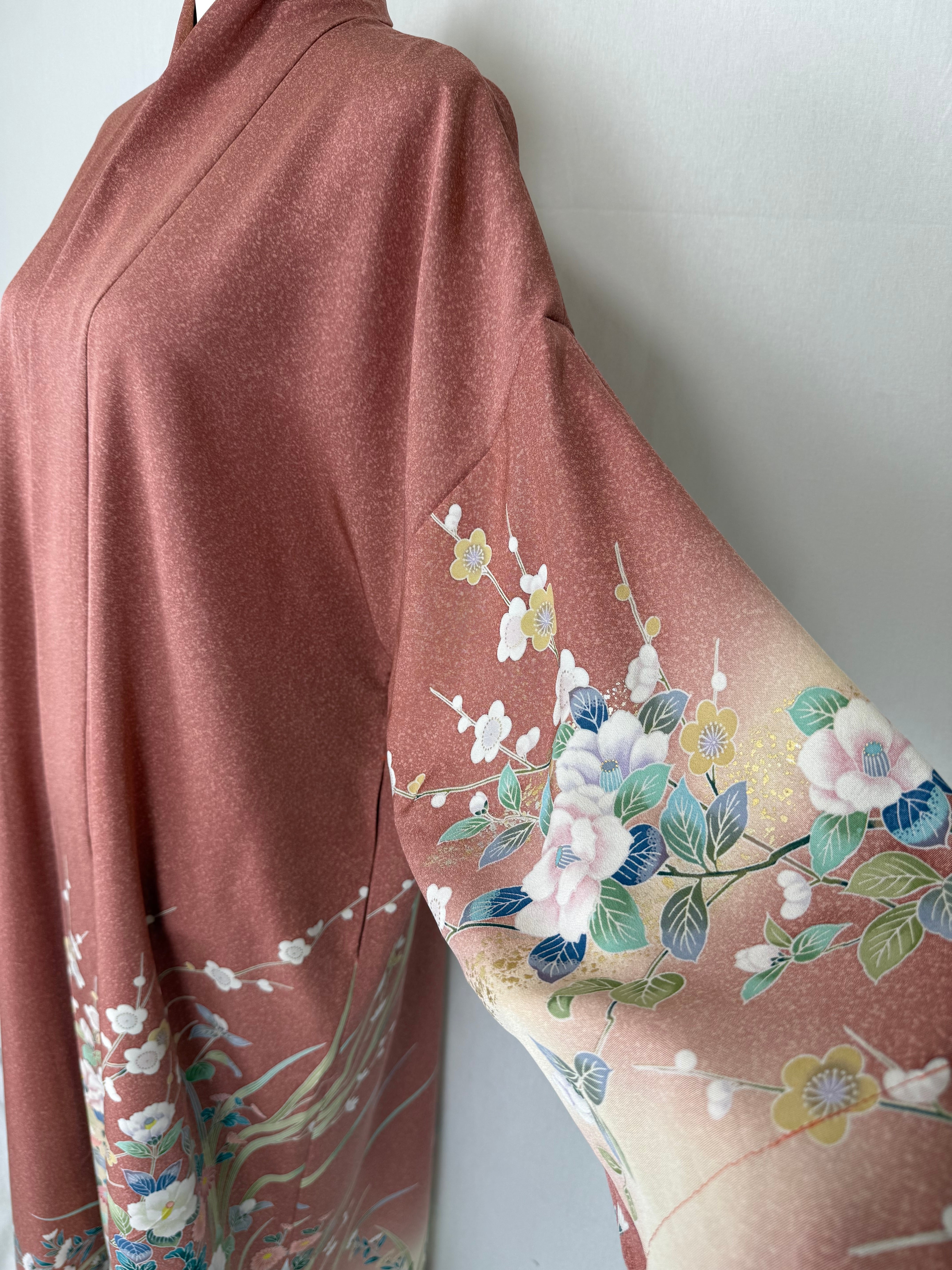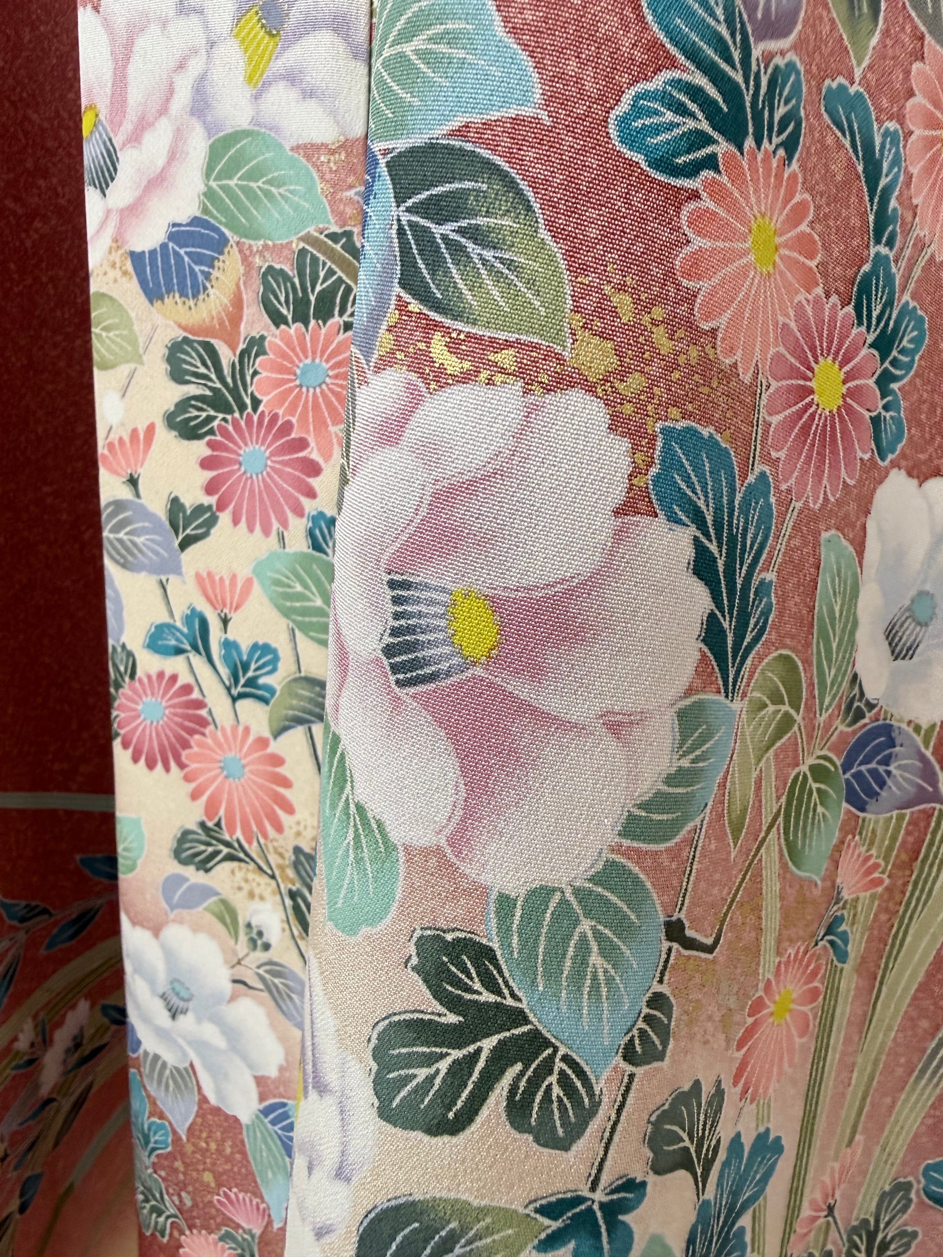 このアバヤは芍薬や椿、梅などの花々が友禅染の手法で手描きで描かれた着物から作られています。見事な染めの技術、色合いの変化も楽しめる着物アバヤです