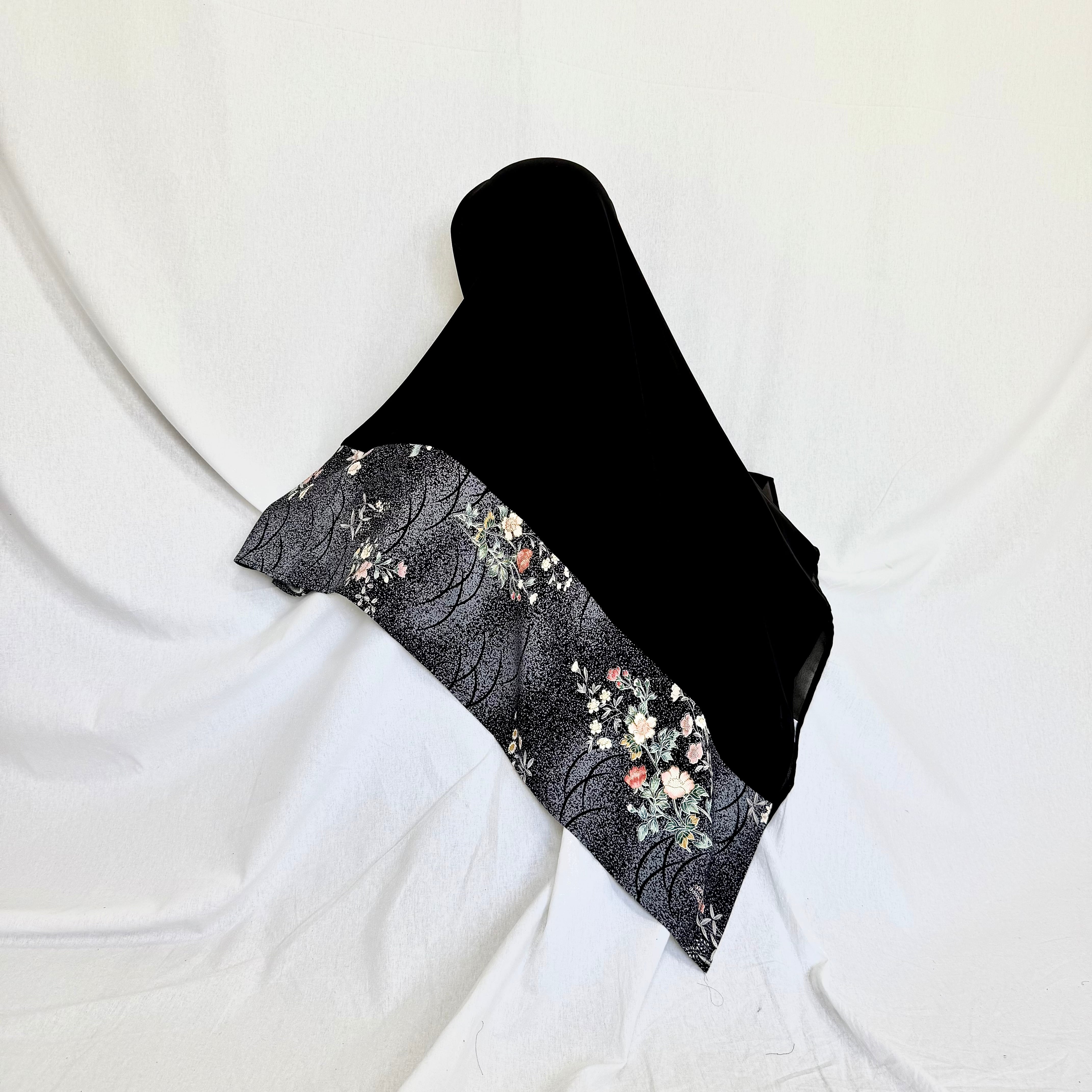 This hijab is made from a kimono crafted with fabric dyed using the traditional Japanese technique *Tataki-zome* and decorated with a cherry blossom motif.