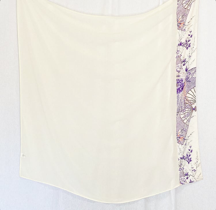 This hijab was made from a furisode kimono with a purple peonies and sensu(Japanese fan) patterns. This kimono is very vibrant, featuring extensive use of gold leaf.