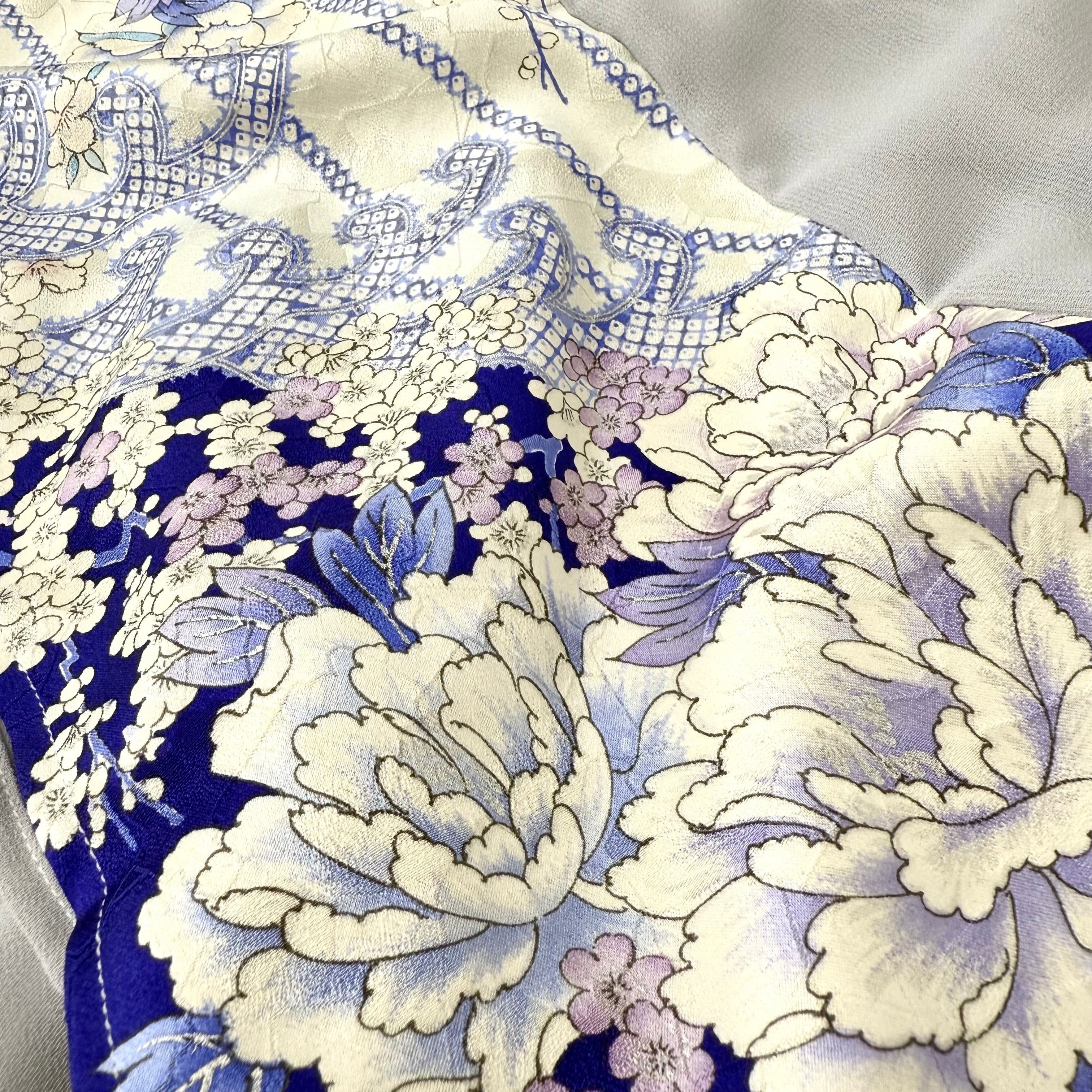 This hijab is made from a luxurious furisode kimono featuring designs of cherry blossoms, peonies, and plum blossoms, accented with silverleaf.
