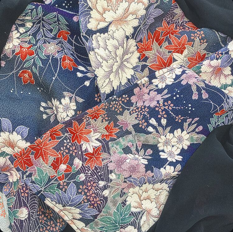 芍薬、桜、紅葉、桔梗などが豪華に描かれた柔らかいちりめん絹生地の着物から作りました。
