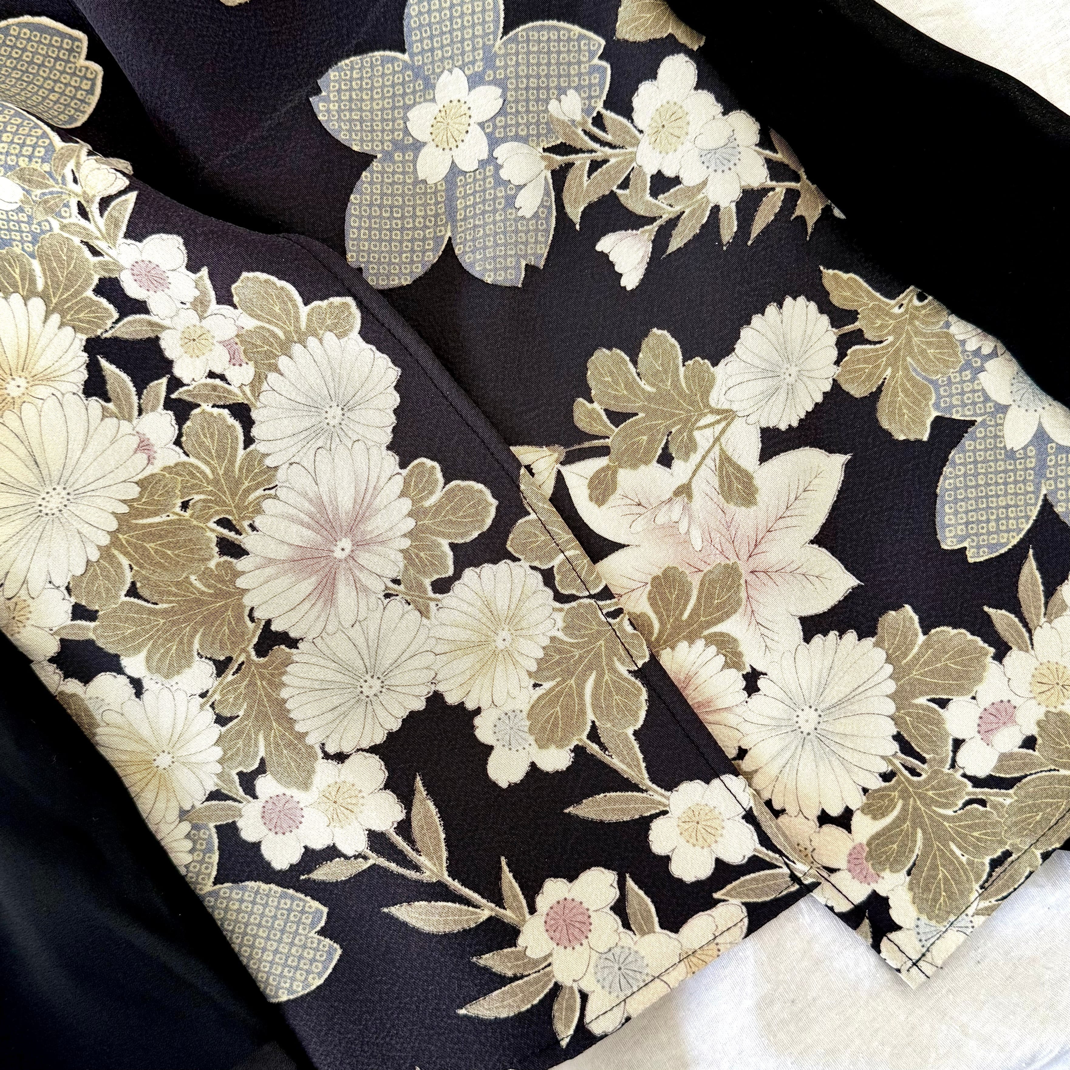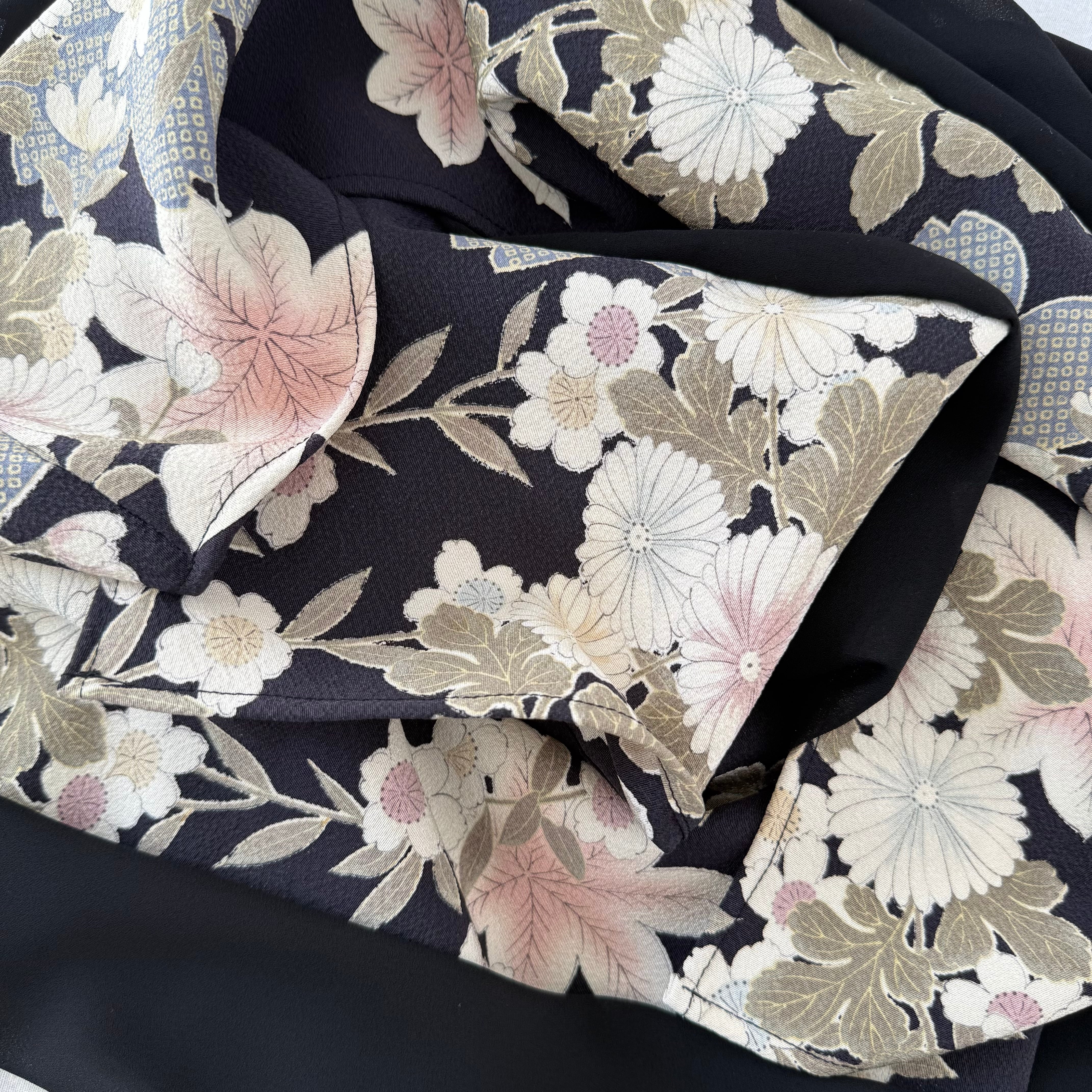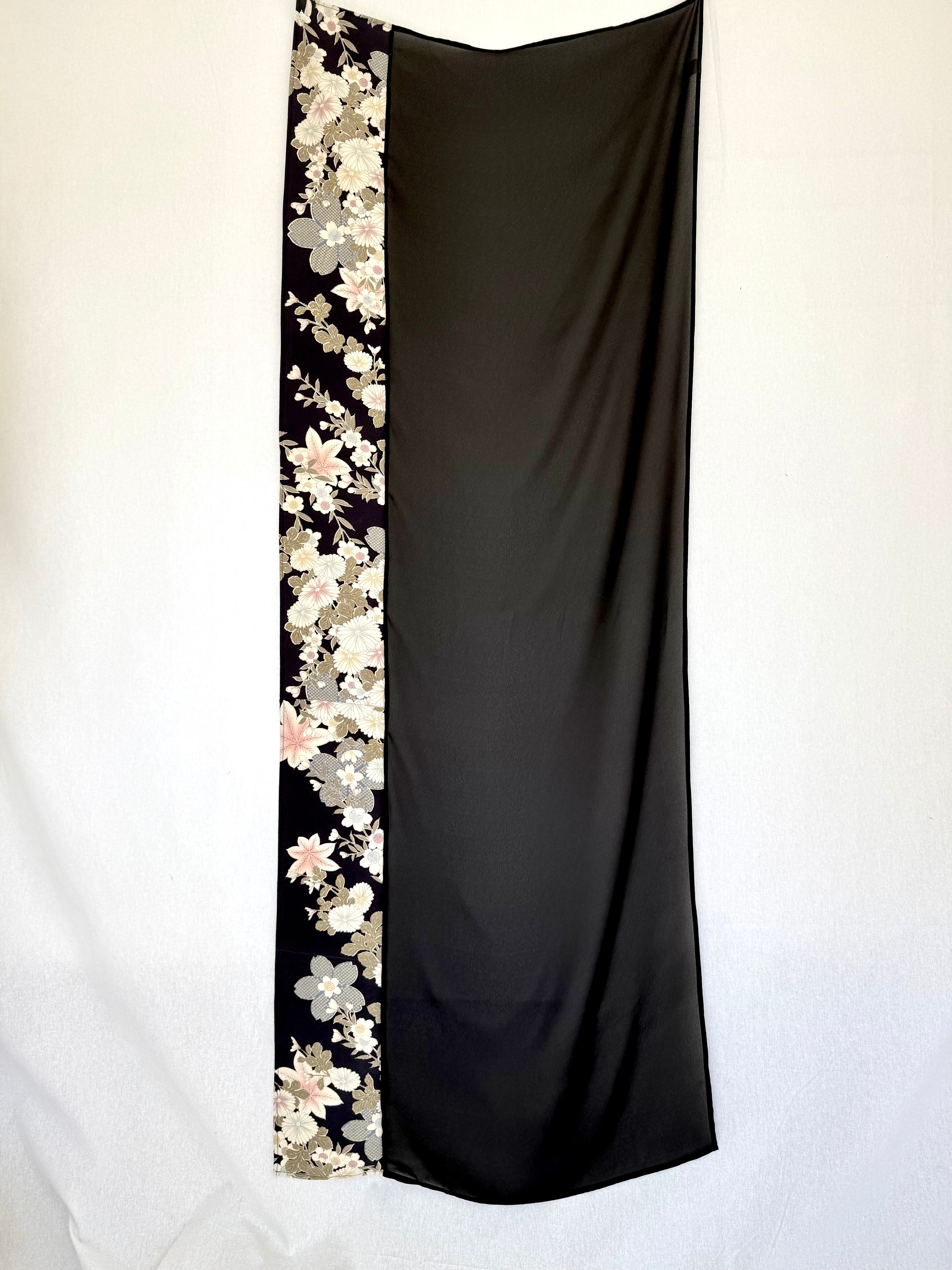 This hijab is made from a kimono featuring floral motifs, such as cherry blossoms, created using traditional Yuzen dyeing techniques.