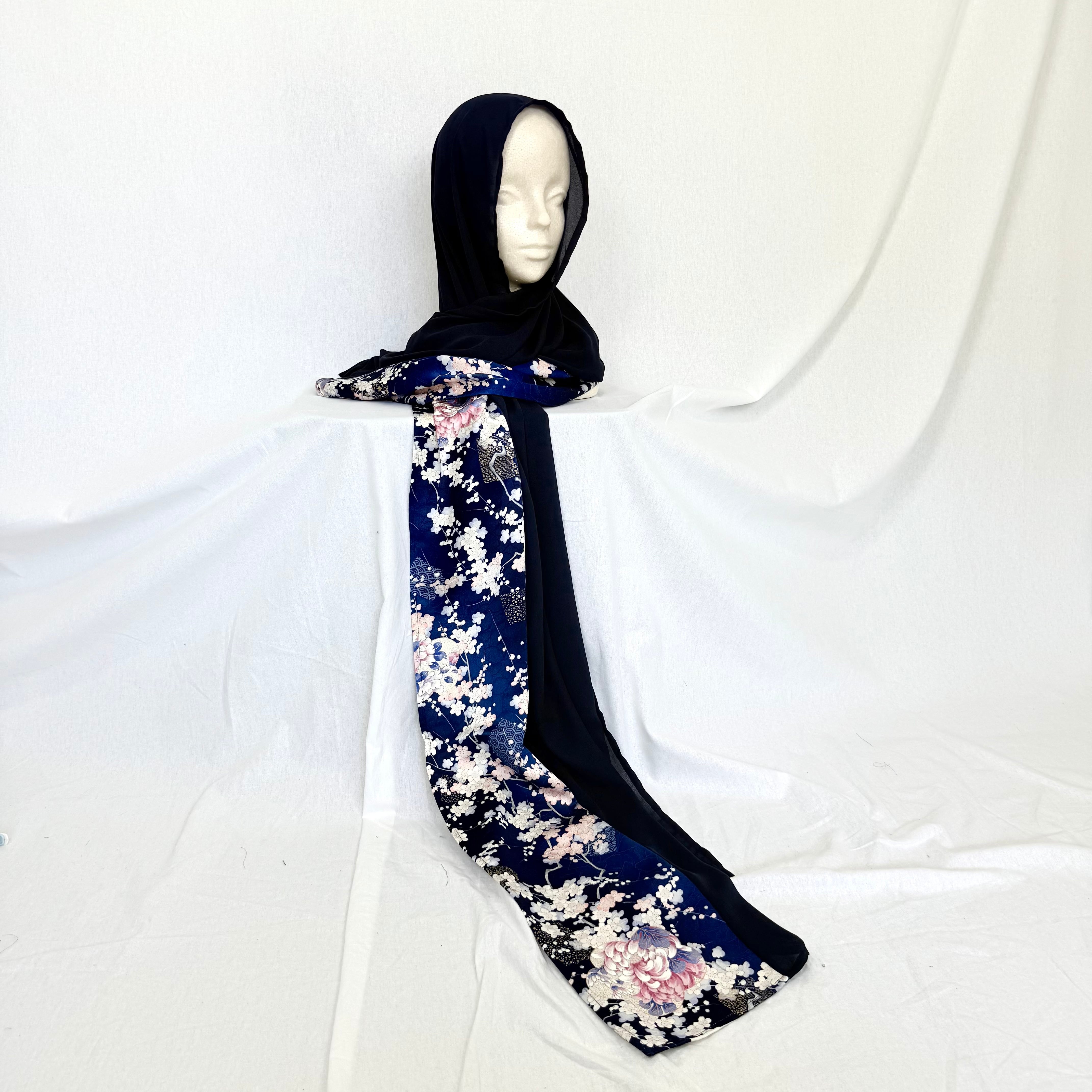 このヒジャブは濃紺の絹生地にピンク色の菊や梅が描かれ、金箔が散りばめられた豪華な振袖の着物から作りました。