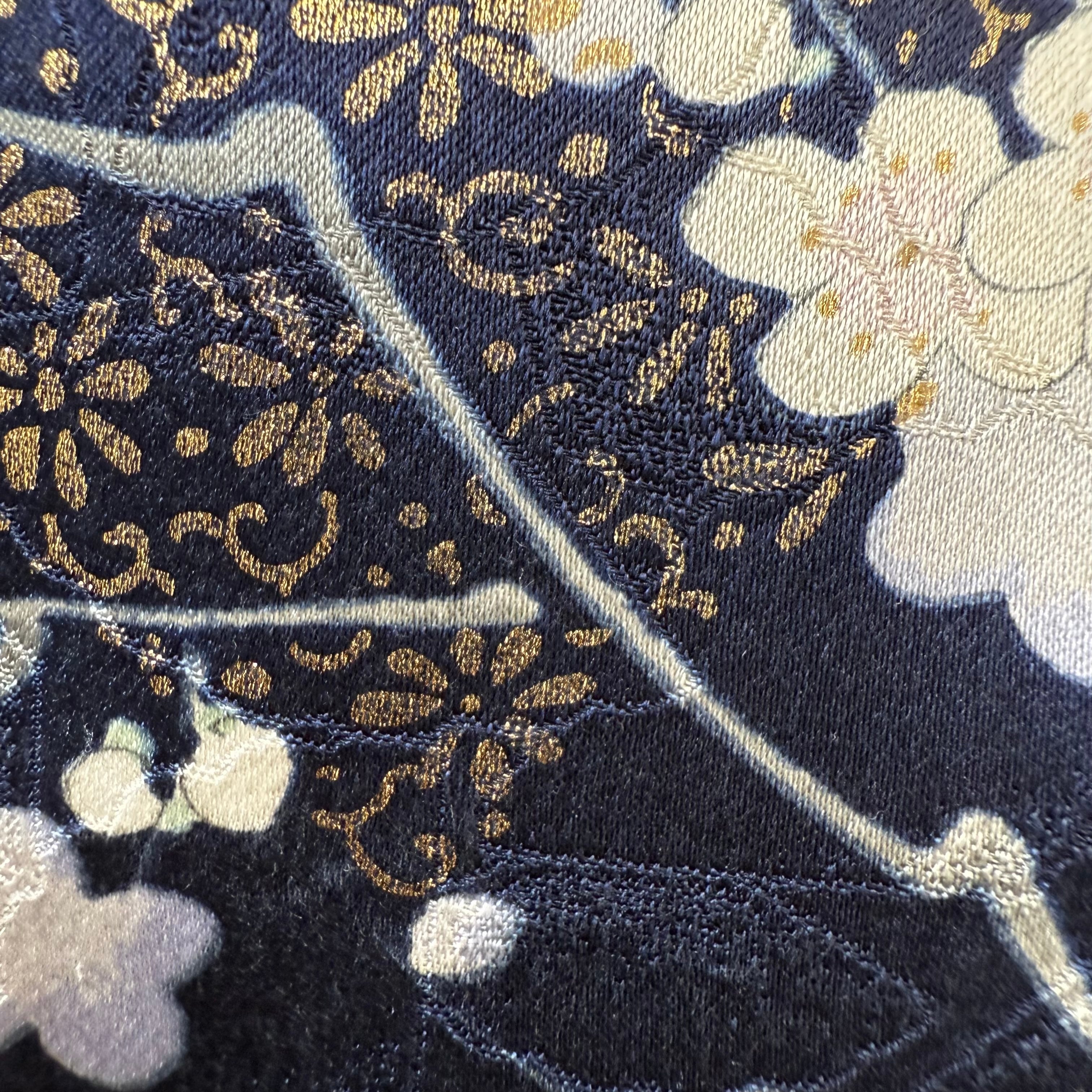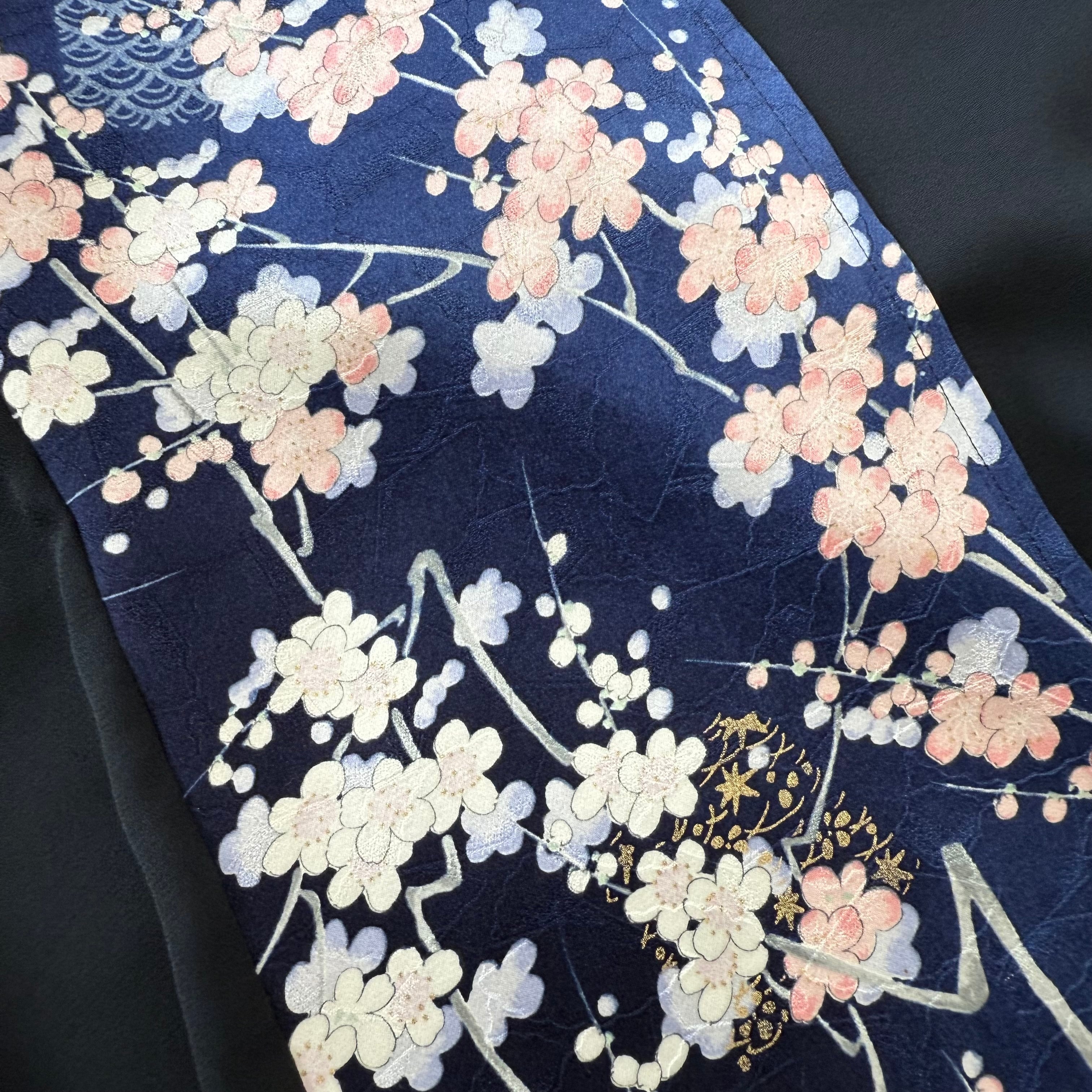 This hijab is made from a luxurious furisode kimono with pink chrysanthemums and plums on a dark blue silk fabric and sprinkled with gold leaf.